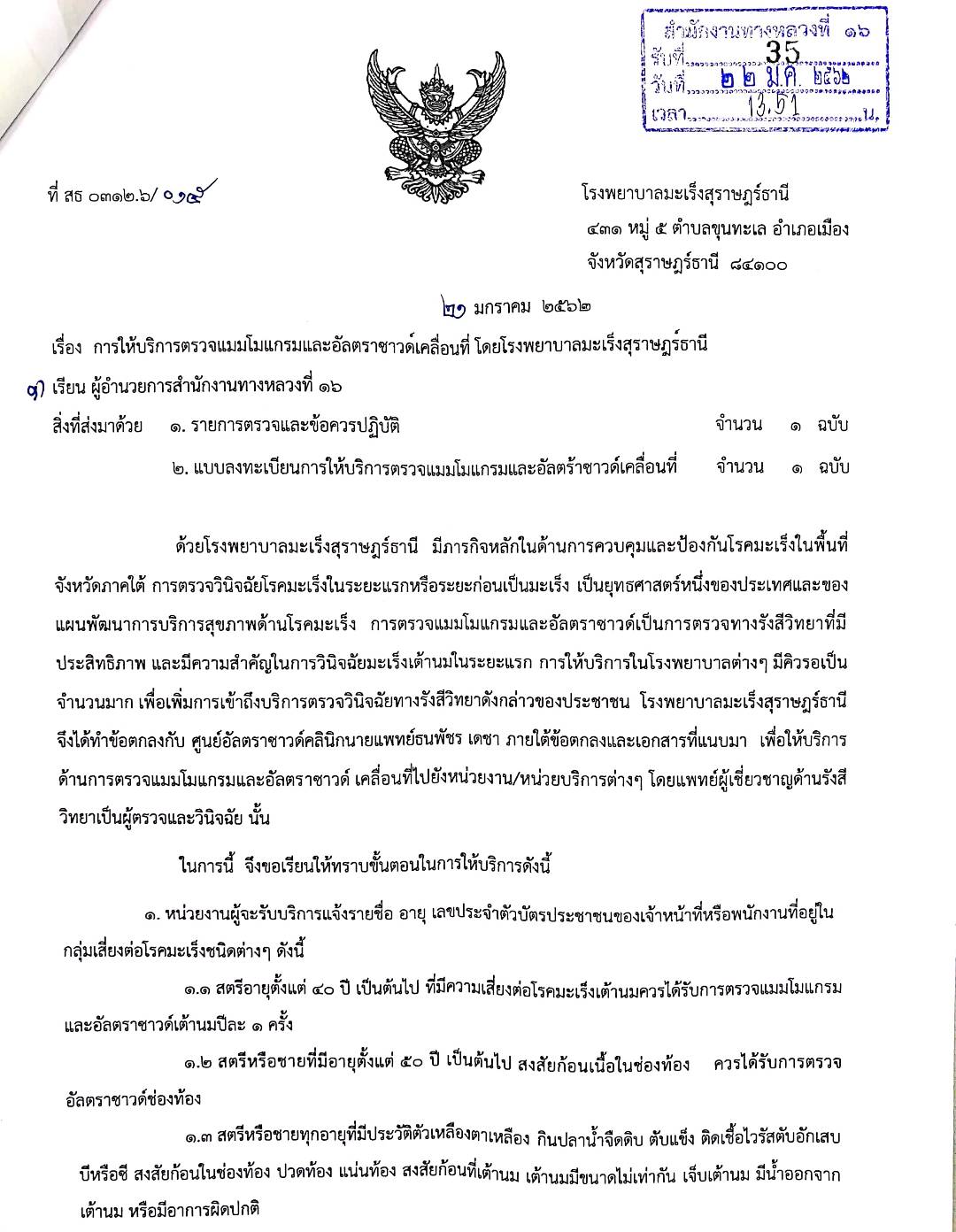 โรงพยาบาลมะเร็งสุราษฎร์ธานี จะเข้ามาให้บริการตรวจอัลตร้าซาวน์เคลื่อนที่ ในวันที่ 30 มกราคม 2562