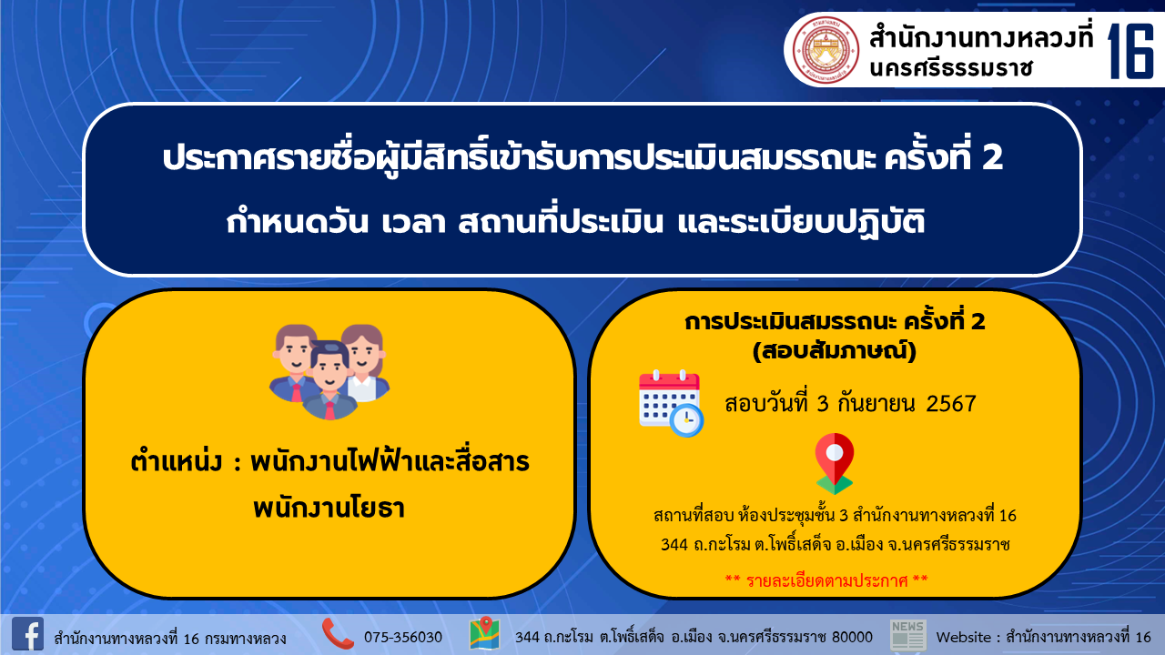 สถานที่สอบ : ห้องประชุมชั้น 3 สำนักงานทางหลวงที่ 16 344 ถ.กะโรม ต.โพธิ์เสด็จ อ.เมือง จ.นครศรีธรรมราช 80000