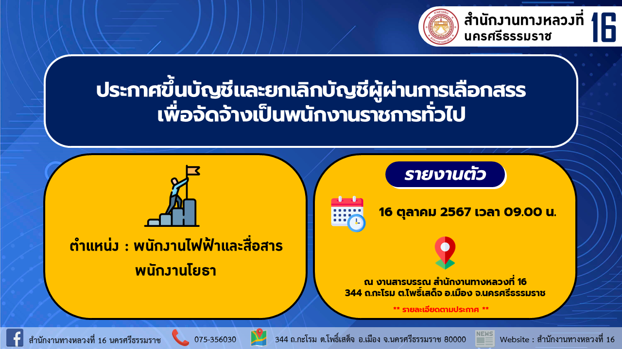 ให้ไปรายงานตัวเพื่อรวบรวมเอกสารประกอบการจัดจ้างเป็นพนักงานราชการทั่วไป ในวันที่ 16 ตุลาคม 2567 เวลา 09.00 น. ณ งานสารบรรณ สำนักงานทางหลวงที่ 16