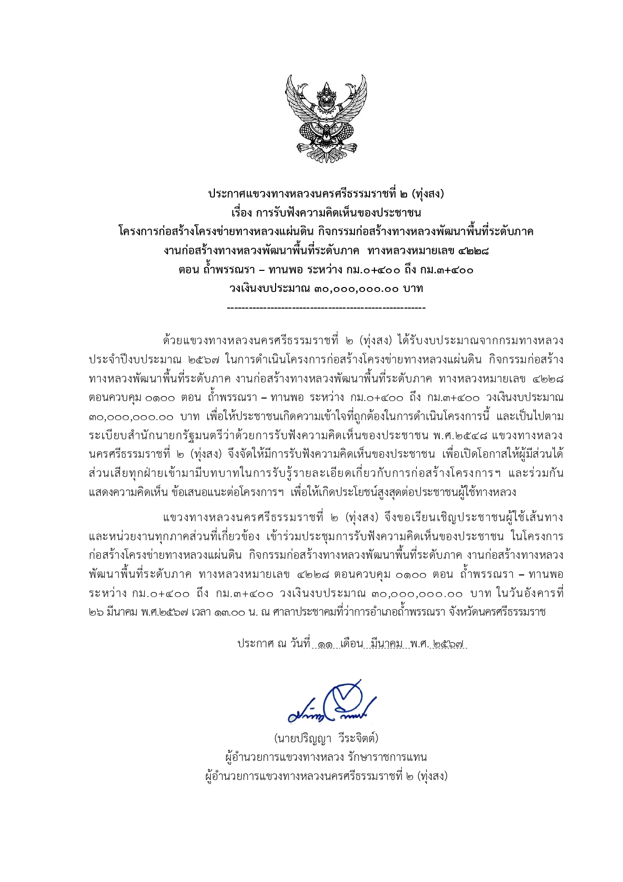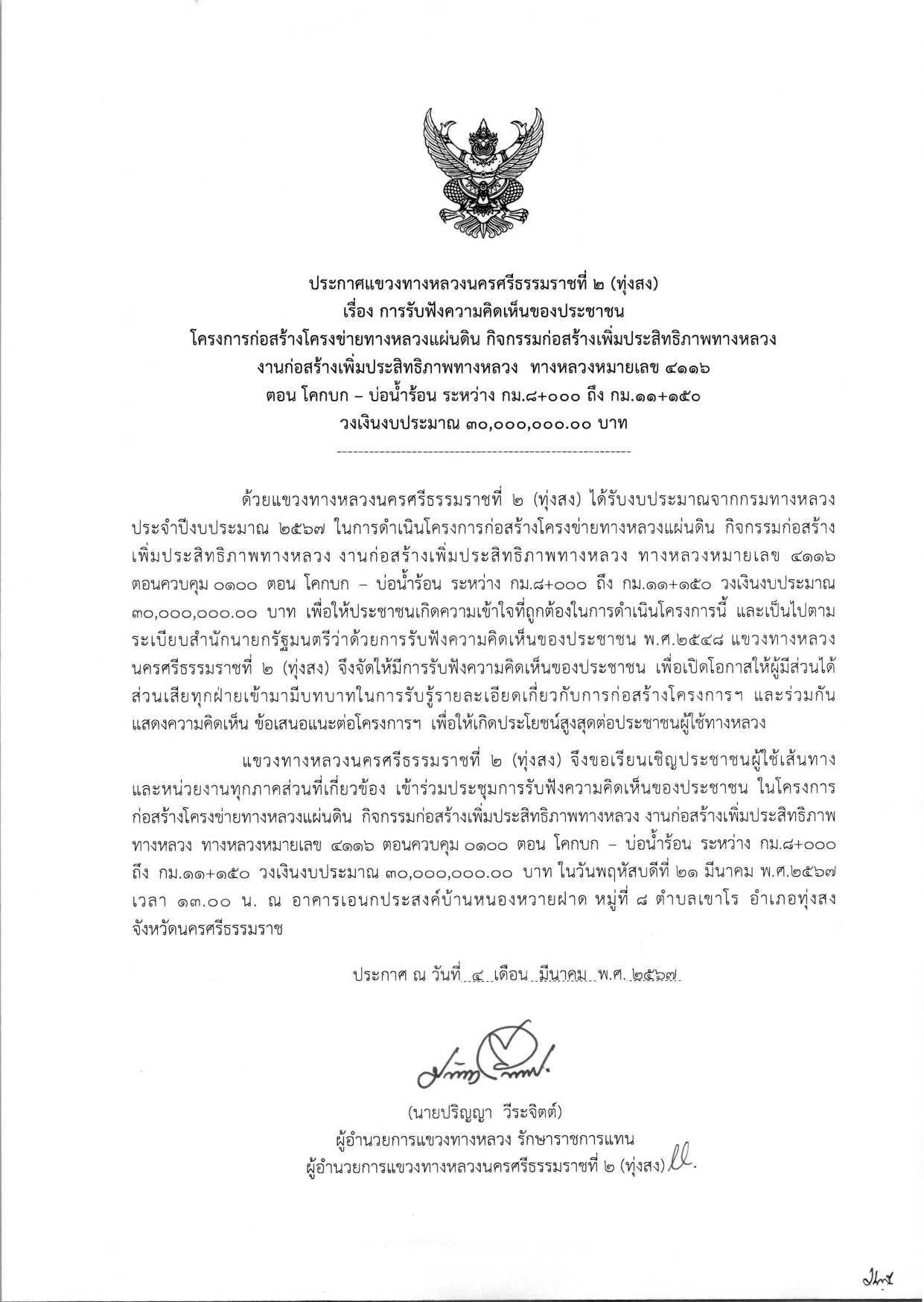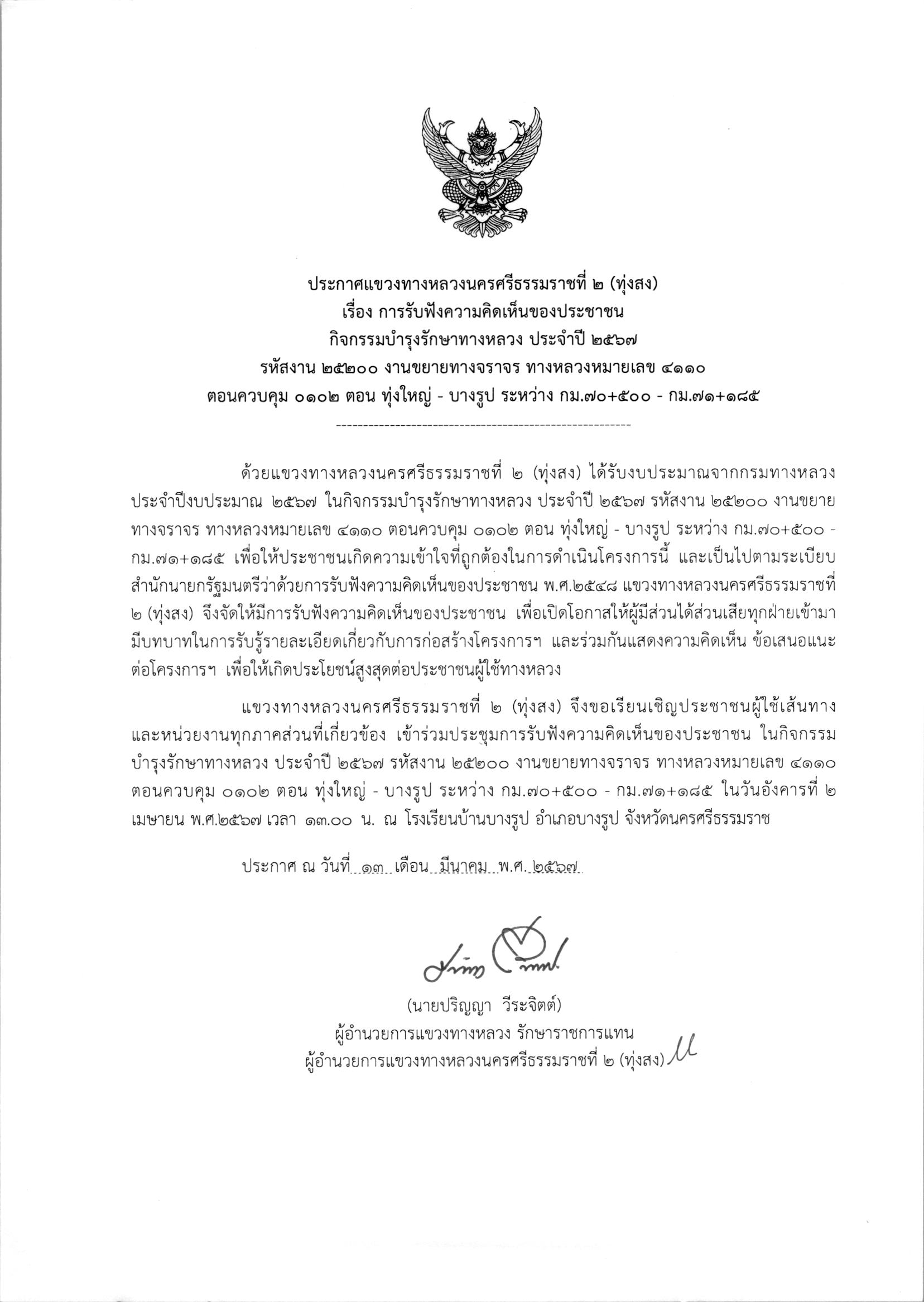 การรับฟังความคิดเห็นของประชาชน ในกิจกรรมบำรุงรักษาทางหลวง ประจำปี 2567 รหัสงาน 25200 งานงานขยายทางจราจร ทางหลวงหมายเลข 4110 ตอนควบคุม 0101 ตอน ทุ่งสง - ทุ่งใหญ่ ระหว่าง กม.20+700 - กม.22+425