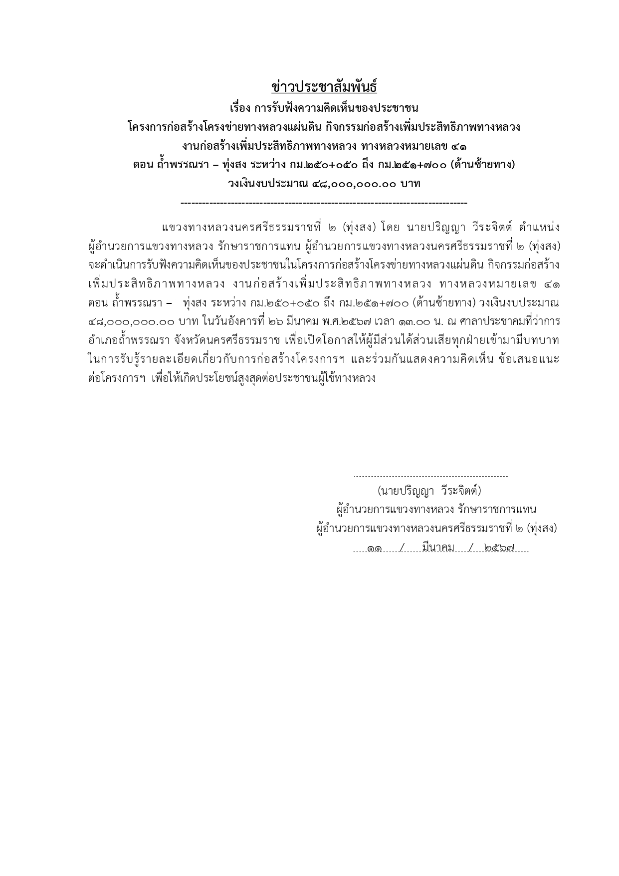 รับฟังความคิดเห็นของประชาชนในโครงการก่อสร้างโครงข่ายทางหลวงแผ่นดิน กิจกรรมก่อสร้าง เพิ่มประสิทธิภาพทางหลวง งานก่อสร้างเพิ่มประสิทธิภาพทางหลวง ทางหลวงหมายเลข 41 ตอน ถ้ำพรรณรา – ทุ่งสง ระหว่าง กม.250+050 ถึง กม.251+700 (ด้านซ้ายทาง) วงเงินงบประมาณ 48,000,000.00 บาท