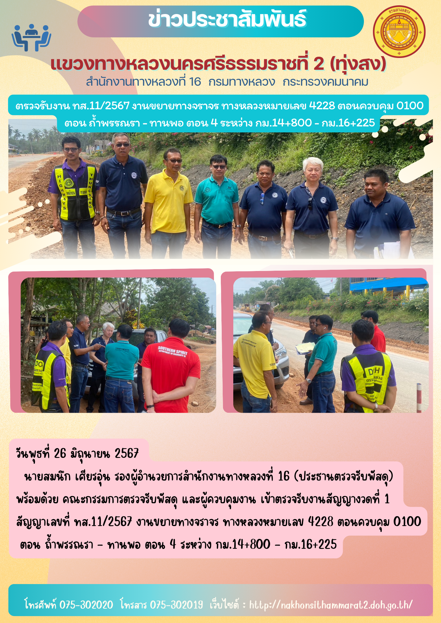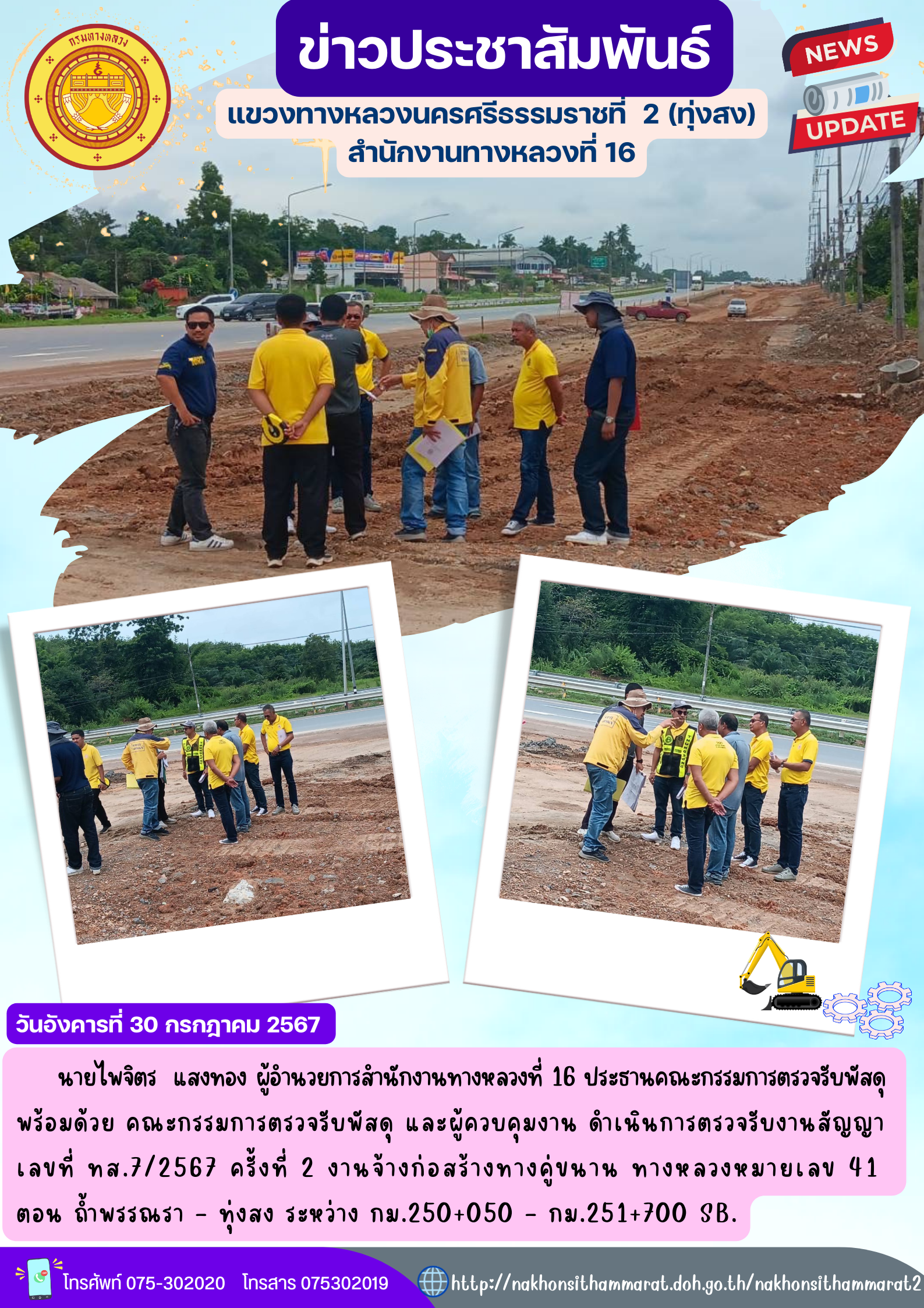 67 30/07/2567 ตรวจรับงานสัญญาเลขที่ ทส.7/2567 ครั้งที่ 2 งานก่อสร้างทางคู่ขนาน ทางหลวงหมายเลข 41 ตอน ถ้ำพรรณรา - ทุ่งสง ระหว่าง กม.250+050 - กม.251+700 SB