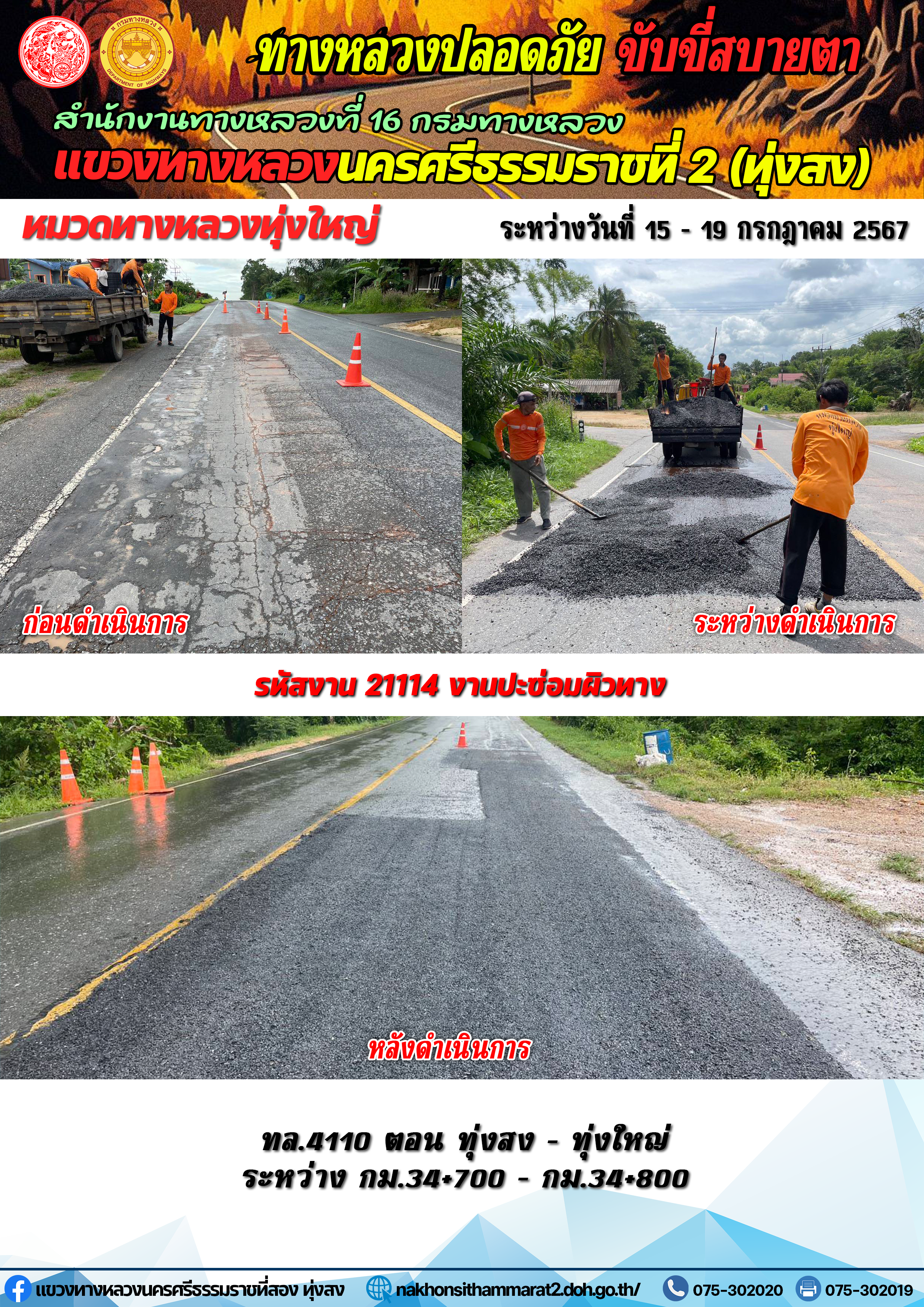 73 19/07/2567 ผลการปฏิบัติงานของหมวดทางหลวงและหน่วยงานในสังกัด แขวงทางหลวงนครศรีธรรมราชที่ 2 (ทุ่งสง) ระหว่างวันที่ 15-19 กรกฎาคม พ.ศ.2567