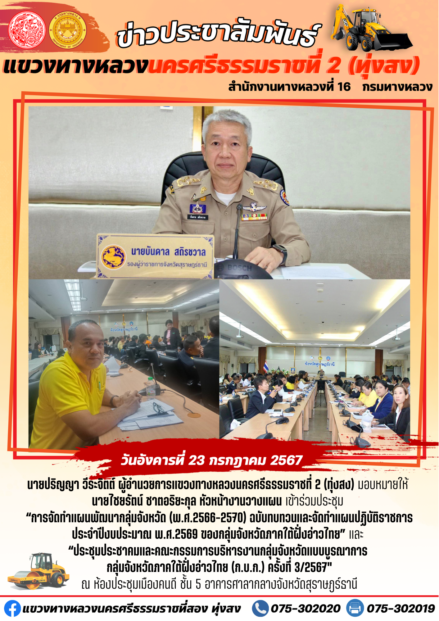 72 23/07/2567 “การจัดทำแผนพัฒนากลุ่มจังหวัด (พ.ศ.2566-2570) ฉบับทบทวนและจัดทำแผนปฏิบัติราชการ ประจำปีงบประมาณ พ.ศ.2569 ของกลุ่มจังหวัดภาคใต้ฝั่งอ่าวไทย” และ “ประชุมประชาคมและคณะกรรมการบริหารงานกลุ่มจังหวัดแบบบูรณาการ กลุ่มจังหวัดภาคใต้ฝั่งอ่าวไทย (ก.บ.ก.) ครั้งที่ 3/2567"