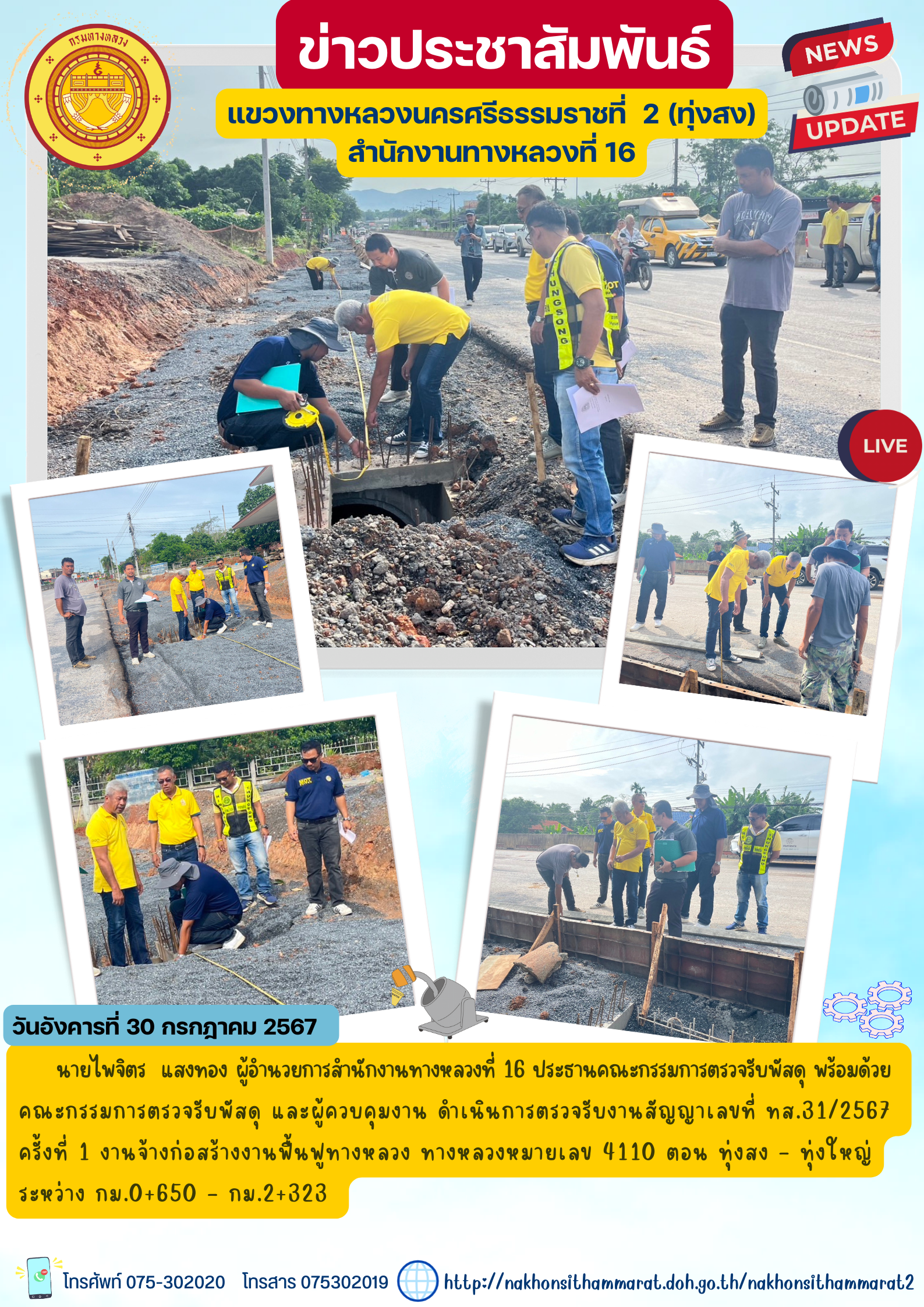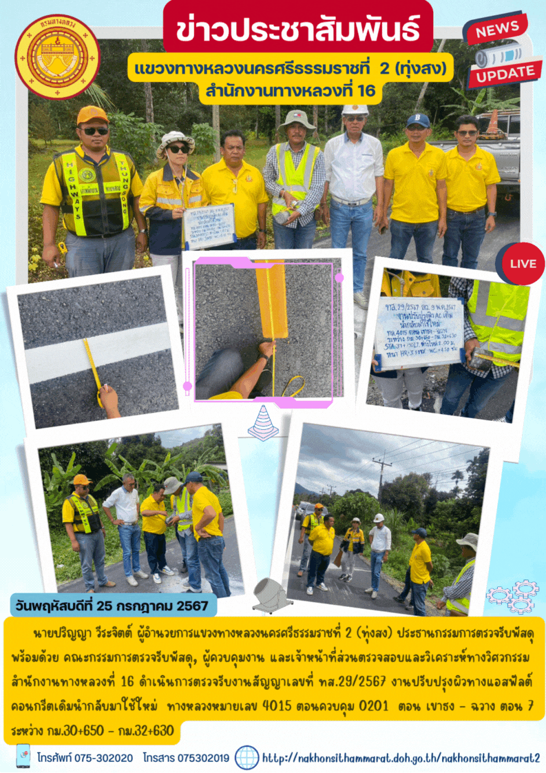 70 26/07/2567 ารตรวจรับงานสัญญาเลขที่ ทส.29/2567 งานปรับปรุงผิวทางแอสฟัลต์คอนกรีตเดิมนำกลับมาใช้ใหม่ ทางหลวงหมายเลข 4015 ตอนควบคุม 0201 ตอน เขาธง - ฉวาง ตอน 7 ระหว่าง กม.30+650 - กม.32+630