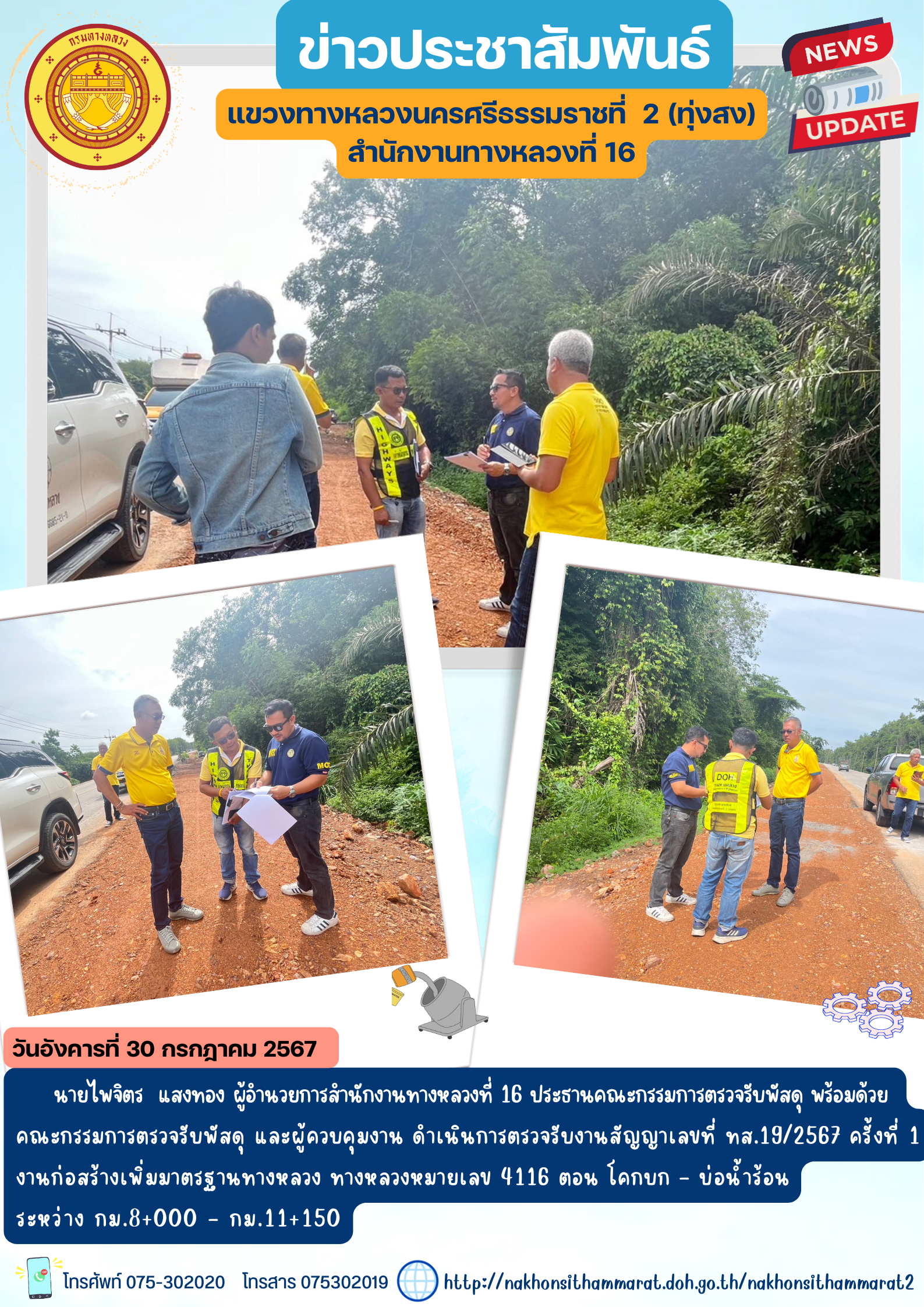 68 30/07/2567 ตรวจรับงานสัญญาเลขที่ ทส.19/2567ครั้งที่ 1 งานก่อสร้างเพิ่มมาตรฐานทางหลวง ทางหลวงหมายเลข 4116 ตอน โคกบก - บ่อน้ำร้อน ระหว่าง กม.8+000 - กม.11+150