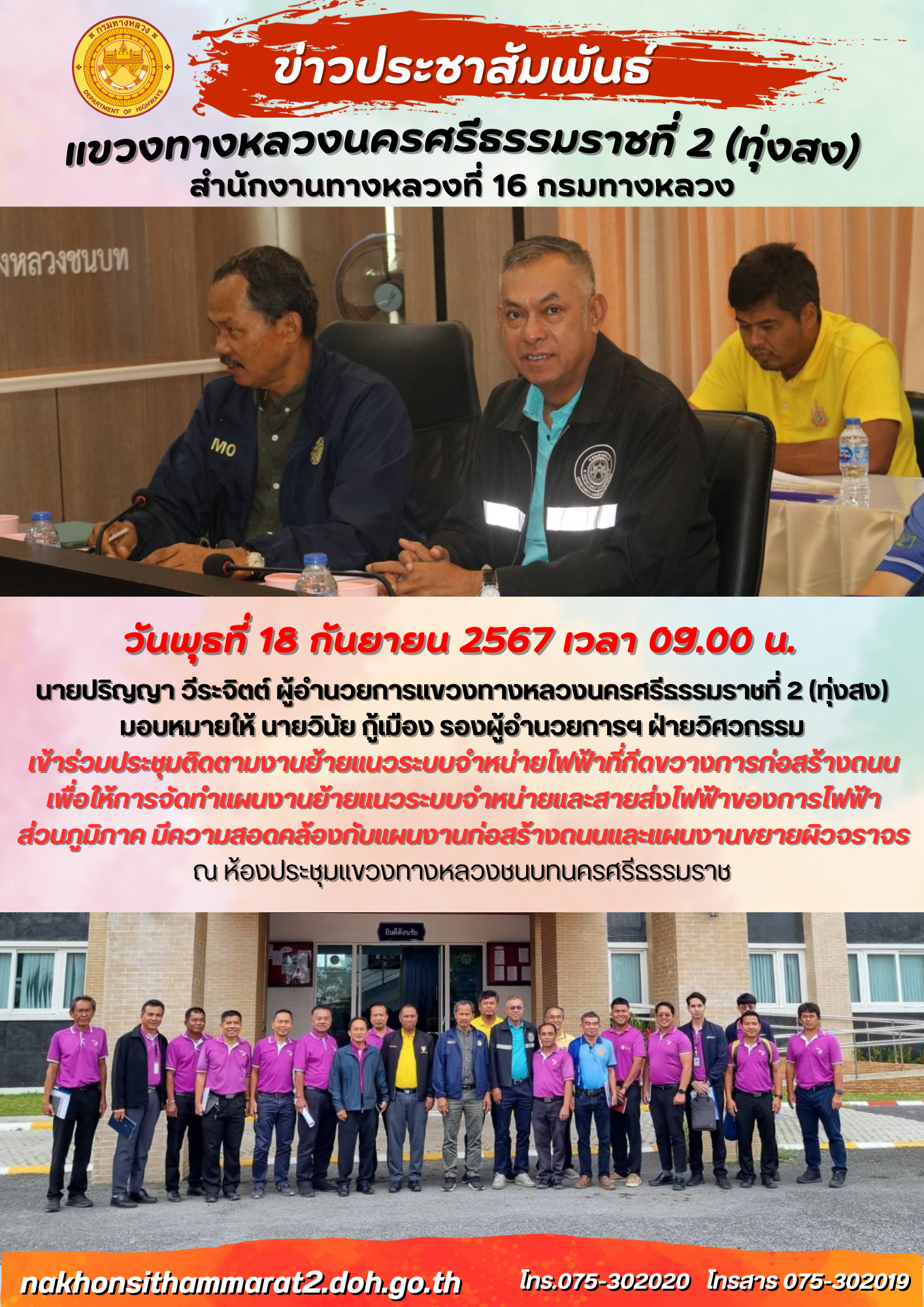 64 18/09/2567 ประชุมติดตามงานย้ายแนวระบบจำหน่ายไฟฟ้าที่กีดขวางการก่อสร้างถนน เพื่อให้การจัดทำแผนงานย้ายแนวระบบจำหน่ายและสายส่งไฟฟ้าของการไฟฟ้า ส่วนภูมิภาค มีความสอดคล้องกับแผนงานก่อสร้างถนนและแผนงานขยายผิวจราจร