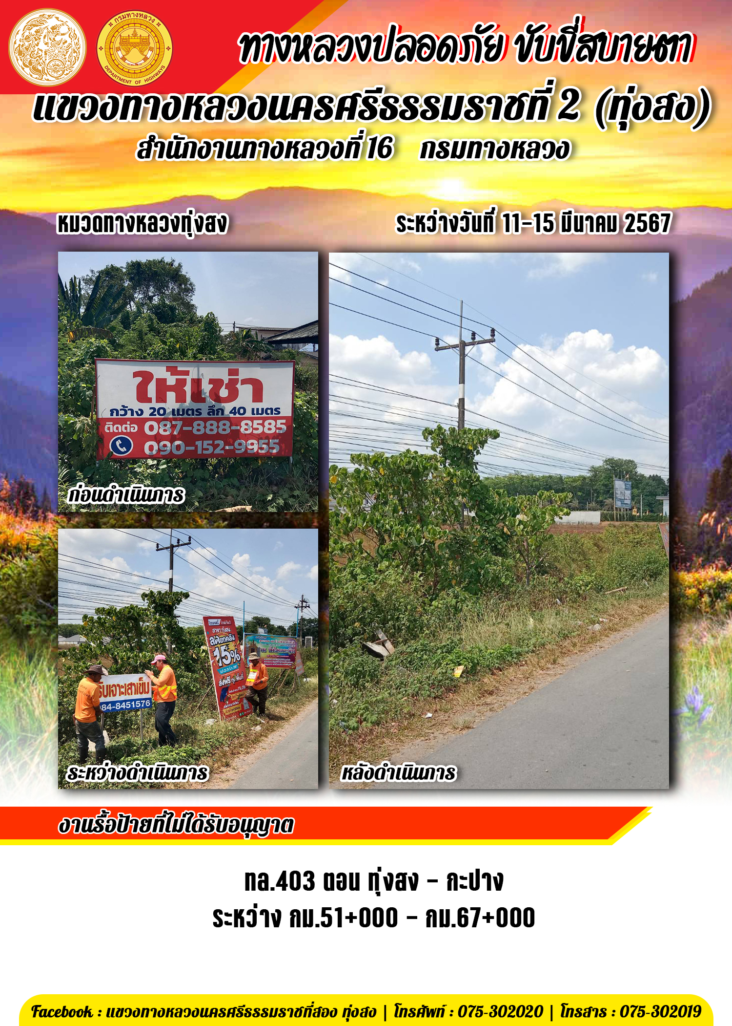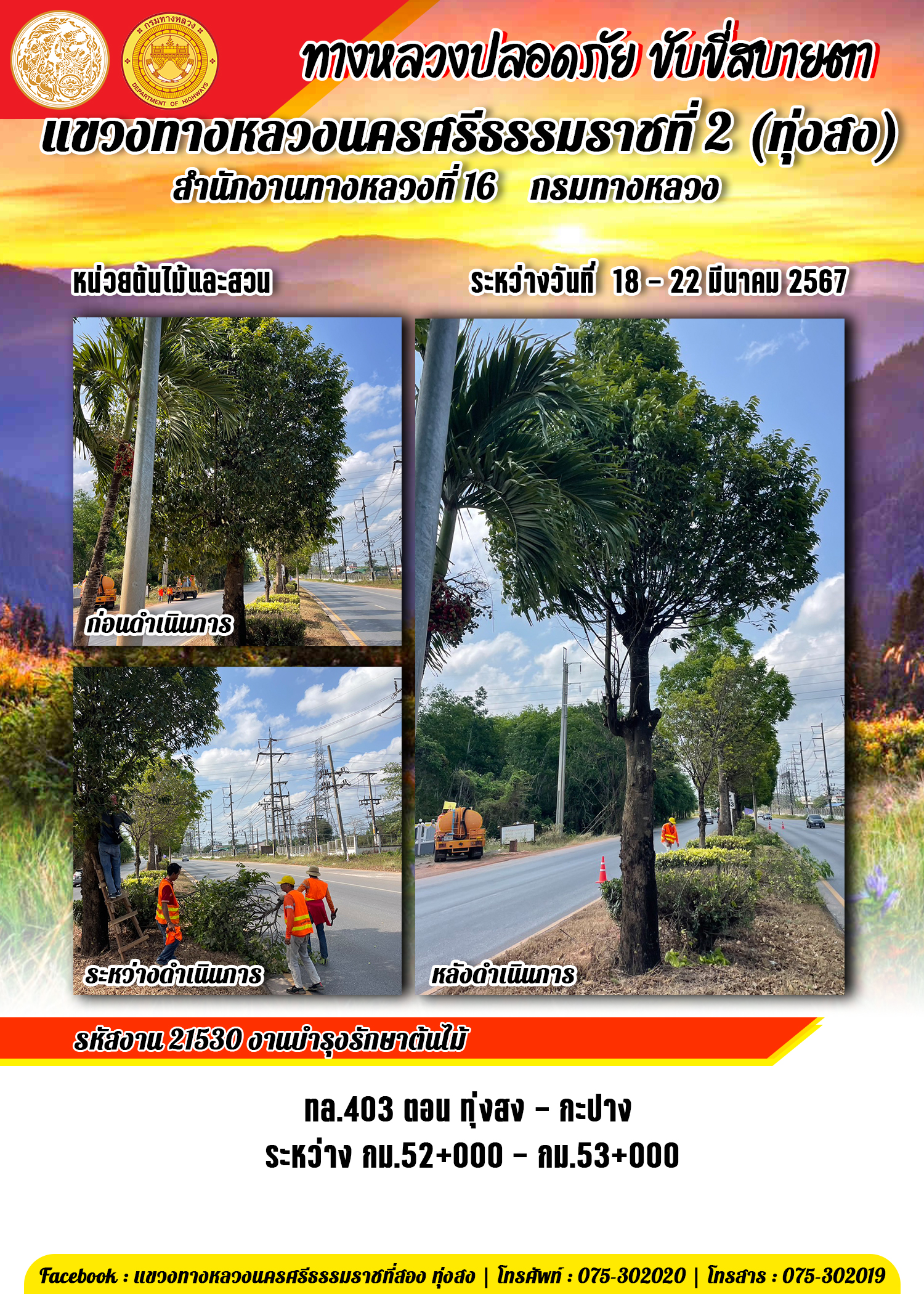 ผลการปฏิบัติงานของหมวดทางหลวงและหน่วยงานในสังกัด แขวงทางหลวงนครศรีธรรมราชที่ 2 (ทุ่งสง) ระหว่างวันที่ 18-22 มีนาคม พ.ศ.2567