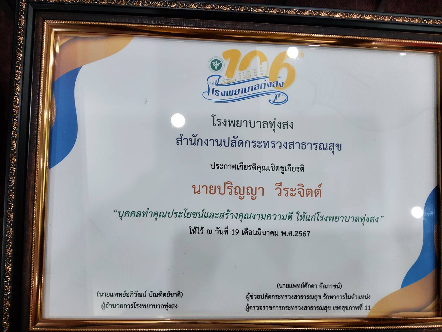 รับประกาศเกียรติคุณเชิดชูเกียรติ องค์กรและบุคคลทำคุณประโยชน์และคุณงามความดีให้แก่โรงพยาบาลทุ่งสง ในโอกาสครบรอบ 106 ปี โรงพยาบาลทุ่งสง