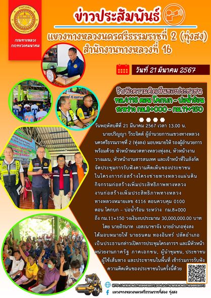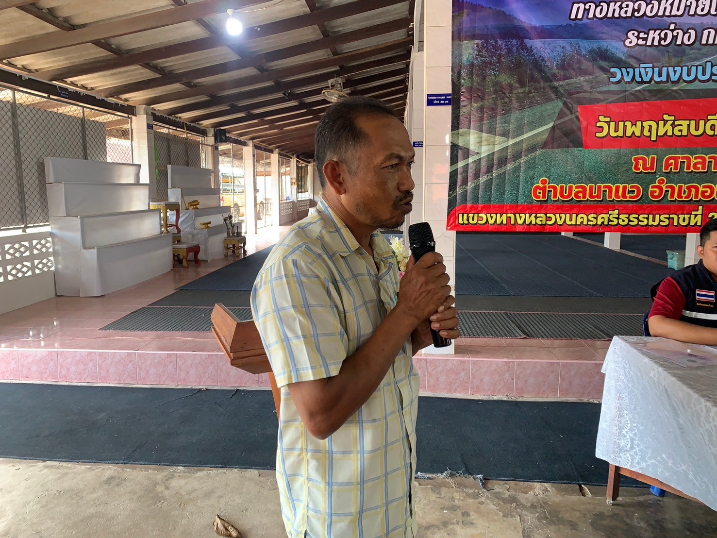 ประชุมการรับฟังความคิดเห็นของประชาชน กิจกรรมบำรุงรักษาทางหลวง ประจำปี 2567 รหัสงาน 27200 งานฟื้นฟูทางหลวง ทางหลวงหมายเลข 4110 ตอนควบคุม 0101 ตอน ทุ่งสง - ทุ่งใหญ่ ระหว่าง กม.0+650 - กม.2+323
