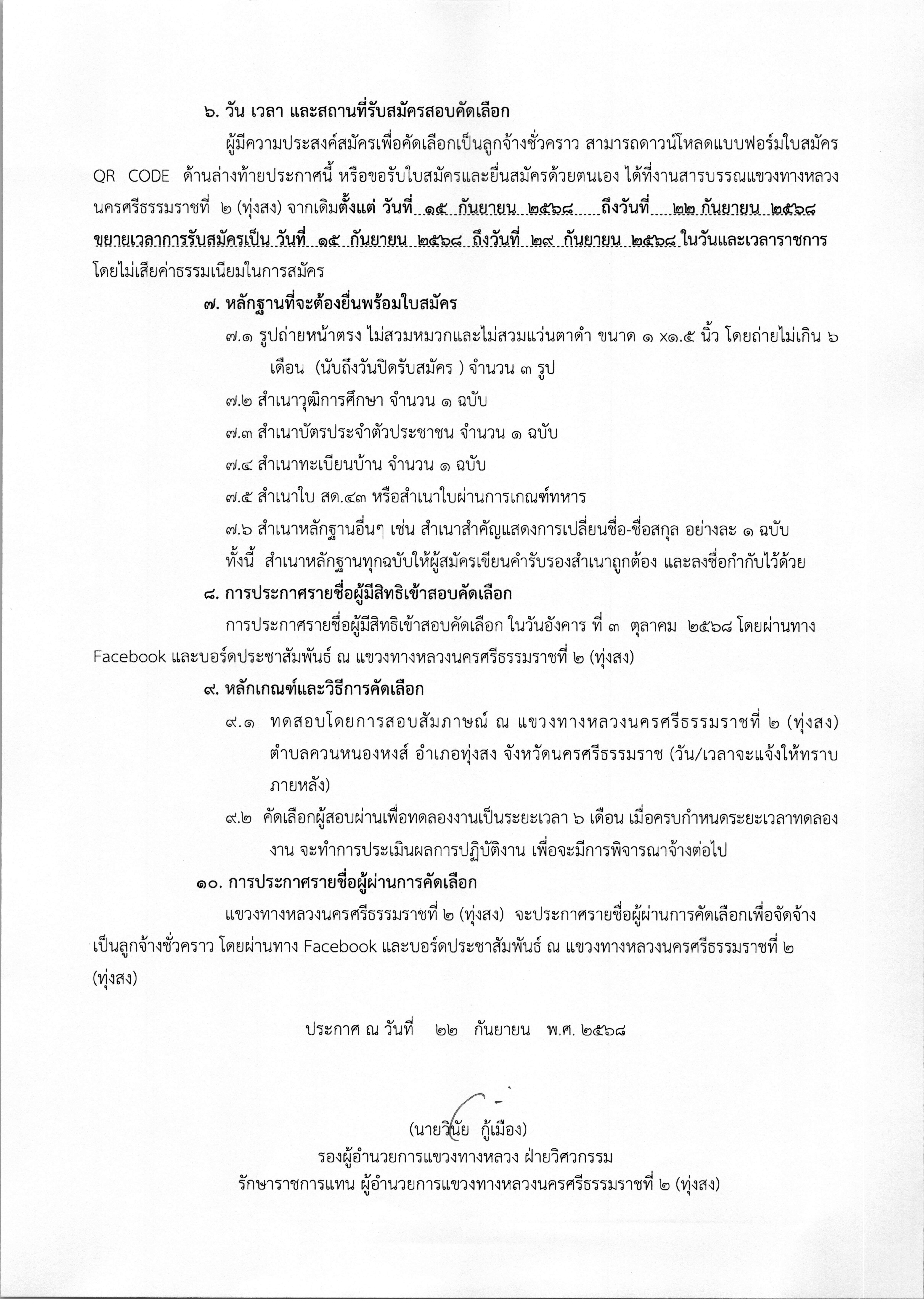 การประกาศรายชื่อผู้มีสิทธิเข้าสอบคัดเลือก ในวันอังคาร ที่ 23 กันยายน 2568 โดยผ่านทาง Facebook และบอร์ดประชาสัมพันธ์ ณ แขวงทางหลวงนครศรีธรรมราชที่ 2 (ทุ่งสง)