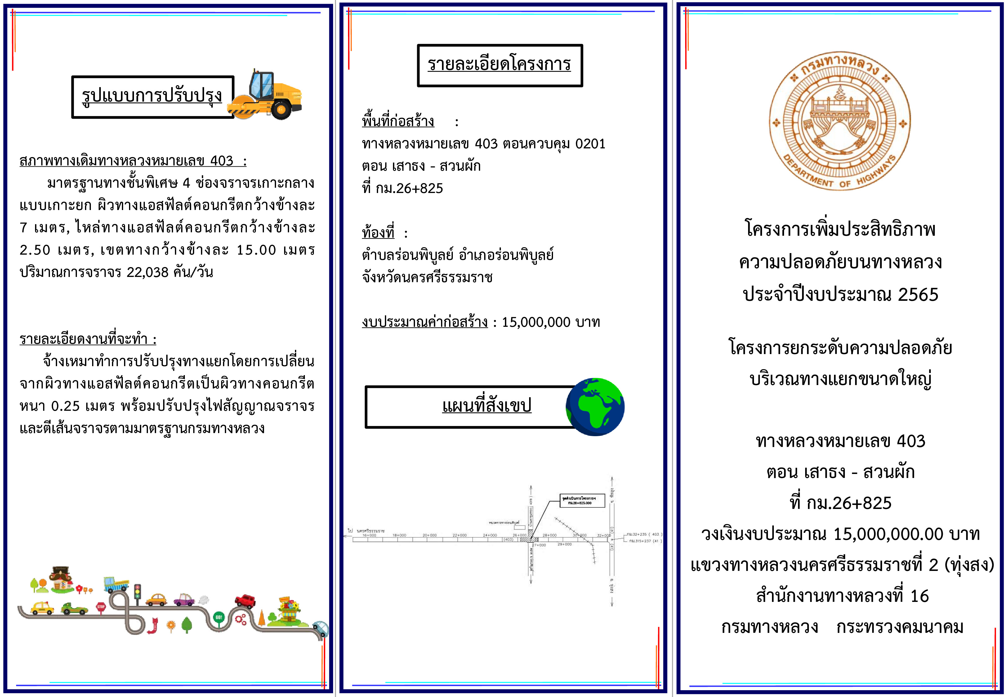 นายอภิชาติ เพชรศรีจันทร์ ตำแหน่ง ผู้อำนวยการแขวงทางหลวง รักษาราชการแทน ผู้อำนวยการแขวงทางหลวงนครศรีธรรมราชที่ 2 (ทุ่งสง) จะดำเนินการ รับฟังความคิดเห็นของประชาชนในโครงการการมีส่วนร่วมของประชาชนทางไปรษณีย์ ระหว่างวันที่ 20 กันยายน 2564 – วันที่ 10 ตุลาคม 2564 โครงการเพิ่มประสิทธิภาพความปลอดภัยบนทางหลวง ประจำปีงบประมาณ 2565 โครงการยกระดับความปลอดภัยบริเวณทางแยกขนาดใหญ่ ทางหลวงหมายเลข 403 ตอน เสาธง - สวนผัก ที่ กม.26+825 วงเงินงบประมาณ 15,000,000.00 บาท ตำบลร่อนพิบูลย์ อำเภอร่อนพิบูลย์ จังหวัดนครศรีธรรมราช เพื่อเปิดโอกาสให้ผู้มีส่วนได้ส่วนเสียทุกฝ่ายเข้ามามีบทบาทในการรับรู้ แสดงความคิดเห็นอย่างกว้างขวาง และนำข้อมูลที่ได้รับมาใช้ประโยชน์ในโครงการได้อย่างเหมาะสม และเกิดประโยชน์สูงสุดต่อประชาชนบริเวณดังกล่าว