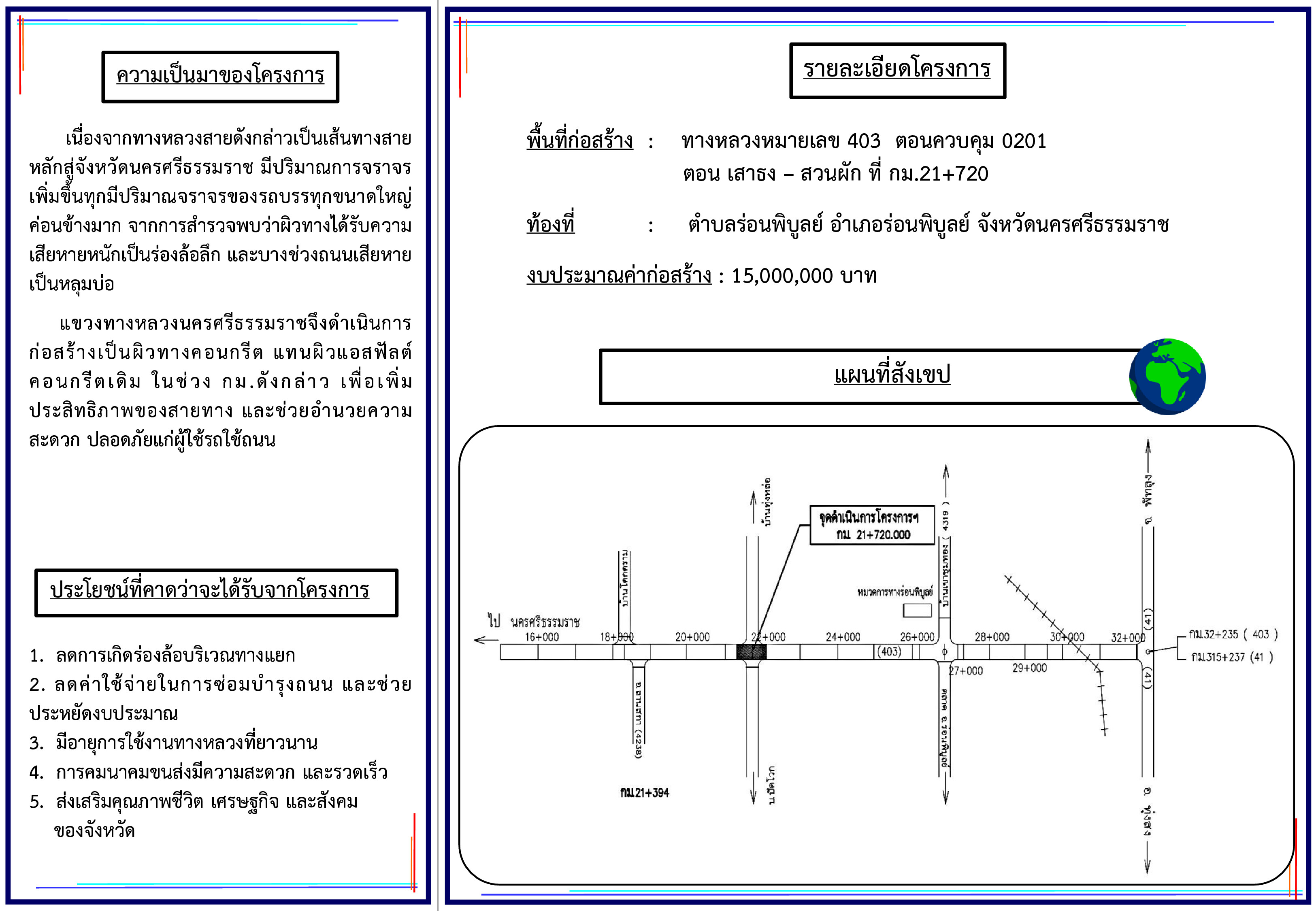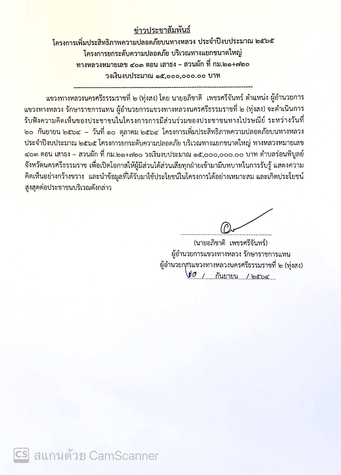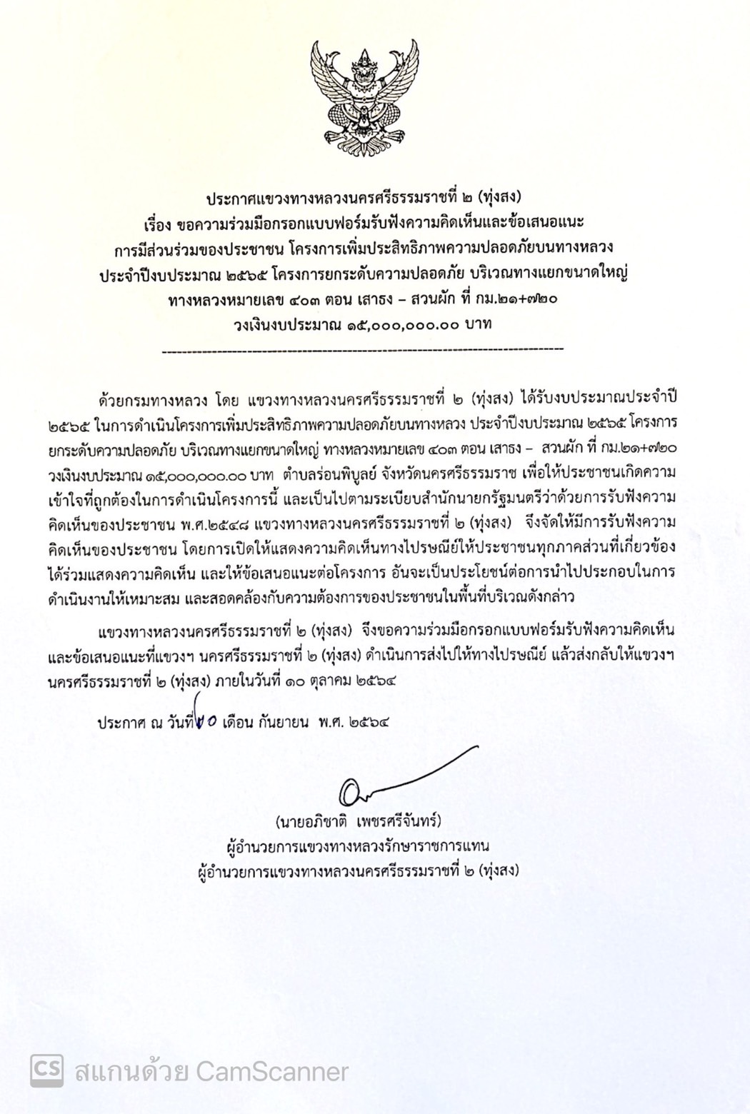 แขวงทางหลวงนครศรีธรรมราชที่ 2 (ทุ่งสง) โดย นายอภิชาติ  เพชรศรีจันทร์ ตำแหน่ง ผู้อำนวยการแขวงทางหลวง รักษาราชการแทน ผู้อำนวยการแขวงทางหลวงนครศรีธรรมราชที่ 2 (ทุ่งสง) จะดำเนินการรับฟังความคิดเห็นของประชาชนในโครงการการมีส่วนร่วมของประชาชนทางไปรษณีย์ ระหว่างวันที่ 20 กันยายน 2564 – วันที่ 10 ตุลาคม 2564 โครงการเพิ่มประสิทธิภาพความปลอดภัยบนทางหลวง ประจำปีงบประมาณ 2565 โครงการยกระดับความปลอดภัย บริเวณทางแยกขนาดใหญ่ ทางหลวงหมายเลข 403 ตอน เสาธง – สวนผัก ที่ กม.21+720 วงเงินงบประมาณ 15,000,000.00 บาท ตำบลร่อนพิบูลย์ จังหวัดนครศรีธรรมราช เพื่อเปิดโอกาสให้ผู้มีส่วนได้ส่วนเสียทุกฝ่ายเข้ามามีบทบาทในการรับรู้ แสดงความคิดเห็นอย่างกว้างขวาง  และนำข้อมูลที่ได้รับมาใช้ประโยชน์ในโครงการได้อย่างเหมาะสม และเกิดประโยชน์สูงสุดต่อประชาชนบริเวณดังกล่าว