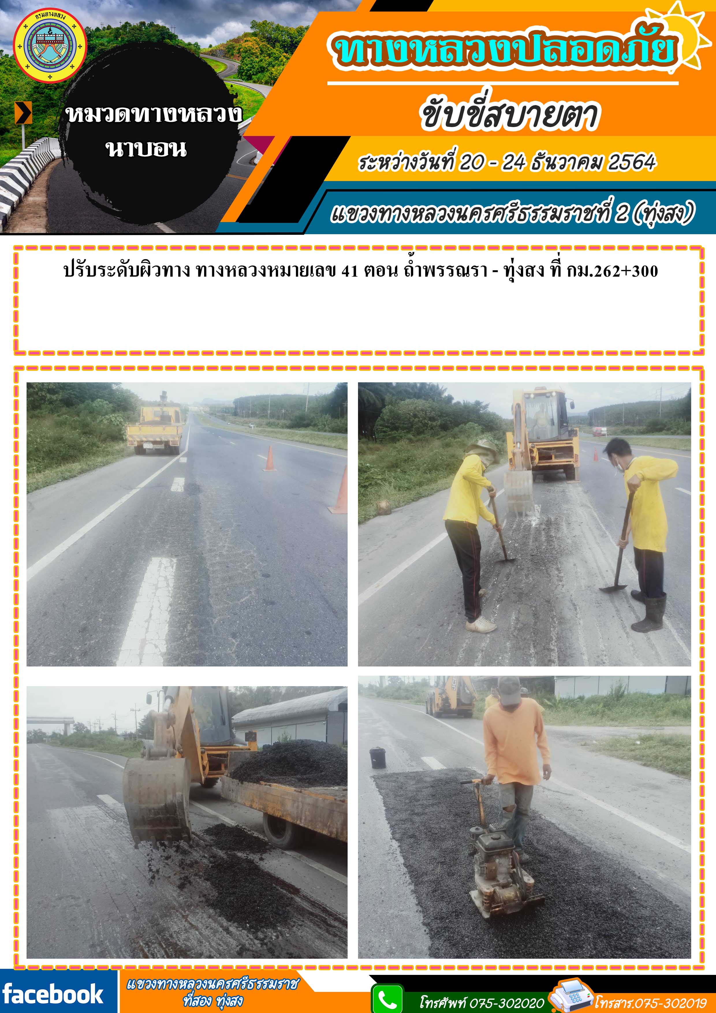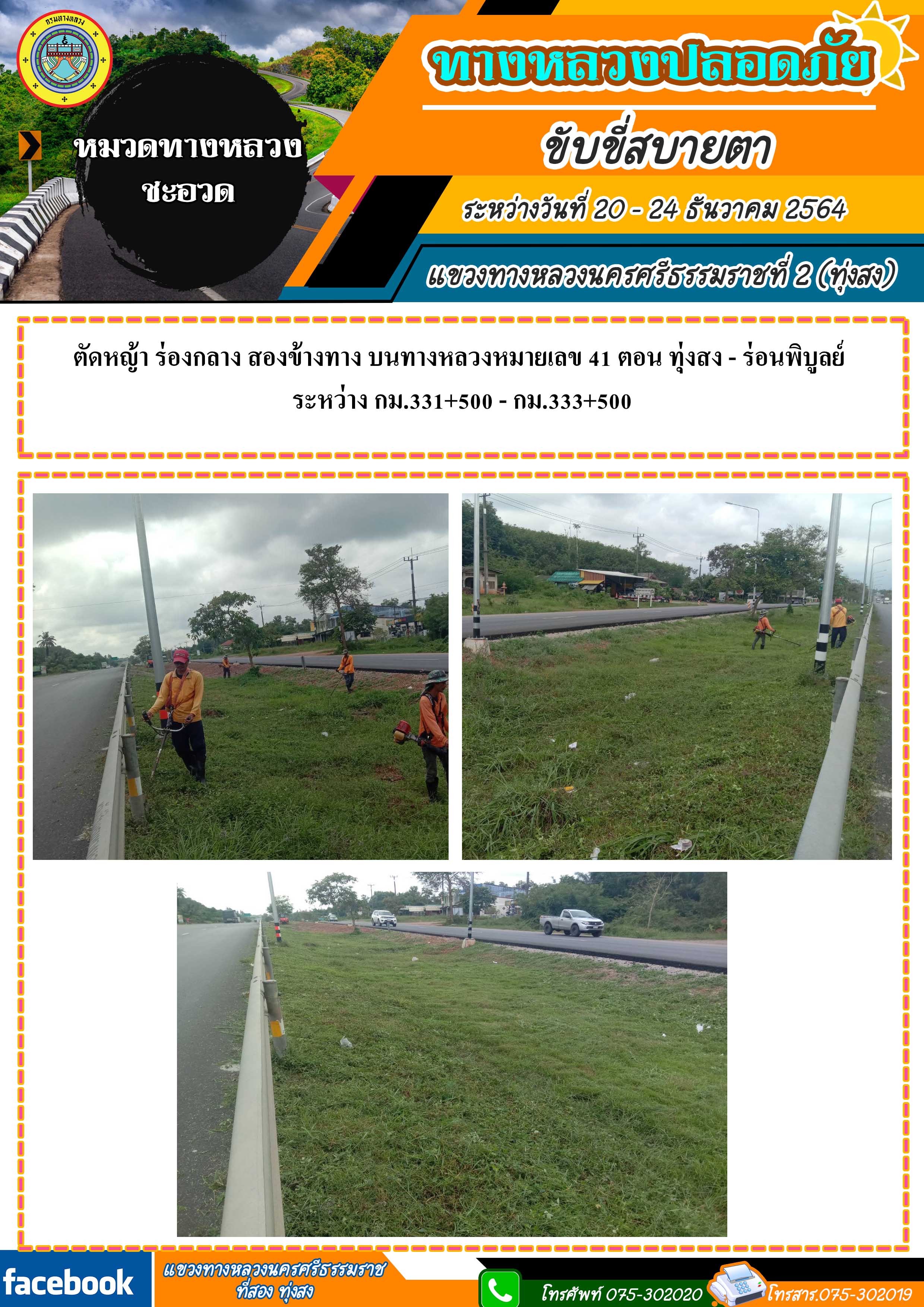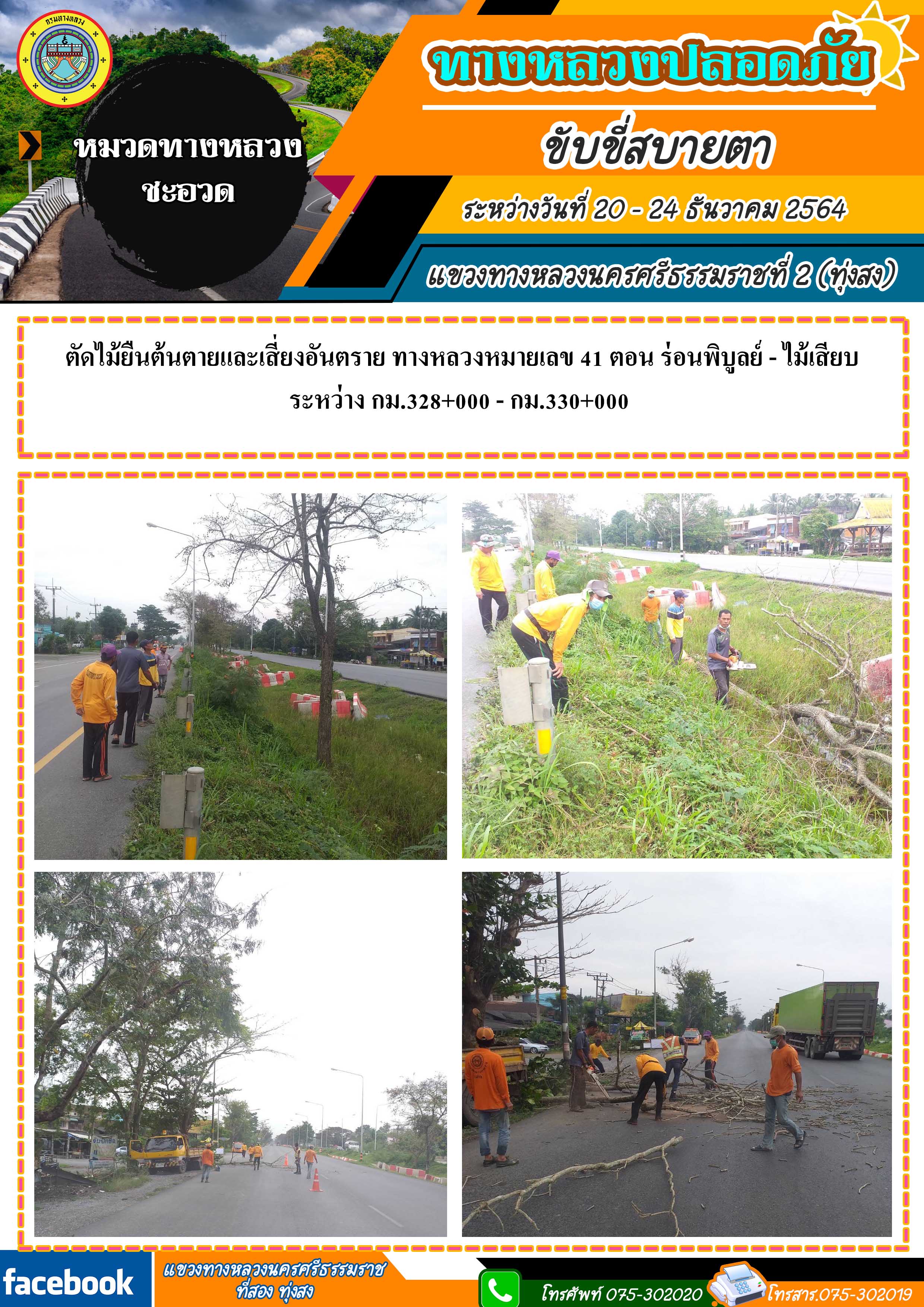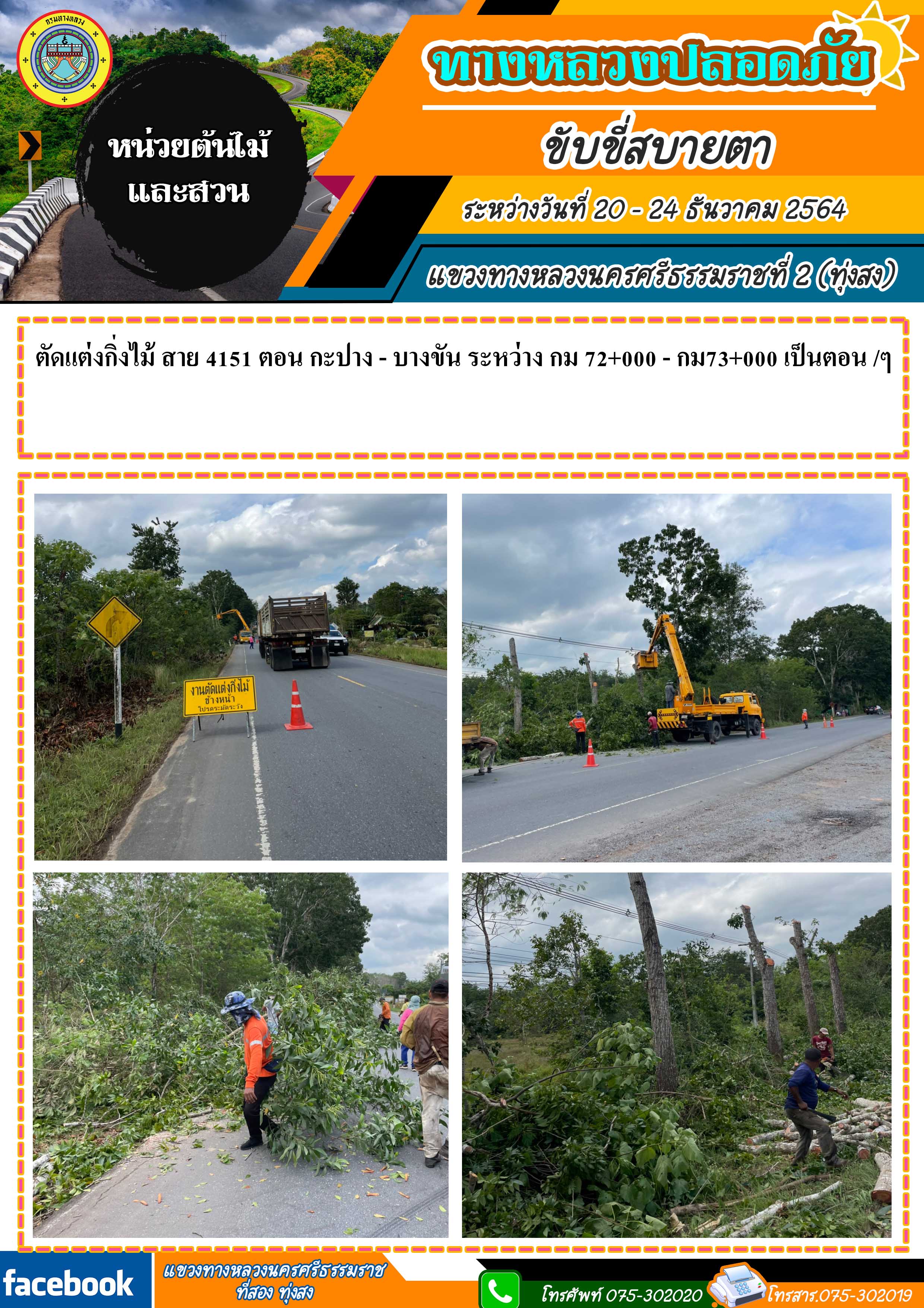 ทางหลวงปลอดภัย ขับขี่สบายตา ผลการปฏิบัติงานประจำสัปดาห์ของแขวงทางหลวงนครศรีธรรมราชที่ 2 (ทุ่งสง) ระหว่างวันที่ 20 - 24 ธันวาคม 2564 โดยหมวดทางหลวงและหน่วยงานในสังกัด