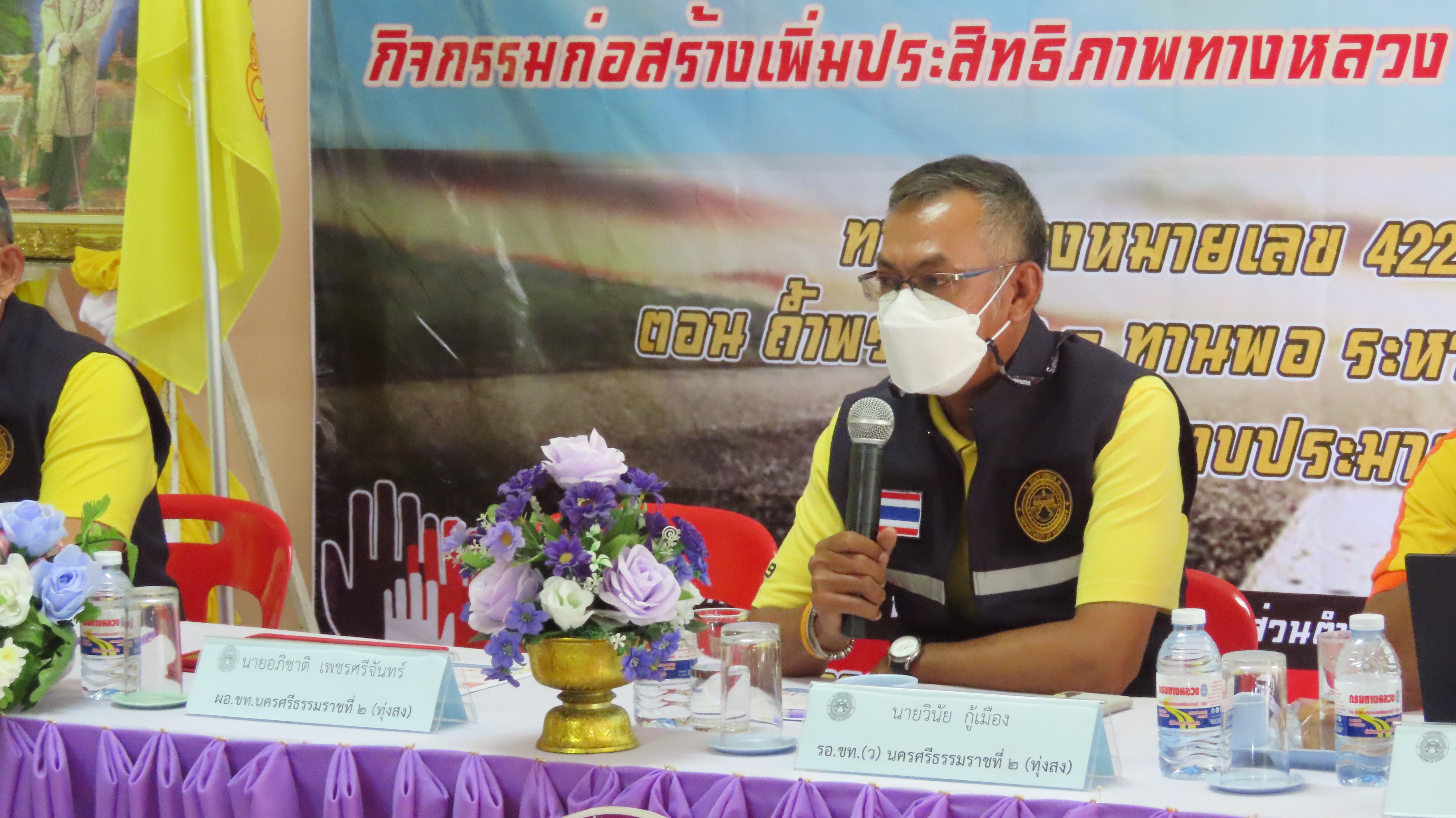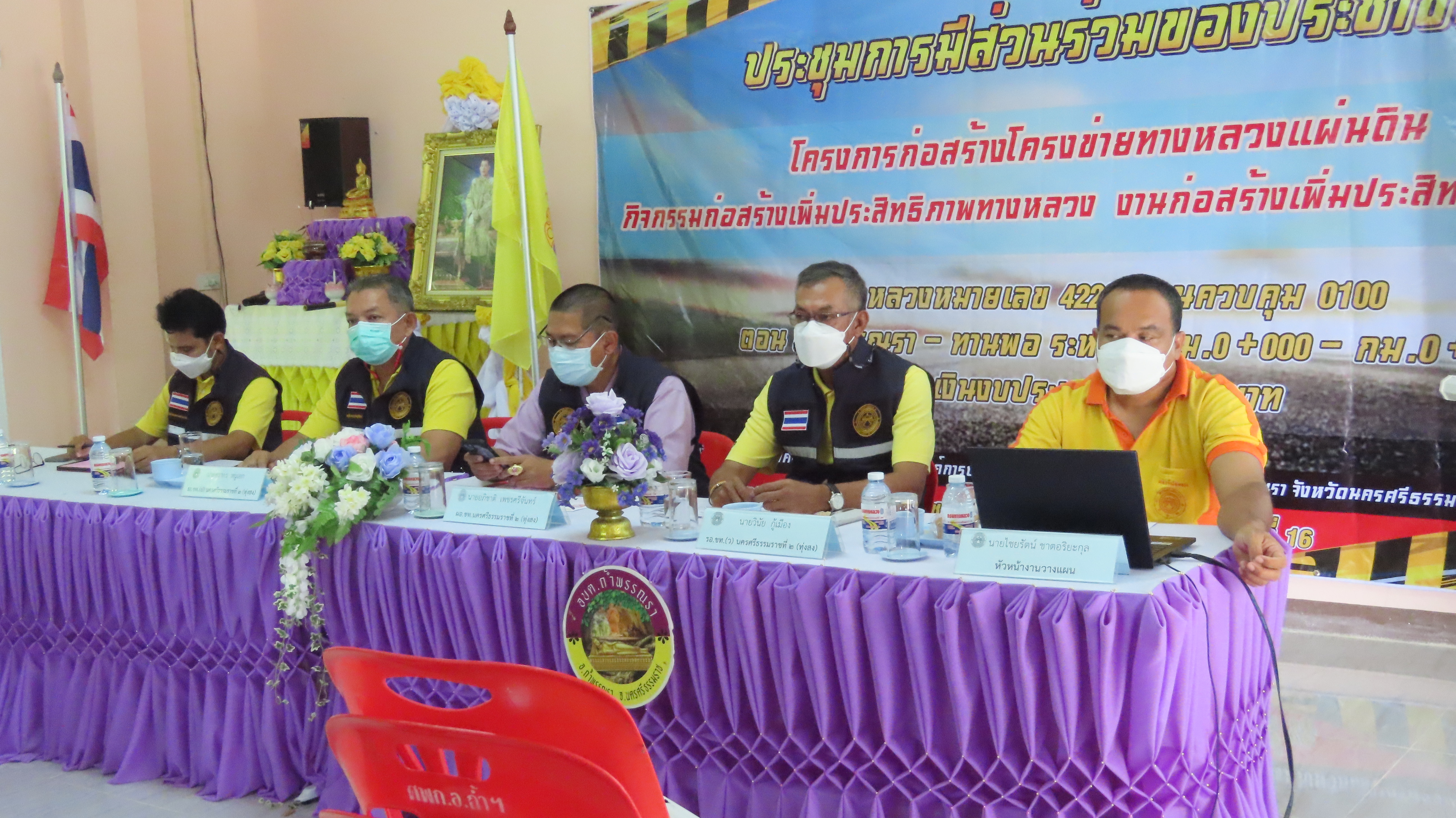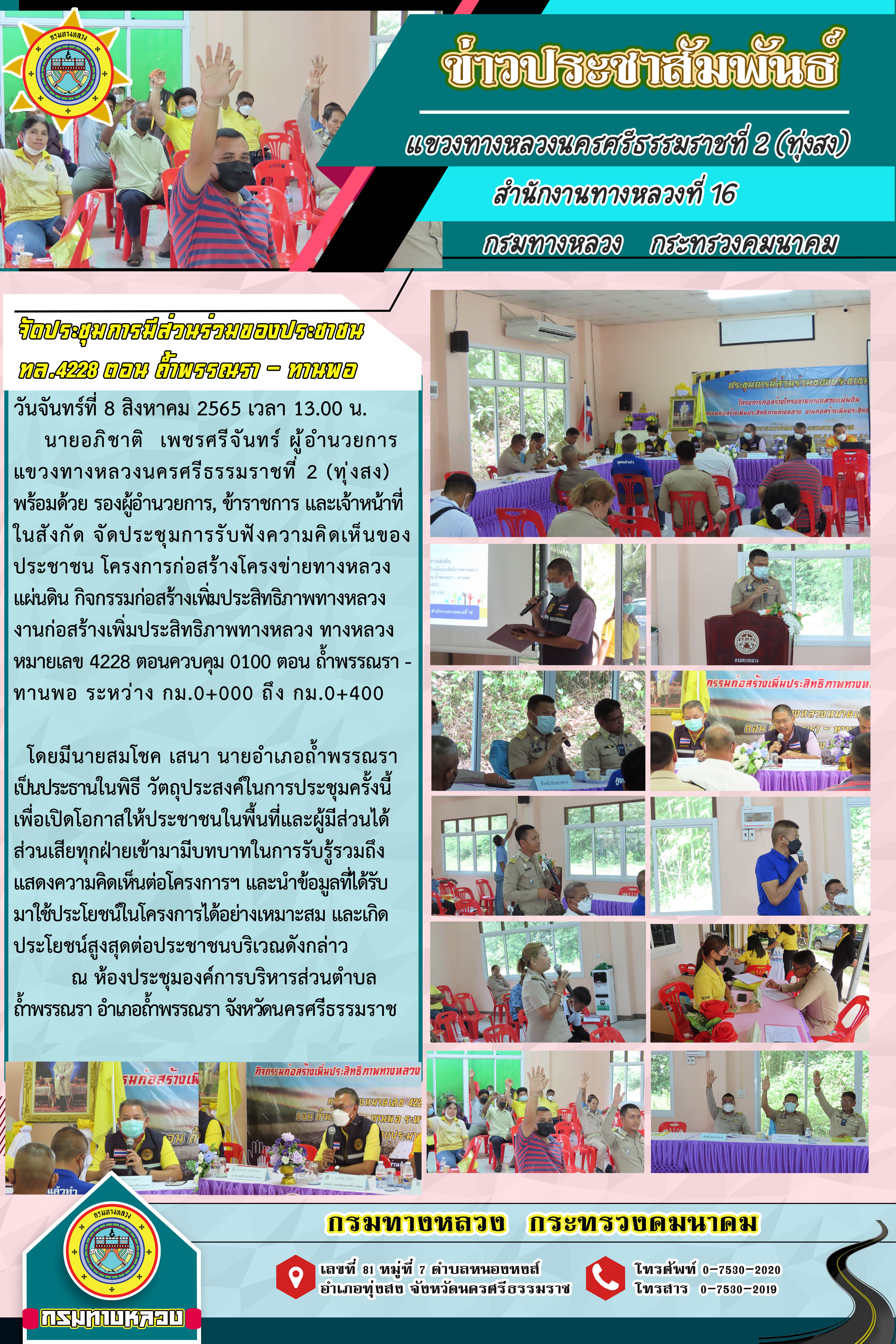 วันจันทร์ที่ 8 สิงหาคม 2565 เวลา 13.00 น. นายอภิชาติ เพชรศรีจันทร์ ผู้อำนวยการแขวงทางหลวงนครศรีธรรมราชที่ 2 (ทุ่งสง) พร้อมด้วย รองผู้อำนวยการ, ข้าราชการ และเจ้าหน้าที่ในสังกัด จัดประชุมการรับฟังความคิดเห็นของประชาชน โครงการก่อสร้างโครงข่ายทางหลวงแผ่นดิน กิจกรรมก่อสร้างเพิ่มประสิทธิภาพทางหลวง งานก่อสร้างเพิ่มประสิทธิภาพทางหลวง ทางหลวงหมายเลข 4228 ตอนควบคุม 0100 ตอน ถ้ำพรรณรา - ทานพอ ระหว่าง กม.0+000 ถึง กม.0+400