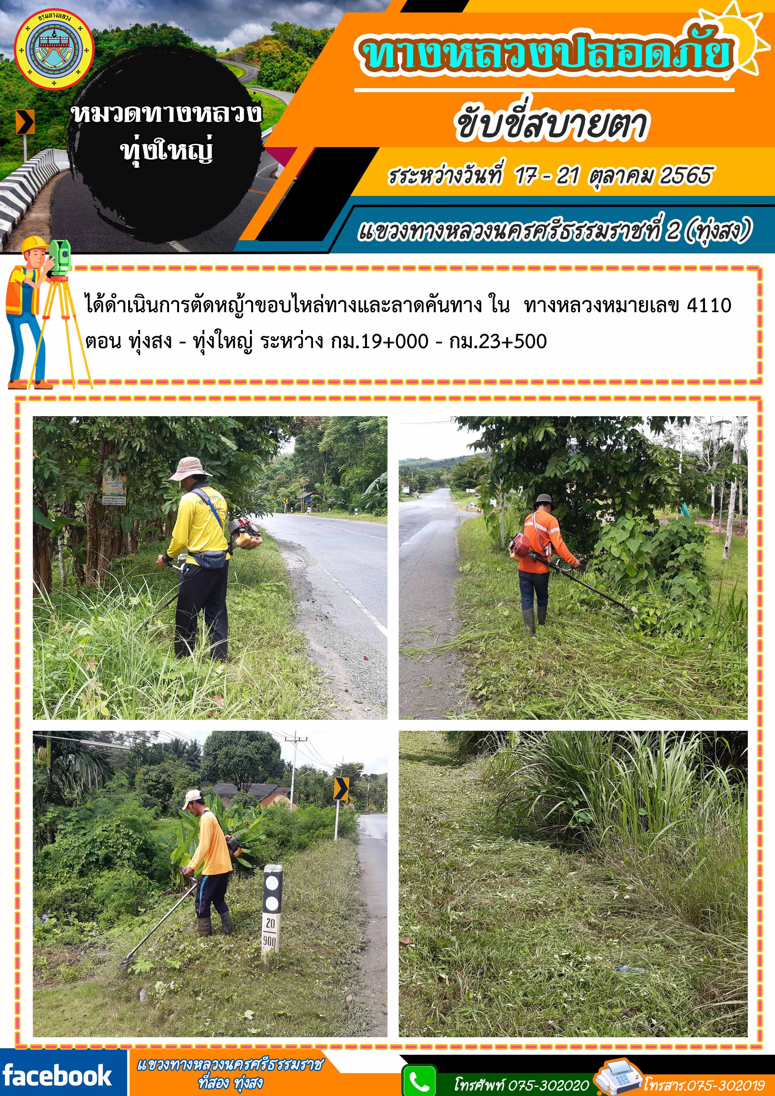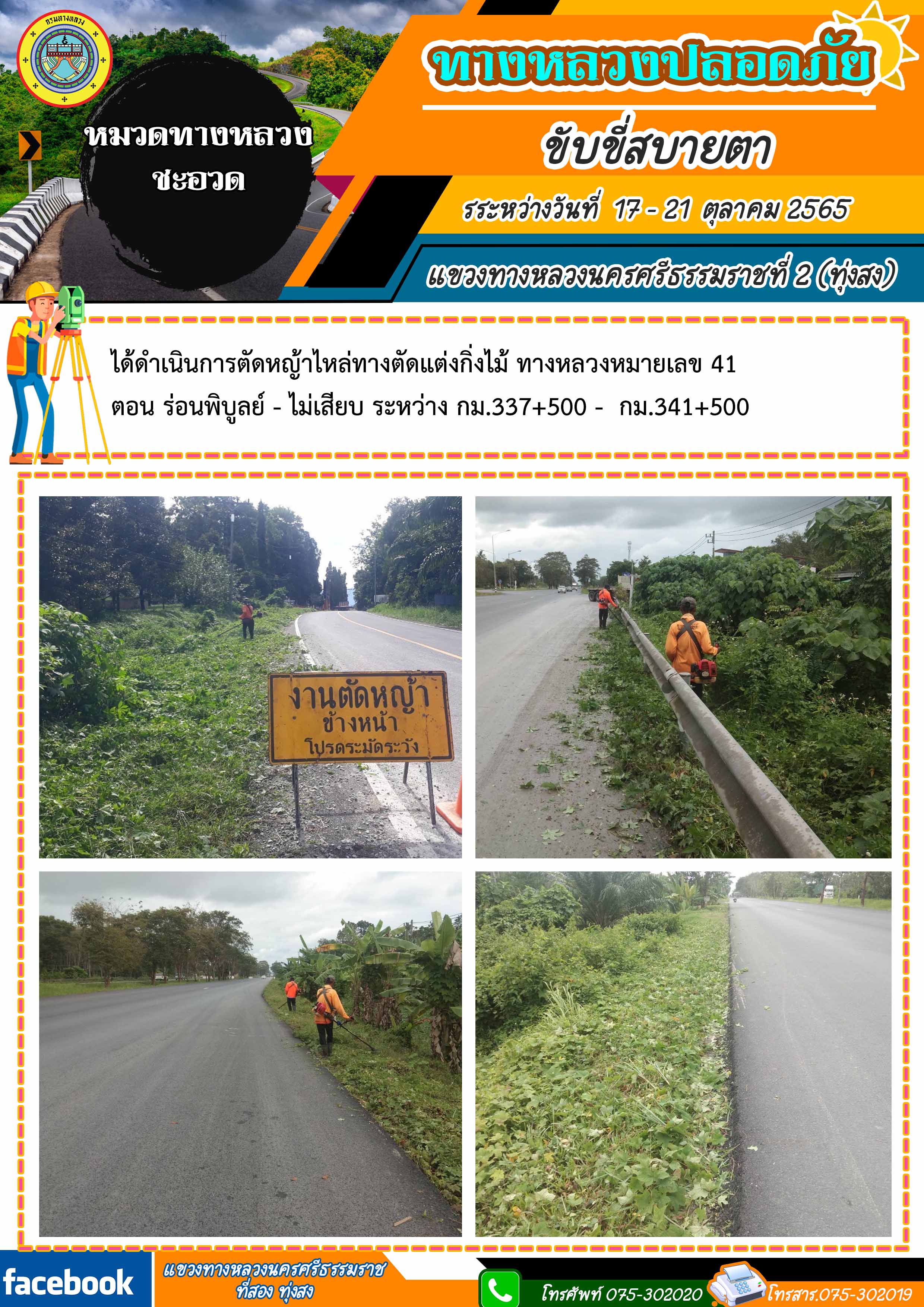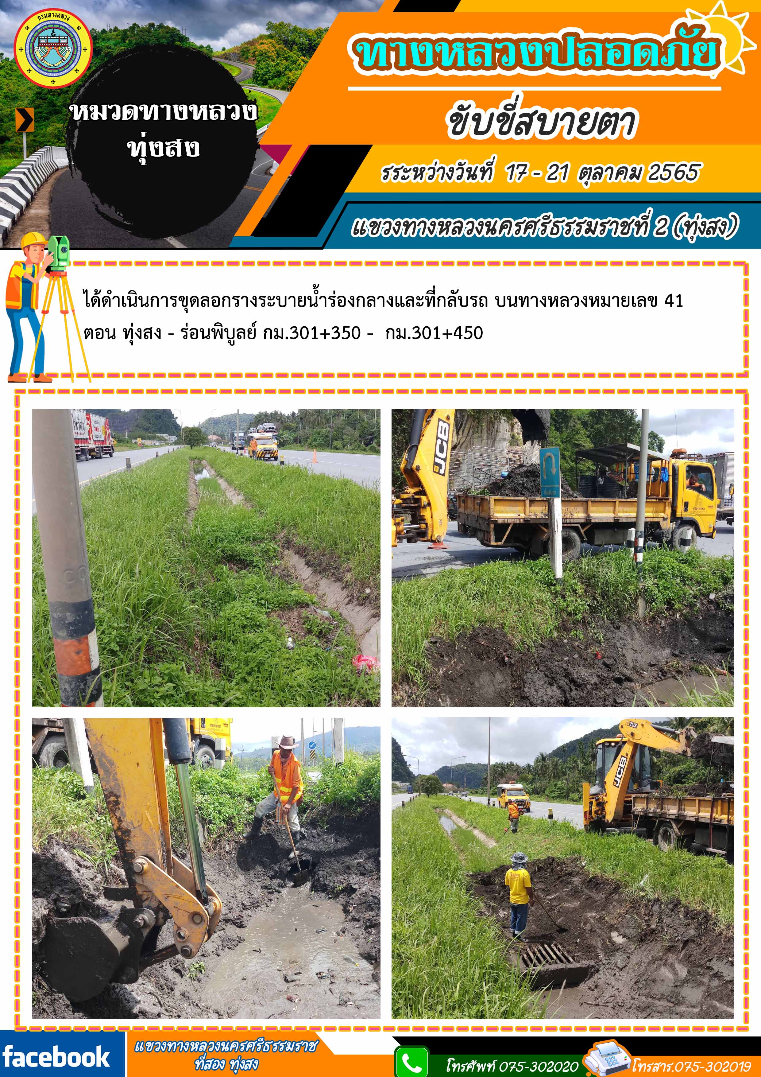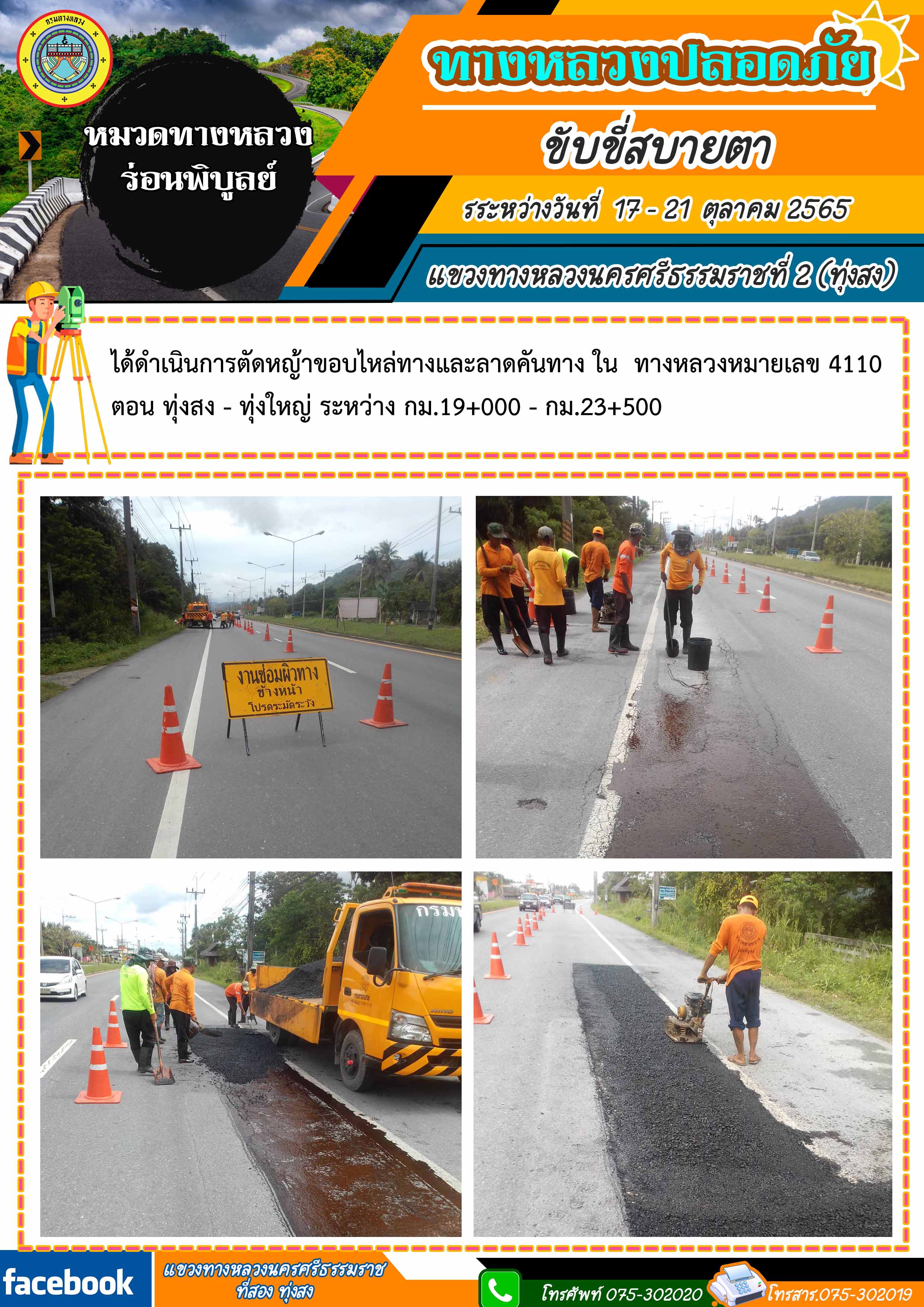 ทางหลวงปลอดภัย ขับขี่สบายตา ผลการปฏิบัติงานประจำสัปดาห์ของแขวงทางหลวงนครศรีธรรมราชที่ 2 (ทุ่งสง) ระหว่างวันที่ 17 -21 ตุลาคม 2565 โดยหมวดทางหลวงและหน่วยงานในสังกัด