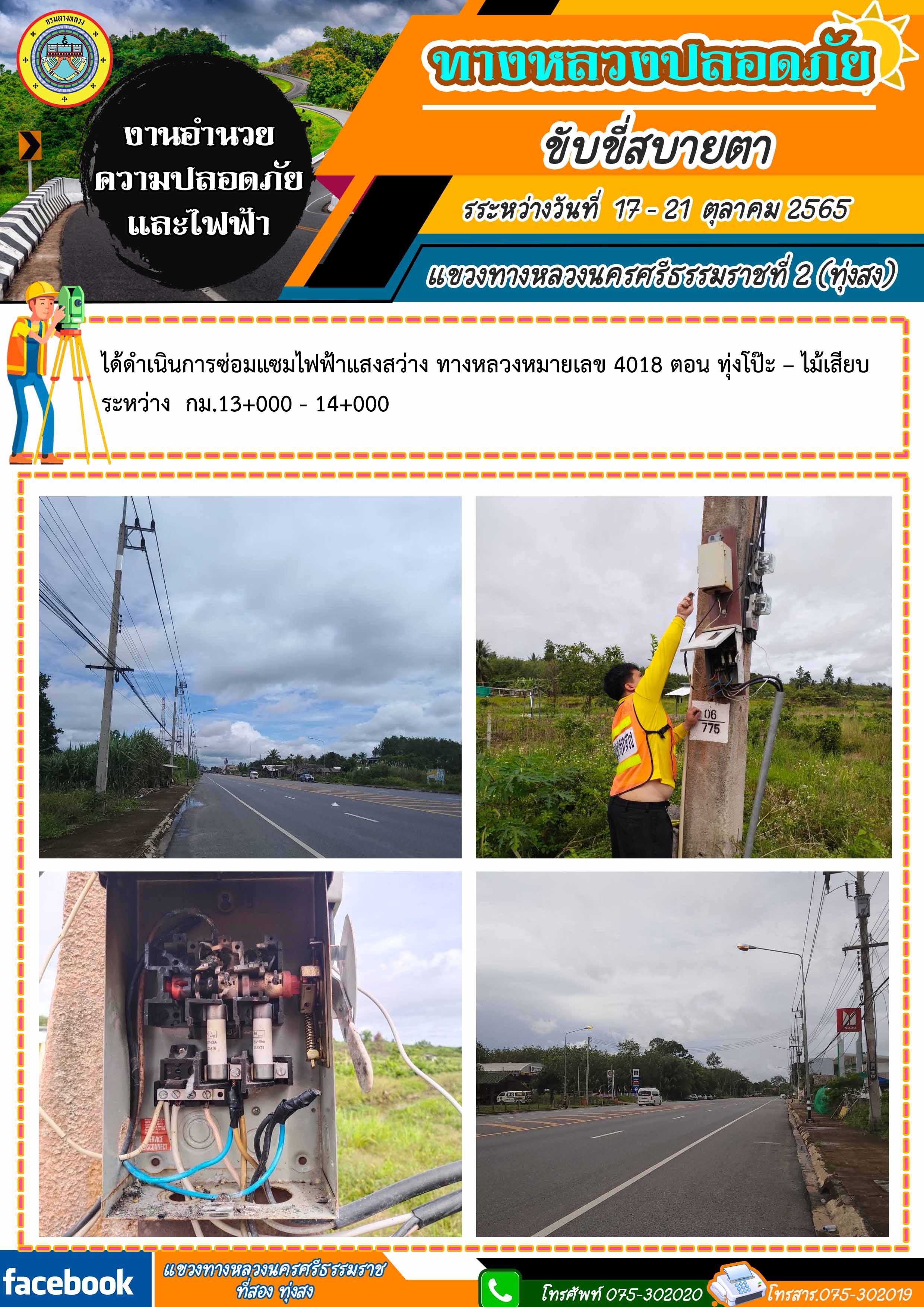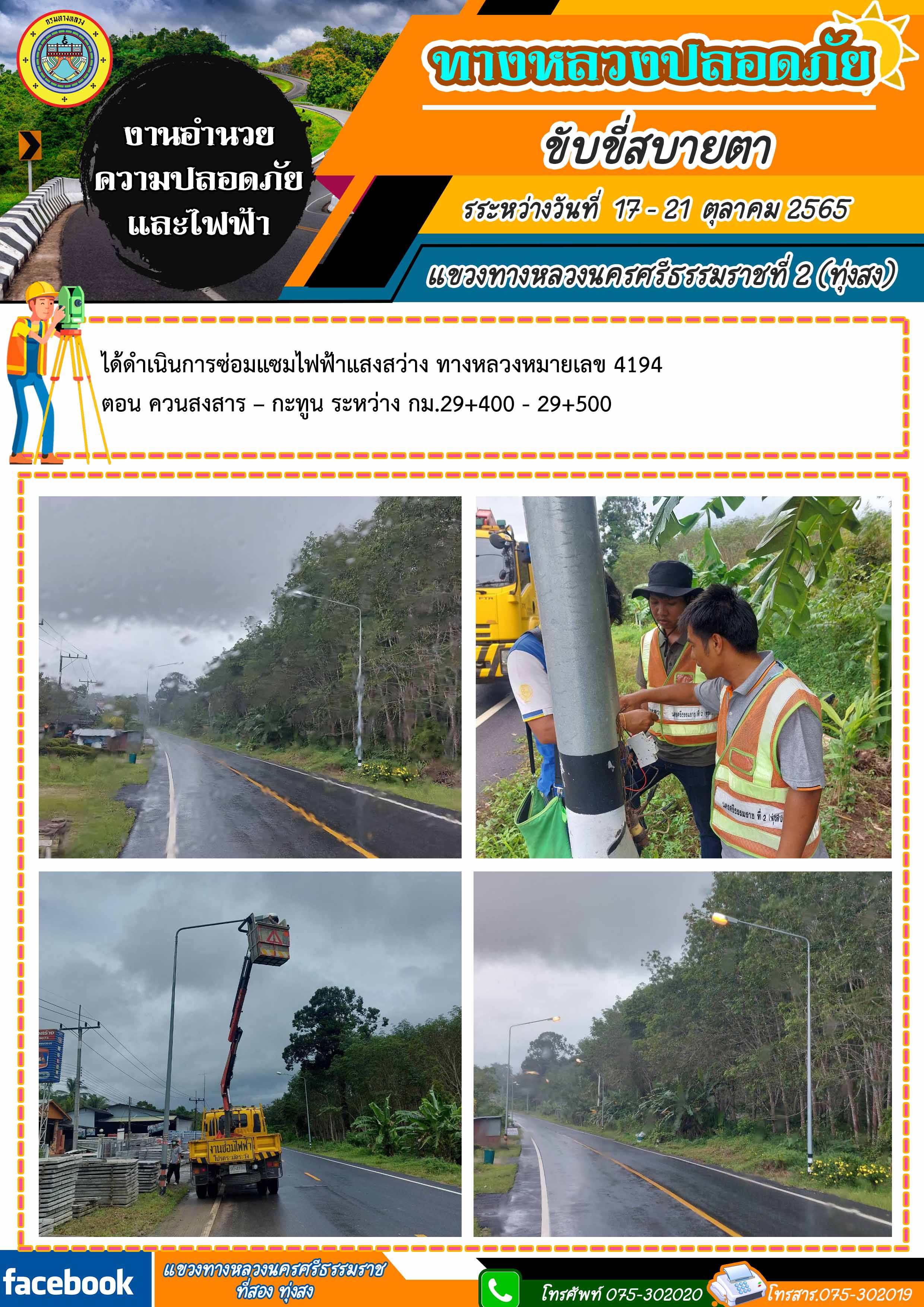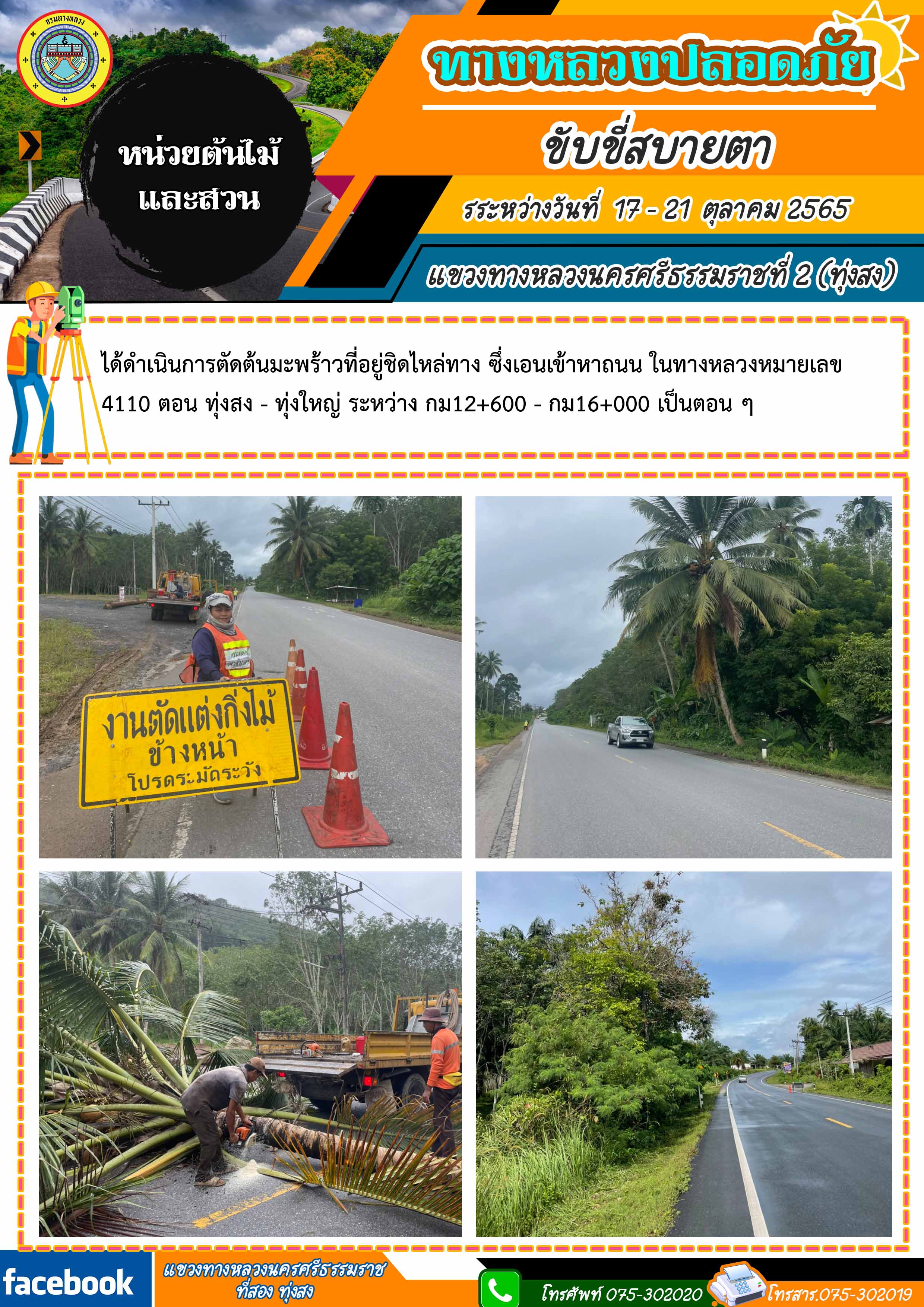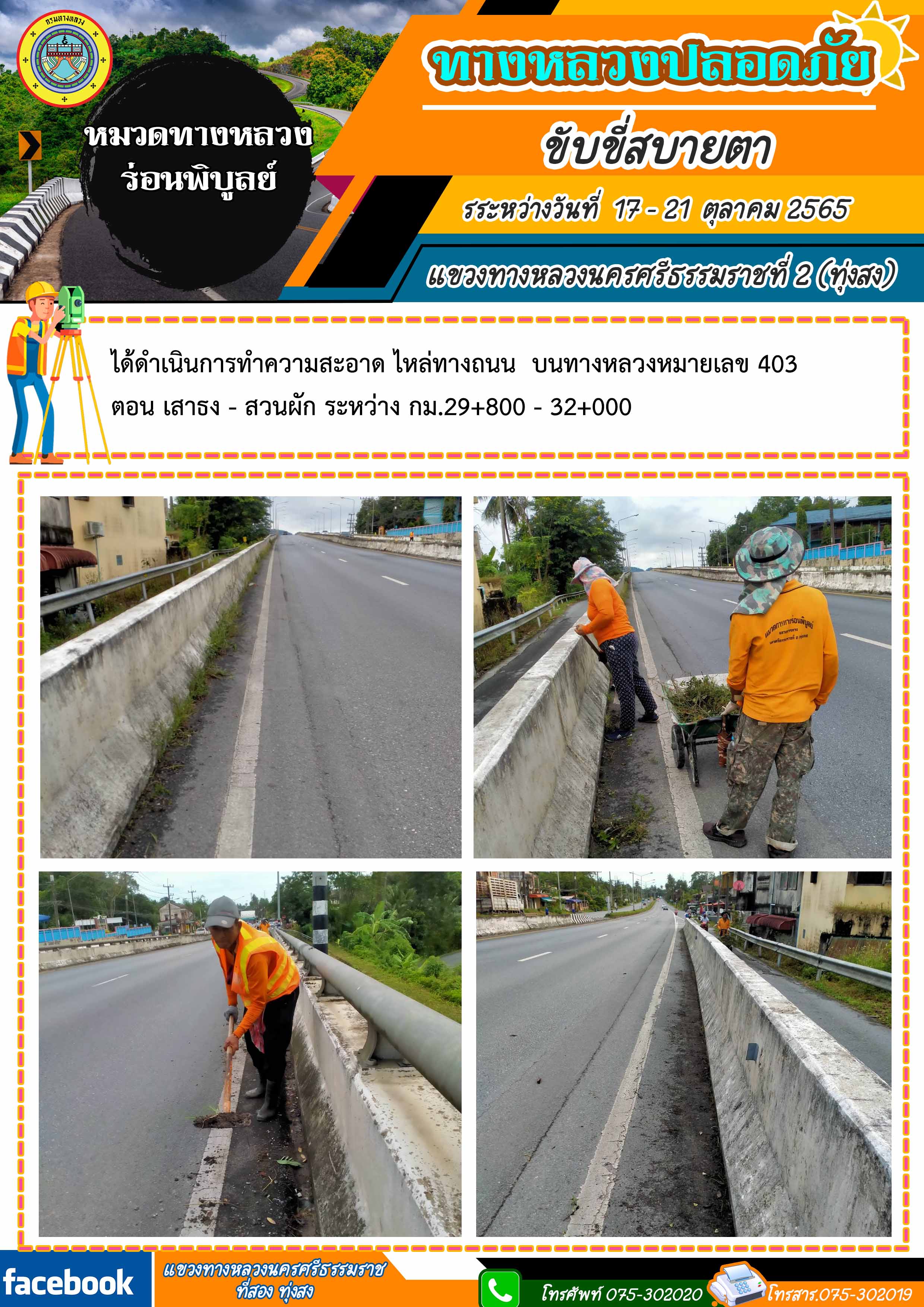 ทางหลวงปลอดภัย ขับขี่สบายตา ผลการปฏิบัติงานประจำสัปดาห์ของแขวงทางหลวงนครศรีธรรมราชที่ 2 (ทุ่งสง) ระหว่างวันที่ 17 -21 ตุลาคม 2565 โดยหมวดทางหลวงและหน่วยงานในสังกัด