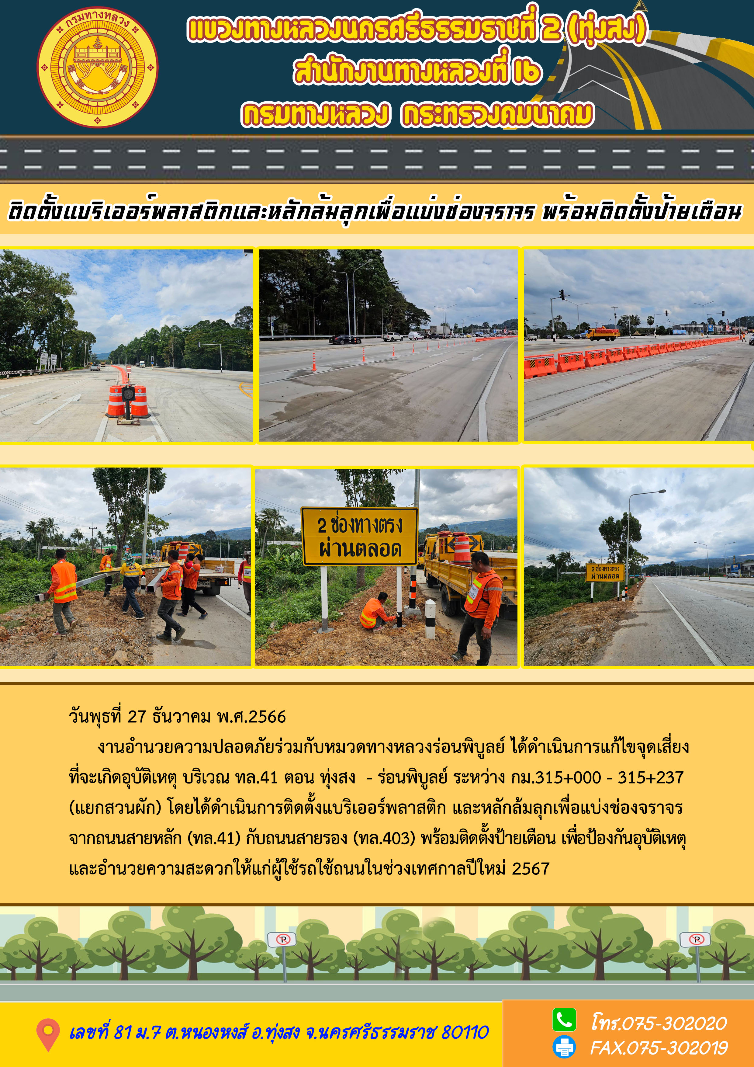 งานอำนวยความปลอดภัยร่วมกับหมวดทางหลวงร่อนพิบูลย์ ได้ดำเนินการแก้ไขจุดเสี่ยงที่จะเกิดอุบัติเหตุ บริเวณ ทล.41 ตอน ทุ่งสง - ร่อนพิบูลย์ ระหว่าง กม.315+000 - 315+237 (แยกสวนผัก) โดยได้ดำเนินการติดตั้งแบริเออร์พลาสติก และหลักล้มลุกเพื่อแบ่งช่องจราจรจากถนนสายหลัก (ทล.41) กับถนนสายรอง (ทล.403) พร้อมติดตั้งป้ายเตือน เพื่อป้องกันอุบัติเหตุและอำนวยความสะดวกให้แก่ผู้ใช้รถใช้ถนนในช่วงเทศกาลปีใหม่ 2567