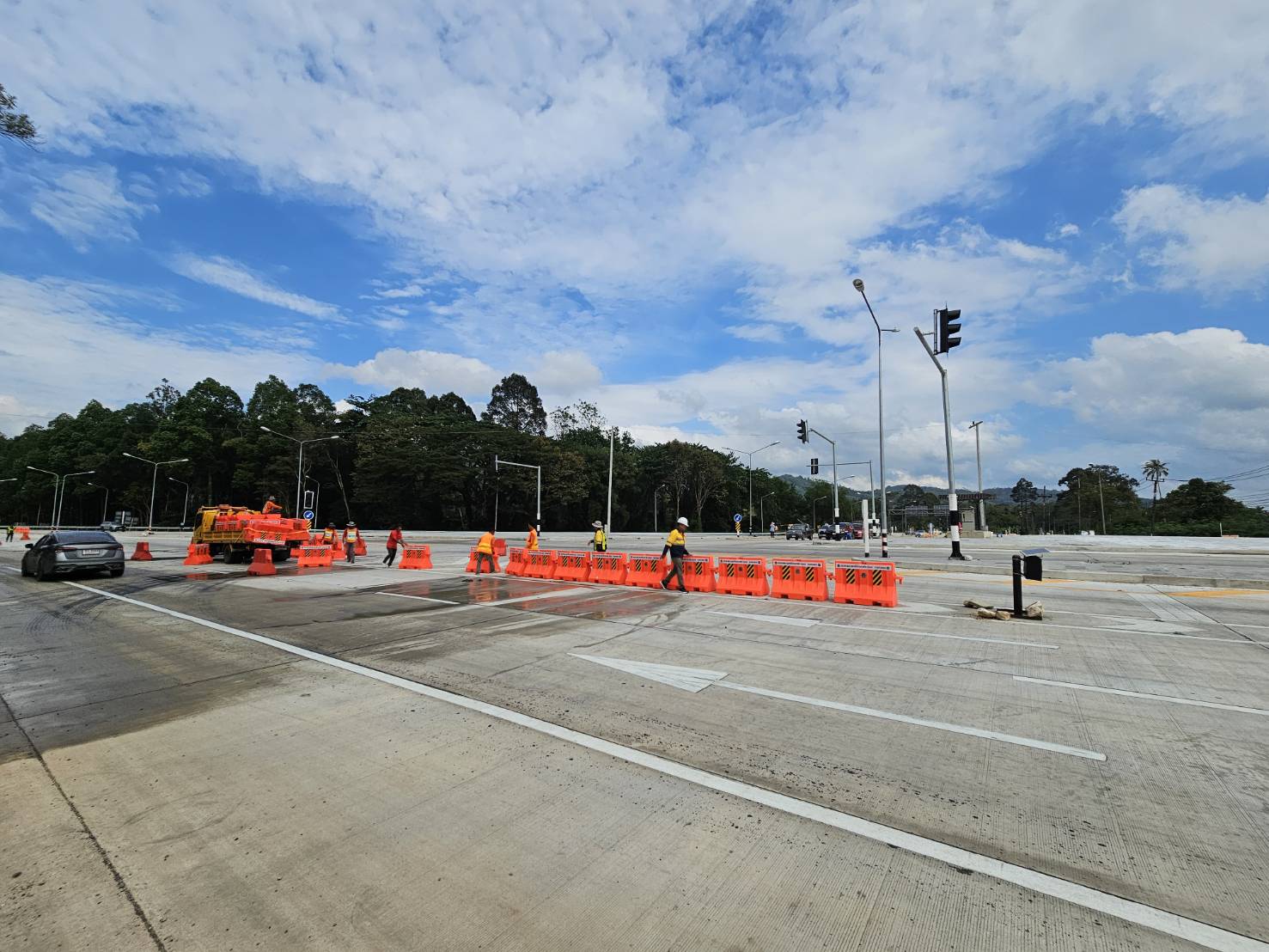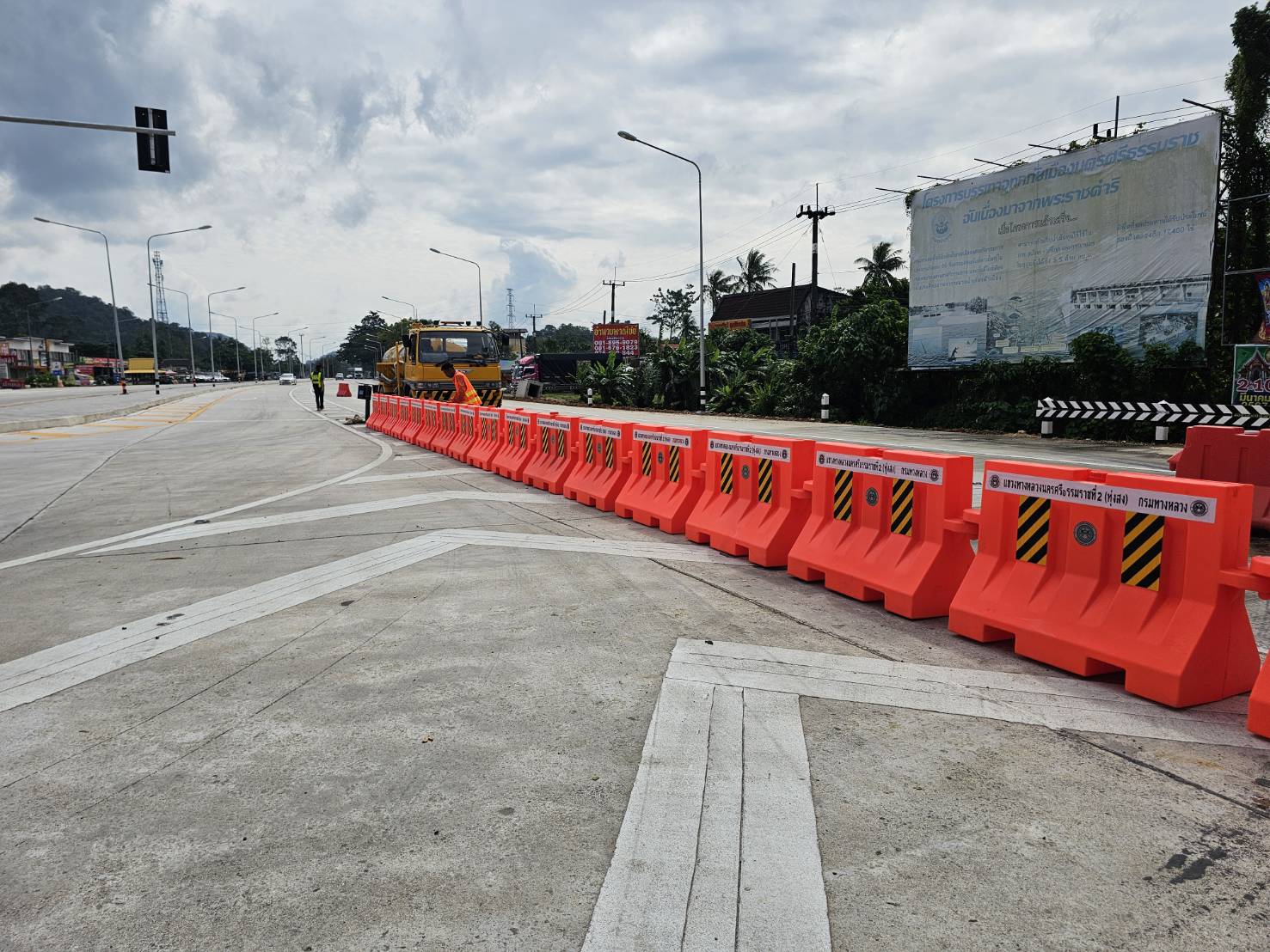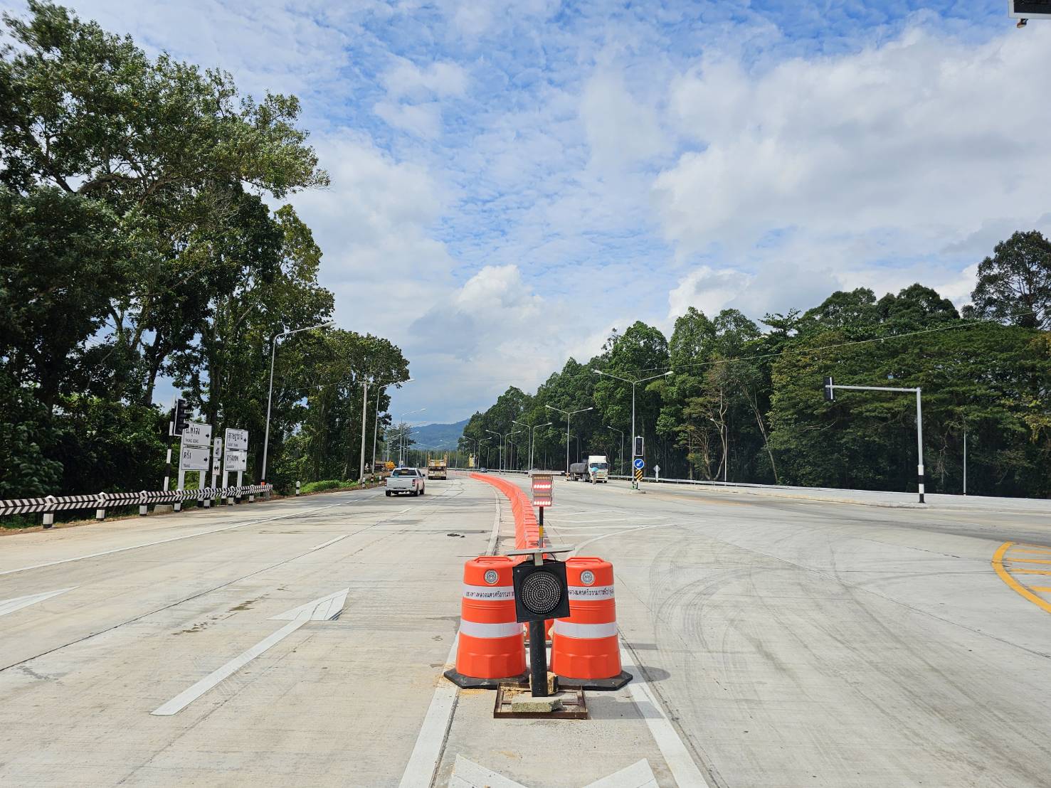 ติดตั้งแบริเออร์พลาสติกและหลักล้มลุกเพื่อแบ่งช่องจราจร พร้อมติดตั้งป้ายเตือน ทล.41