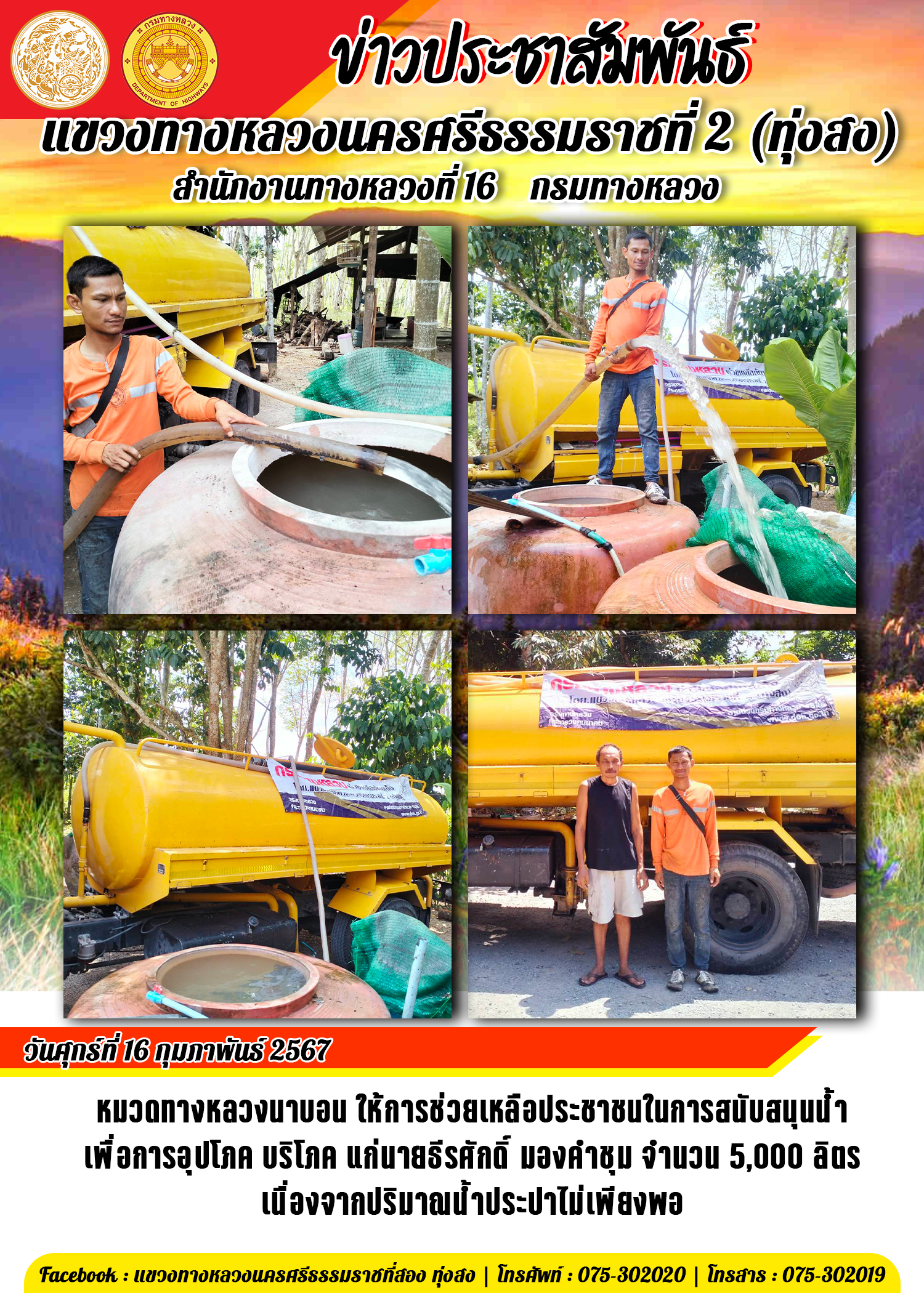 หมวดทางหลวงนาบอน ให้การช่วยเหลือประชาชนในการสนับสนุนน้ำใช้ในครัวเรือน เนื่องจากปริมาณน้ำประปาไม่เพียงพอในการอุปโภคบริโภค