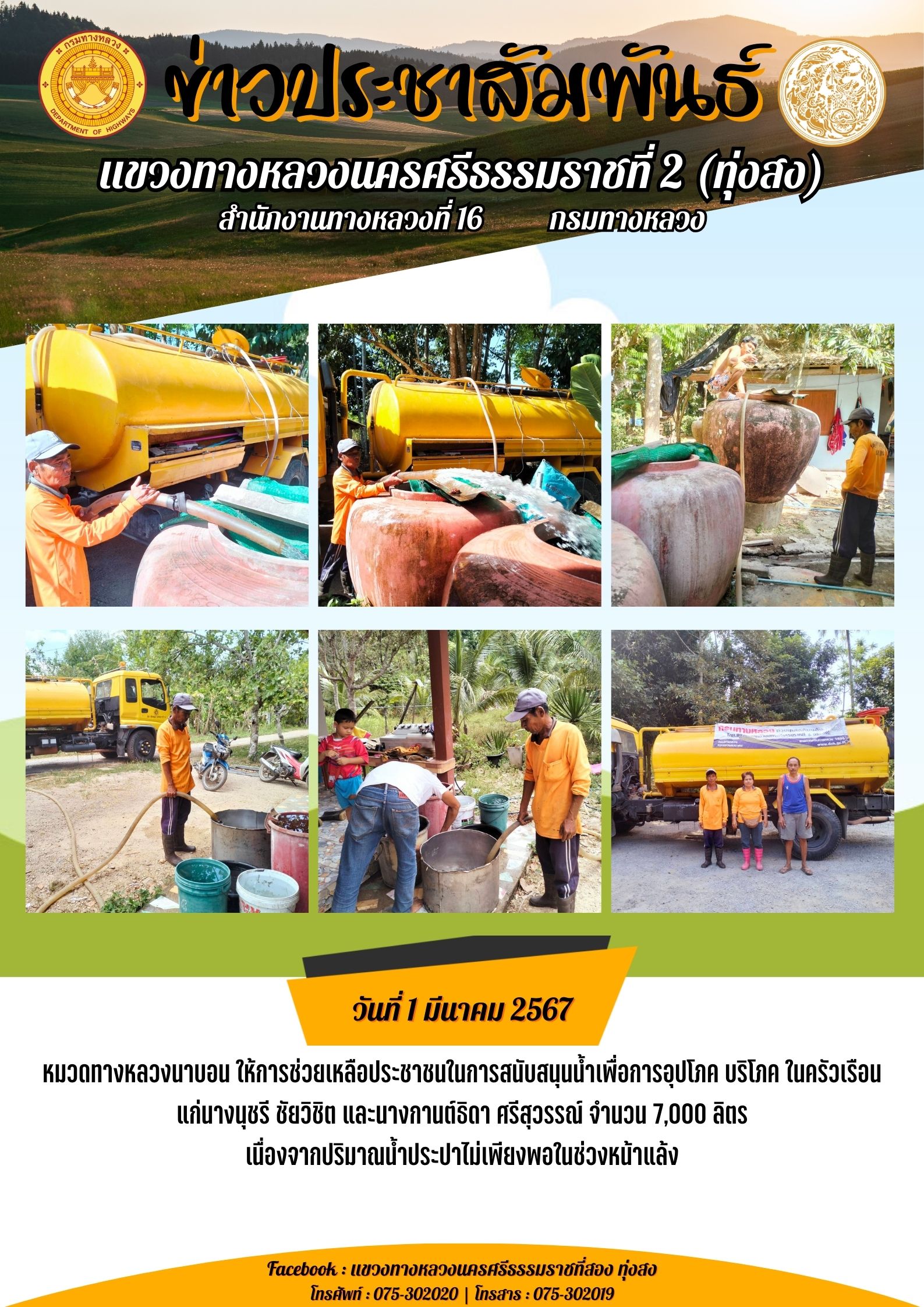 หมวดทางหลวงนาบอน ให้การช่วยเหลือประชาชนในการสนับสนุนน้ำเพื่อการอุปโภค บริโภค ในครัวเรือน
