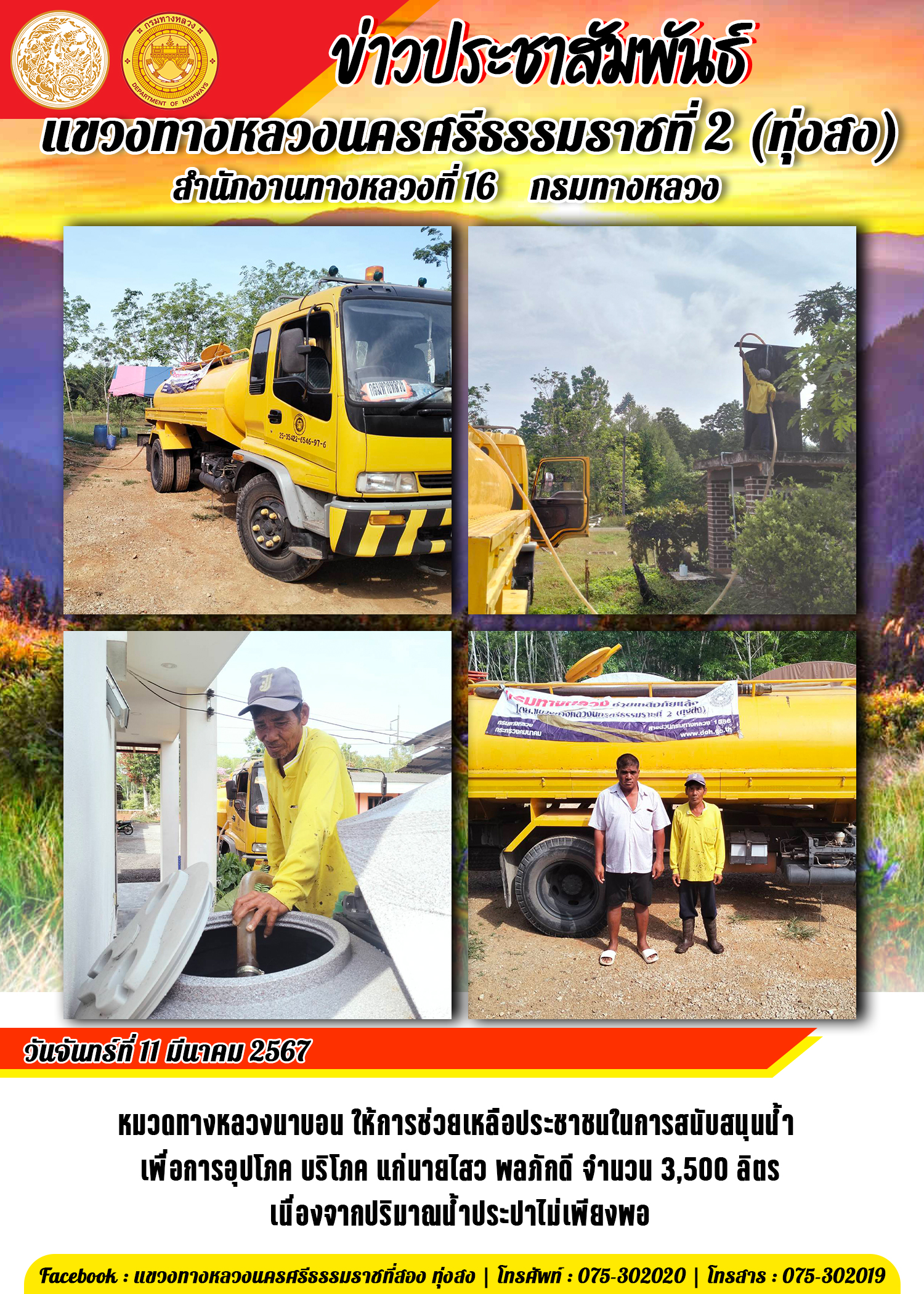 หมวดทางหลวงนาบอน ให้การช่วยเหลือประชาชนในการสนับสนุนน้ำ เพื่อการอุปโภค บริโภค แก่นายไสว พลภักดี จำนวน 3,500 ลิตร เนื่องจากปริมาณน้ำประปาไม่เพียงพอ