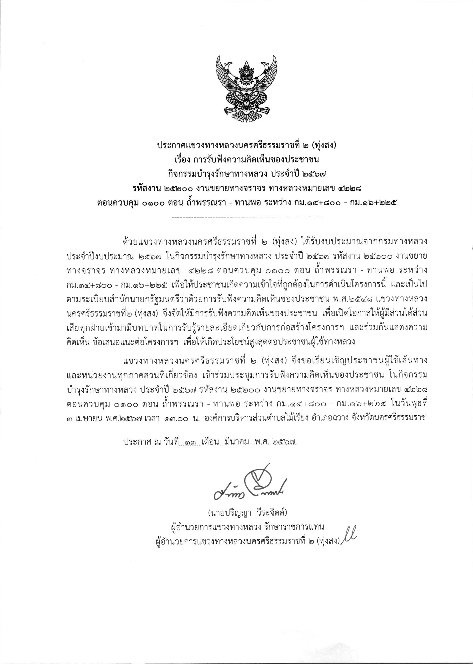 จะดำเนินการรับฟังความคิดเห็นของประชาชน ในกิจกรรมบำรุงรักษาทางหลวง ประจำปี 2567 รหัสงาน 25200 งานขยายทางจราจร ทางหลวงหมายเลข 4228 ตอนควบคุม 0100 ตอน ถ้ำพรรณรา - ทานพอ ระหว่าง กม.14+800 - กม.16+225 ในวันพุธที่ 3 เมษายน พ.ศ.2567 เวลา 13.00 น. องค์การบริหารส่วนตำบลไม้เรียง อำเภอฉวาง จังหวัดนครศรีธรรมราชเพื่อเปิดโอกาสให้ผู้มีส่วนได้ส่วนเสียทุกฝ่ายเข้ามามีบทบาทในการรับรู้รายละเอียดเกี่ยวกับการก่อสร้างโครงการฯ และร่วมกันแสดงความคิดเห็น ข้อเสนอแนะต่อโครงการฯเพื่อให้เกิดประโยชน์สูงสุดต่อประชาชนผู้ใช้ทางหลวง