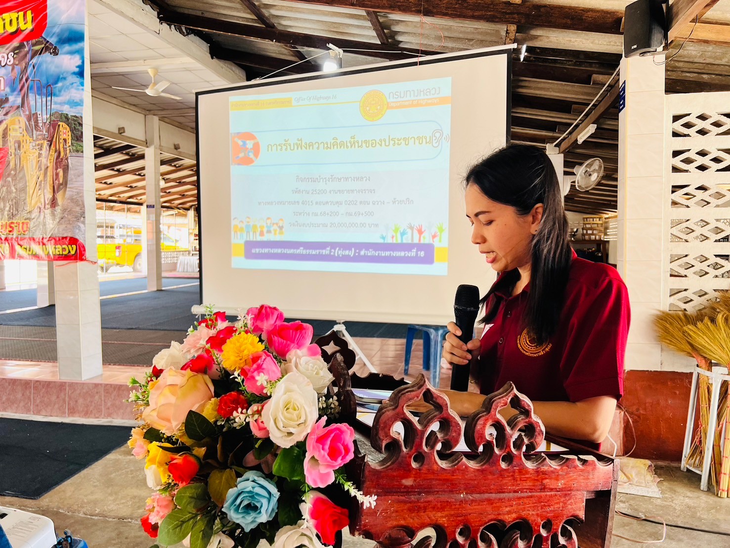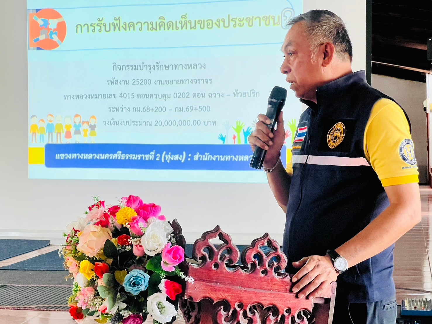 จัดประชุมการรับฟังความคิดเห็นของประชาชน กิจกรรมบำรุงรักษาทางหลวง ประจำปี 2567 รหัสงาน 25200 งานขยายทางจราจร ทางหลวงหมายเลข 4015 ตอนควบคุม 0202 ตอน ฉวาง - ห้วยปริก ระหว่าง กม.68+200 - กม.69+500