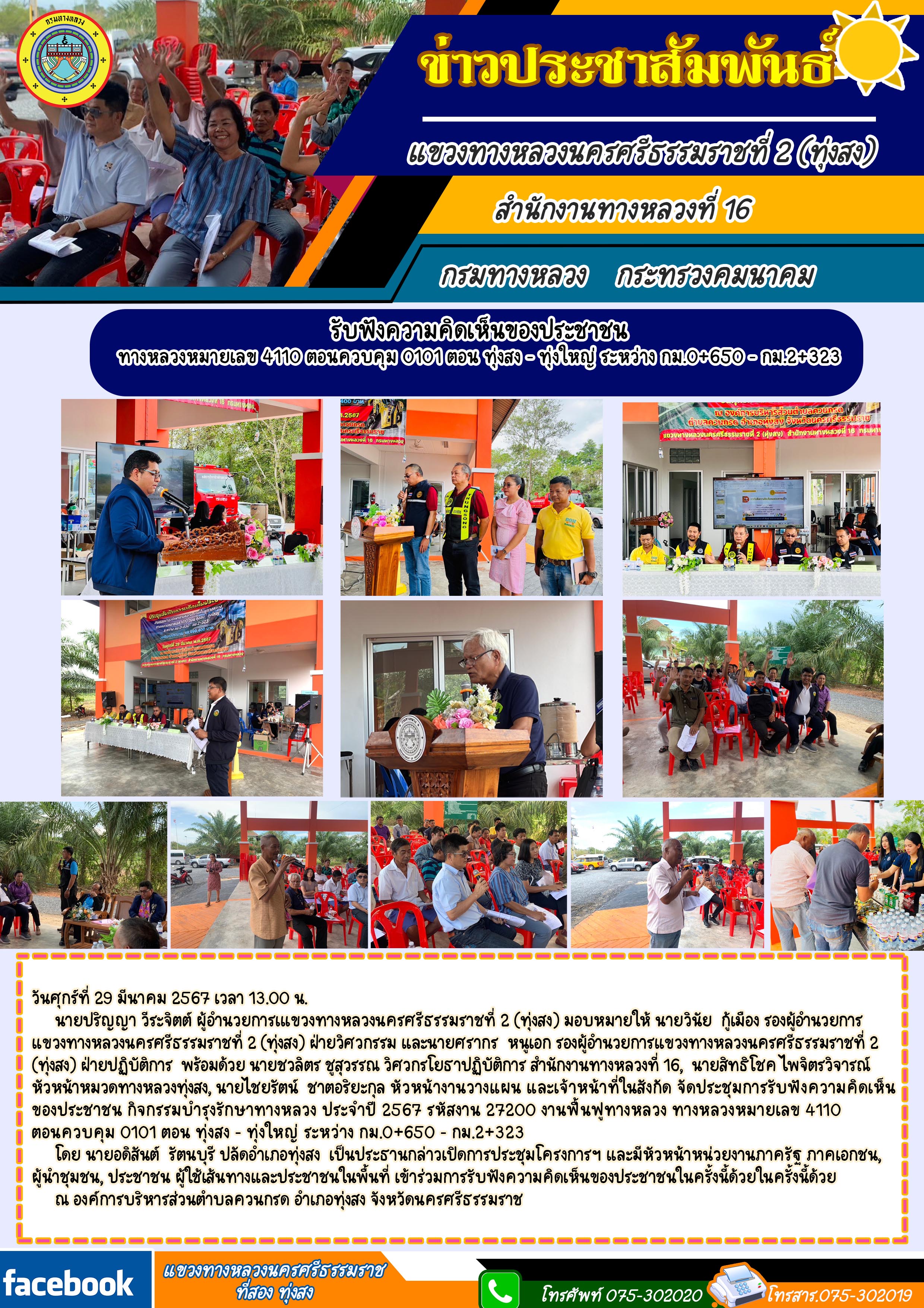 นายปริญญา วีระจิตต์ ผู้อำนวยการเแขวงทางหลวงนครศรีธรรมราชที่ 2 (ทุ่งสง) มอบหมายให้ นายวินัย กู้เมือง รองผู้อำนวยการแขวงทางหลวงนครศรีธรรมราชที่ 2 (ทุ่งสง) ฝ่ายวิศวกรรม และนายศรากร หนูเอก รองผู้อำนวยการแขวงทางหลวงนครศรีธรรมราชที่ 2 (ทุ่งสง) ฝ่ายปฏิบัติการ พร้อมด้วย นายชวลิตร ชูสุวรรณ วิศวกรโยธาปฏิบัติการ สำนักงานทางหลวงที่ 16, นายสิทธิโชค ไพจิตรวิจารณ์ หัวหน้าหมวดทางหลวงทุ่งสง, นายไชยรัตน์ ชาตอริยะกุล หัวหน้างานวางแผน และเจ้าหน้าที่ในสังกัด จัดประชุมการรับฟังความคิดเห็นของประชาชน กิจกรรมบำรุงรักษาทางหลวง ประจำปี 2567 รหัสงาน 27200 งานฟื้นฟูทางหลวง ทางหลวงหมายเลข 4110 ตอนควบคุม 0101 ตอน ทุ่งสง - ทุ่งใหญ่ ระหว่าง กม.0+650 - กม.2+323