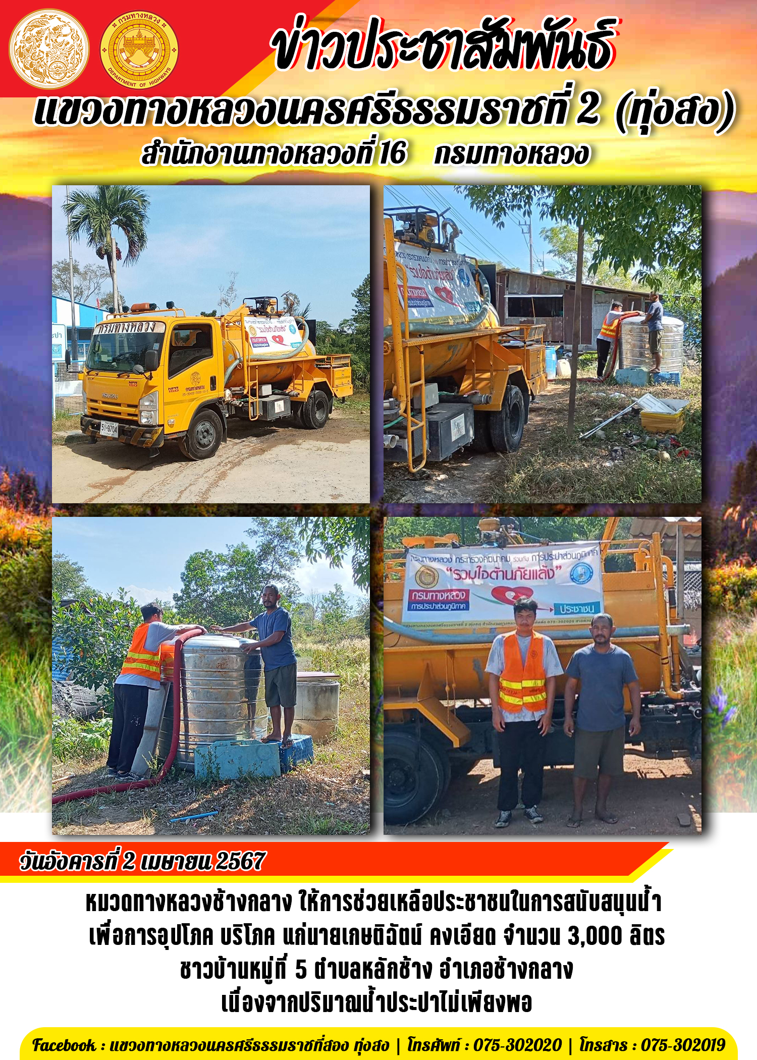 หมวดทางหลวงช้างกลาง ให้การช่วยเหลือประชาชนในการสนับสนุนน้ำ เพื่อการอุปโภค บริโภค