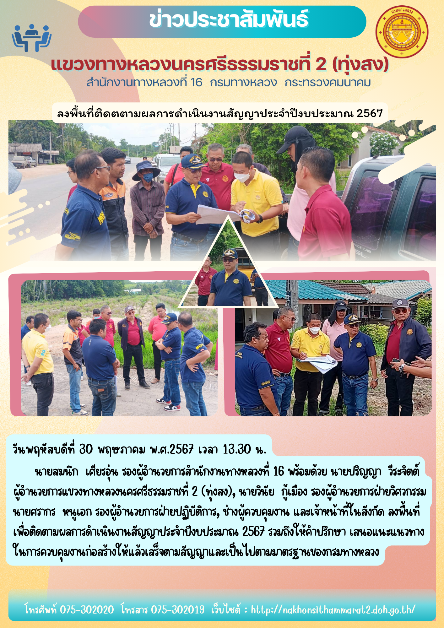 นายสมนึก เศียรอุ่น รองผู้อำนวยการสำนักงานทางหลวงที่ 16 พร้อมด้วย นายปริญญา วีระจิตต์ ผู้อำนวยการแขวงทางหลวงนครศรีธรรมราชที่ 2 (ทุ่งสง), นายวินัย กู้เมือง รองผู้อำนวยการฝ่ายวิศวกรรม, นายศรากร หนูเอก รองผู้อำนวยการฝ่ายปฏิบัติการ, ช่างผู้ควบคุมงาน และเจ้าหน้าที่ในสังกัด ลงพื้นที่เพื่อติดตามผลการดำเนินงานสัญญาประจำปีงบประมาณ 2567 รวมถึงให้คำปรึกษา เสนอแนะแนวทาง