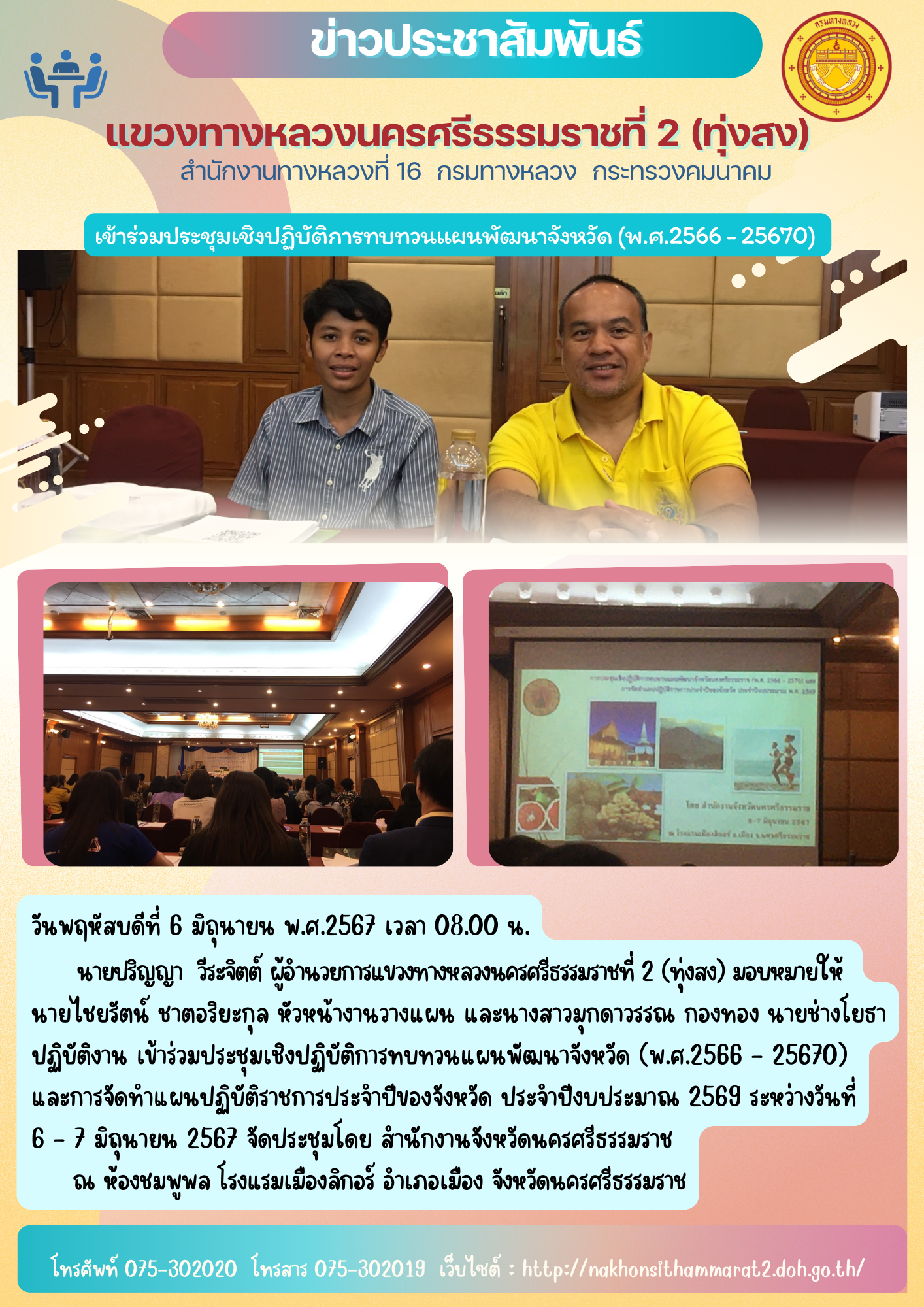 นายปริญญา วีระจิตต์ ผู้อำนวยการแขวงทางหลวงนครศรีธรรมราชที่ 2 (ทุ่งสง) มอบหมายให้ นายไชยรัตน์ ชาตอริยะกุล หัวหน้างานวางแผน และนางสาวมุกดาวรรณ กองทอง นายช่างโยธาปฏิบัติงาน เข้าร่วมประชุมเชิงปฏิบัติการทบทวนแผนพัฒนาจังหวัด (พ.ศ.2566 - 25670) และการจัดทำแผนปฏิบัติราชการประจำปีของจังหวัด ประจำปีงบประมาณ 2569 ระหว่างวันที่ 6 - 7 มิถุนายน 2567 จัดประชุมโดย สำนักงานจังหวัดนครศรีธรรมราช