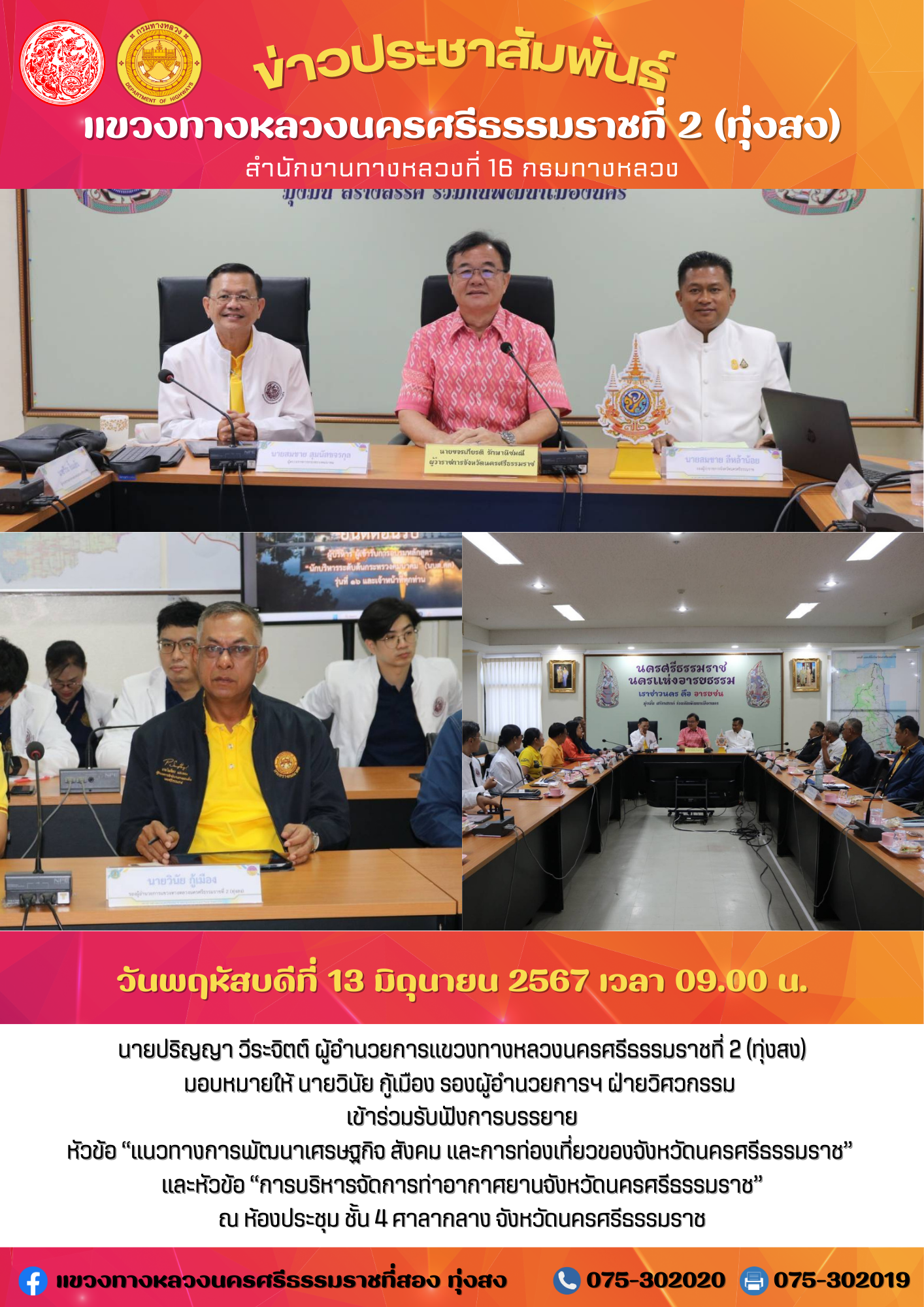 วันพฤหัสบดีที่ 13 มิถุนายน 2567 เวลา 09.00 นายปริญญา วีระจิตต์ ผู้อำนวยการแขวงทางหลวงนครศรีธรรมราชที่ 2 (ทุ่งสง)