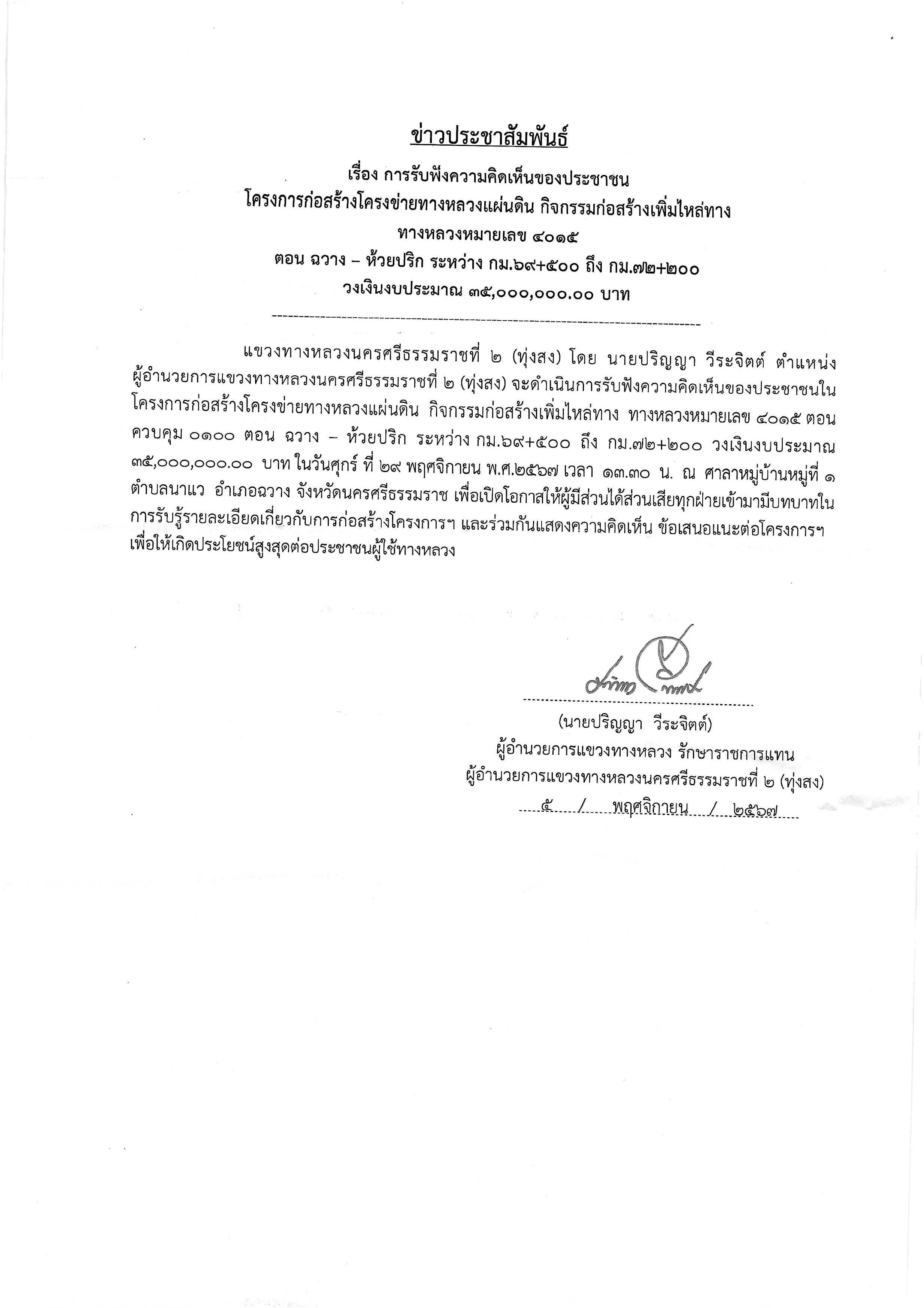แขวงทางหลวงนครศรีธรรมราชที่ 2 (ทุ่งสง) โดยนายปริญญา วีระจิตต์ ตำแหน่งผู้อำนวยการแขวงทางหลวงนครศรีธรรมราชที่ 2 (ทุ่งสง) จะดำเนินการรับฟังความคิดเห็นของประชาชน โครงการก่อสร้างโครงข่ายทางหลวงแผ่นดิน กิจกรรมก่อสร้างเพิ่มไหล่ทาง งานก่อสร้างเพิ่มไหล่ทาง ทางหลวงหมายเลข 4015 ตอนควบคุม 0202 ตอน ฉวาง - ห้วยปริก ระหว่าง กม.69+500 ถึง กม.72+200 วงเงินงบประมาณ 35,000,000.00 บาท ในนวันศุกร์ที่ 29 พฤศจิกายน พ.ศ.2567 เวลา 13.30 น. ให้ผู้มีส่วนได้ส่วนเสียทุกฝ่ายเข้ามามีบทบาทในการรับรู้รายละเอียดเกี่ยวกับการก่อสร้างโครงการฯ และร่วมกันแสดงความคิดเห็น ข้อเสนอแนะต่อโครงการฯ เพื่อให้เกิดประโยชน์สูงสุดต่อประชาชนผู้ใช้ทางหลวง