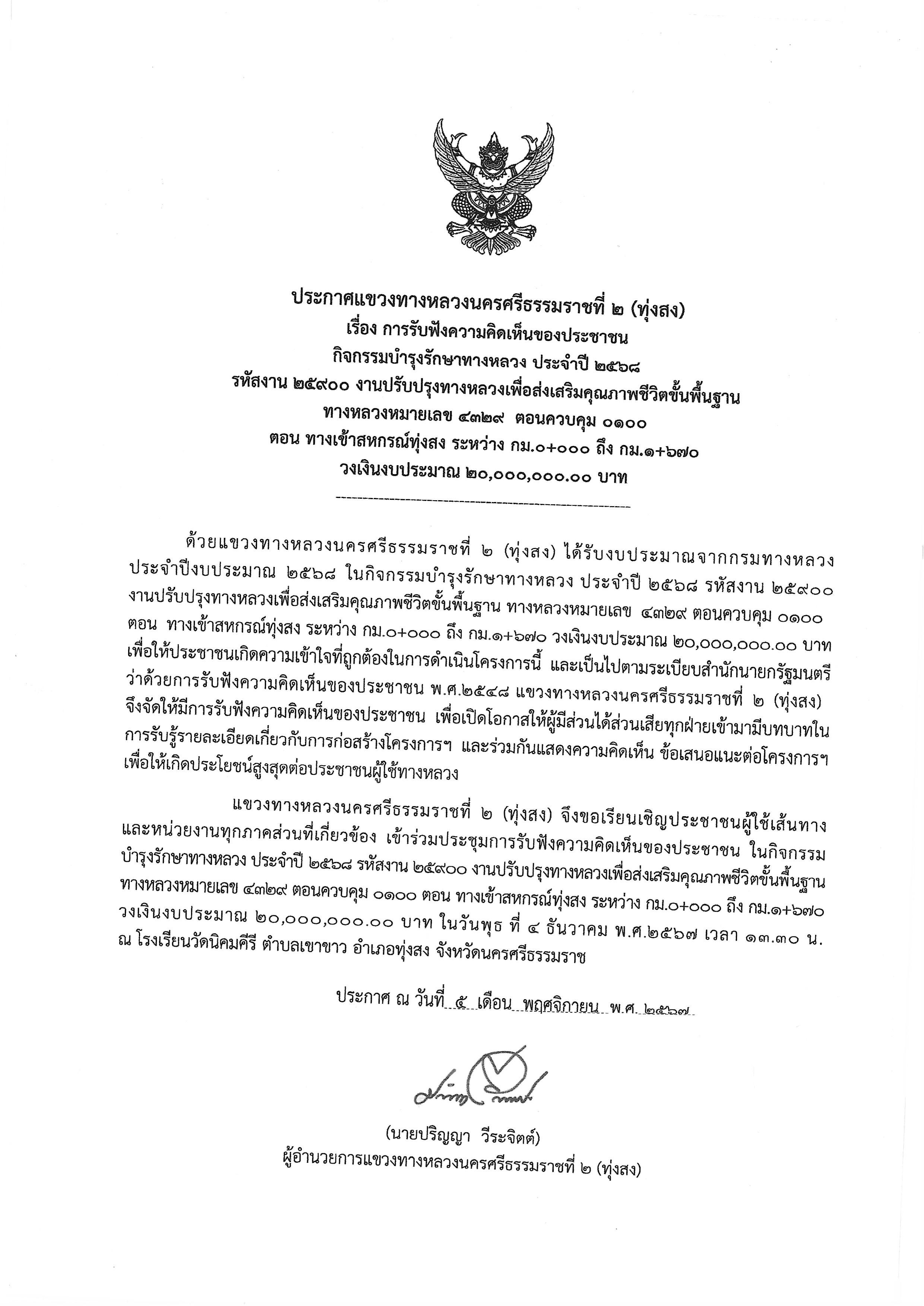 แขวงทางหลวงนครศรีธรรมราชที่ 2 (ทุ่งสง) โดยนายปริญญา วีระจิตต์ ตำแหน่งผู้อำนวยการแขวงทางหลวงนครศรีธรรมราชที่ 2 (ทุ่งสง) จะดำเนินการรับฟังความคิดเห็นของประชาชน ในกิจกรรมบำรุงรักษาทางหลวง ทางหลวงหมายเลข 4329 ตอนควบคุม 0100 ตอน ทางเข้าสหกรณ์ทุ่งสง ระหว่าง กม.0+000 ถึง กม.1+670 วงเงินงบประมาณ 20,000,000.00 บาท ในวันพุธที่ 4 ธันวาคม พ.ศ.2567 เวลา 13.30 น. ให้ผู้มีส่วนได้ส่วนเสียทุกฝ่ายเข้ามามีบทบาทในการรับรู้รายละเอียดเกี่ยวกับการก่อสร้างโครงการฯ และร่วมกันแสดงความคิดเห็น ข้อเสนอแนะต่อโครงการฯ เพื่อให้เกิดประโยชน์สูงสุดต่อประชาชนผู้ใช้ทางหลวง
