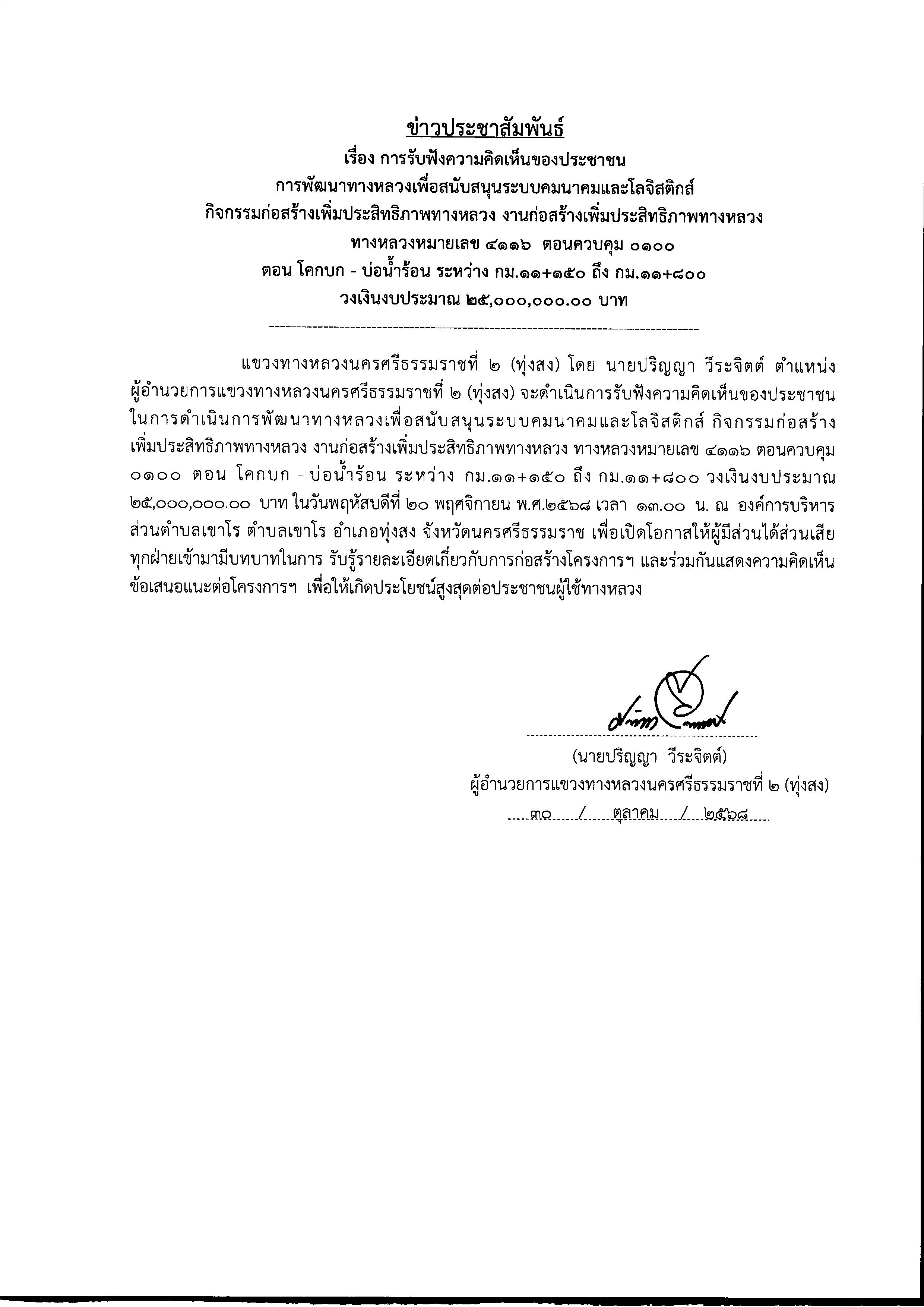 แขวงทางหลวงนครศรีธรรมราชที่ 2 (ทุ่งสง) โดย นายปริญญา วีระจิตต์ ตำแหน่ง ผู้อำนวยการแขวงทางหลวงนครศรีธรรมราชที่ 2 (ทุ่งสง) จะดำเนินการรับฟังความคิดเห็นของประชาชน ในการดำเนินการพัฒนาทางหลวงเพื่อสนับสนุนระบบคมนาคมและโลจิสติกส์ กิจกรรมก่อสร้าง เพิ่มประสิทธิภาพทางหลวง งานก่อสร้างเพิ่มประสิทธิภาพทางหลวง ทางหลวงหมายเลข 4116 ตอนควบคุม 0100 ตอน โคกบก - บ่อน้ำร้อน ระหว่าง กม.11+150 ถึง กม.11+800 วงเงินงบประมาณ 25,000,000.00 บาท ในวันพฤหัสบดีที่ 20 พฤศจิกายน พ.ศ.2568 เวลา 13.00 น. ณ องค์การบริหาร ส่วนตำบลเขาโร ตำบลเขาโร อำเภอทุ่งสง จังหวัดนครศรีธรรมราช เพื่อเปิดโอกาสให้ผู้มีส่วนได้ส่วนเสีย ทุกฝ่ายเข้ามามีบทบาทในการ รับรู้รายละเอียดเกี่ยวกับการก่อสร้างโครงการฯ และร่วมกันแสดงความคิดเห็น ข้อเสนอแนะต่อโครงการฯ เพื่อให้เกิดประโยชน์สูงสุดต่อประชาชนผู้ใช้ทางหลวง