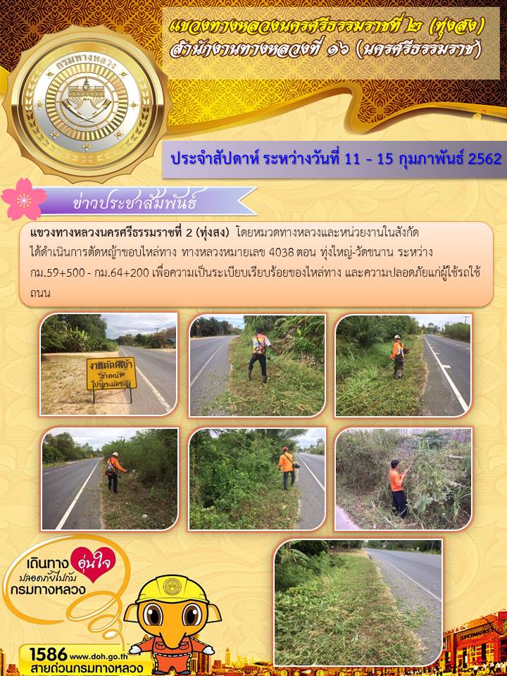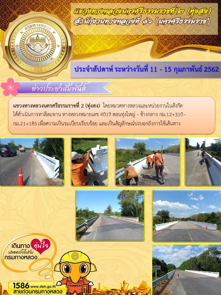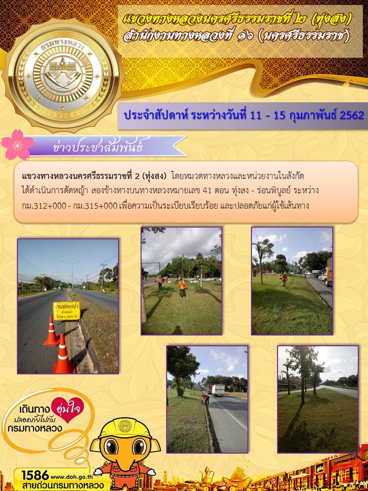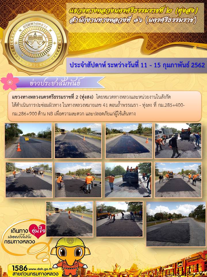 แขวงทางหลวงนครศรีธรรมราชที่ 2 (ทุ่งสง) โดยหมวดทางหลวงและหน่วยงานในสังกัด ได้ดำเนินการ รายงานผลการปฎิบัติงานวันที่ 11 กุมภาพันธ์ 2562-15 กุมภาพันธ์ 2562