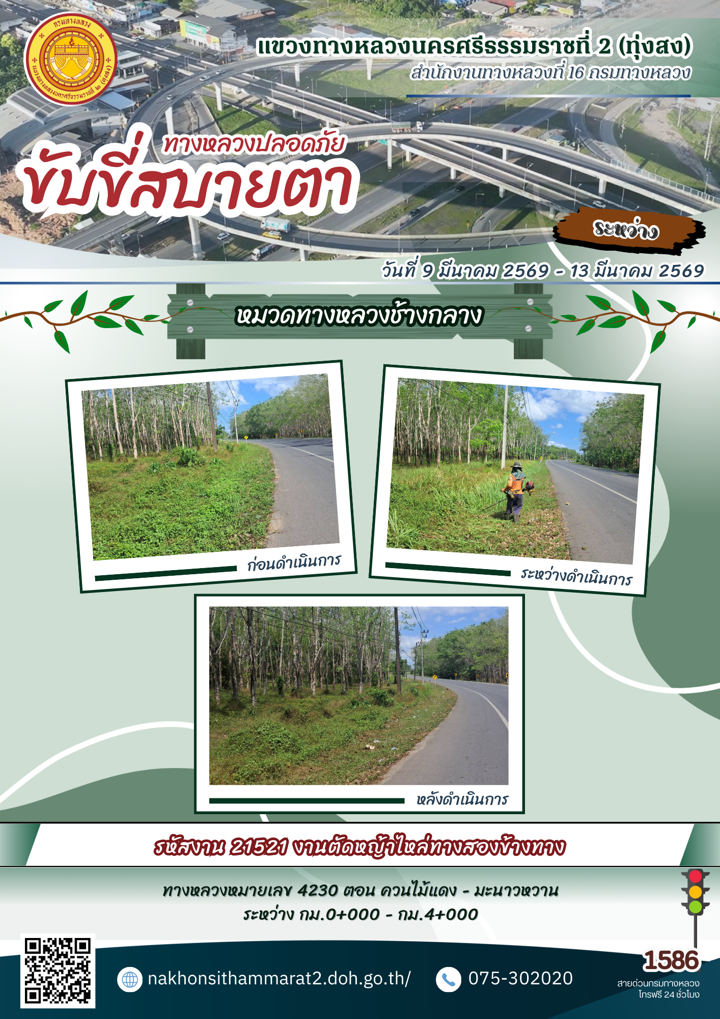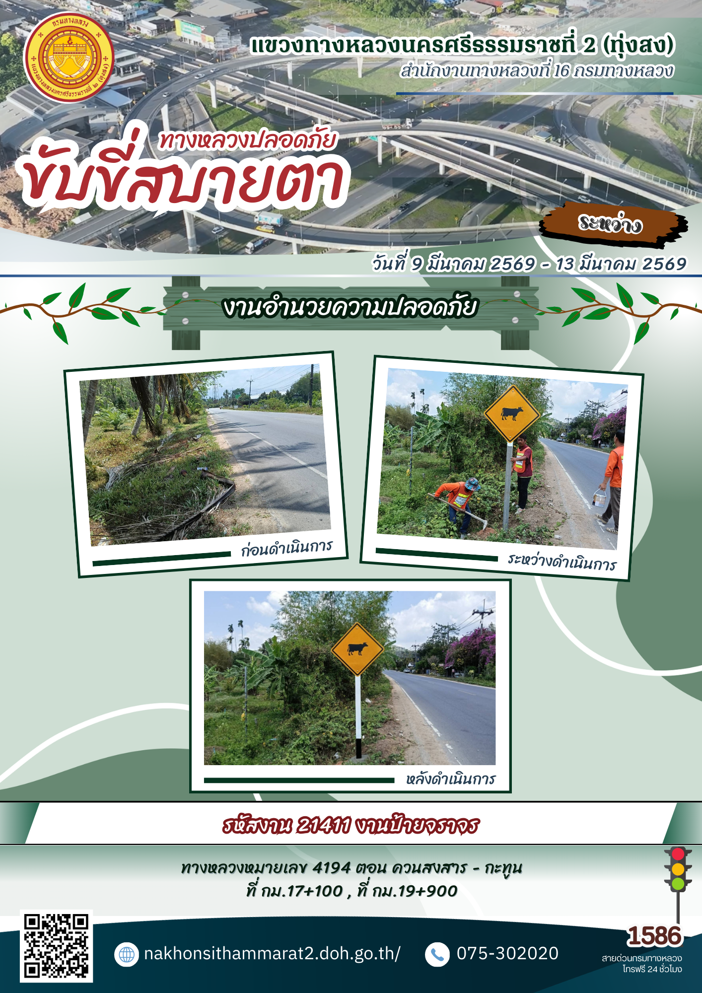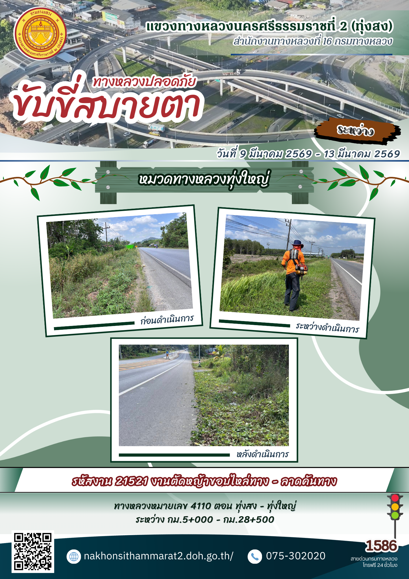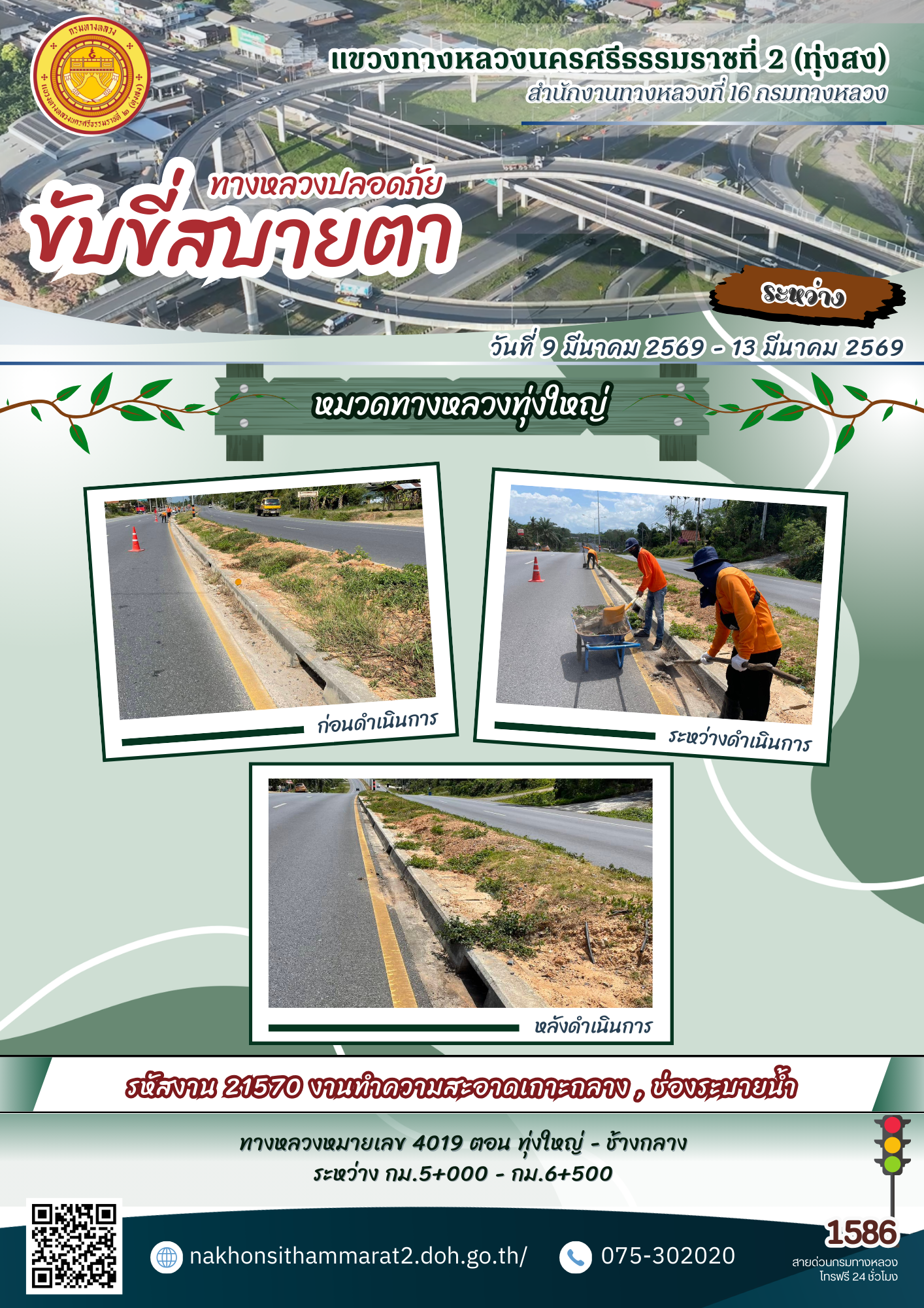 ผลการปฏิบัติงานของหมวดทางหลวงและหน่วยงานในสังกัด แขวงทางหลวงนครศรีธรรมราชที่ 2 (ทุ่งสง) ระหว่างวันที่ 9-13 มีนาคม 2569