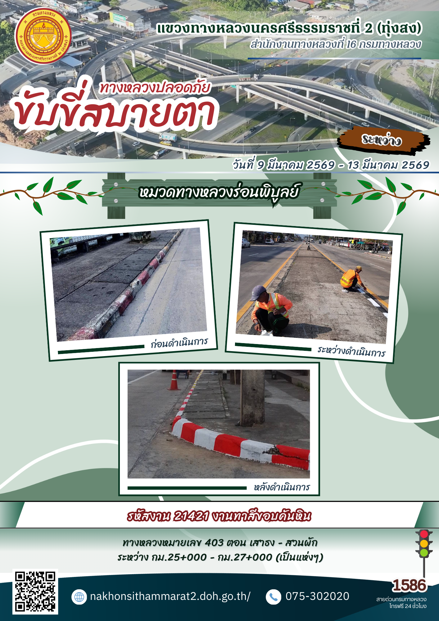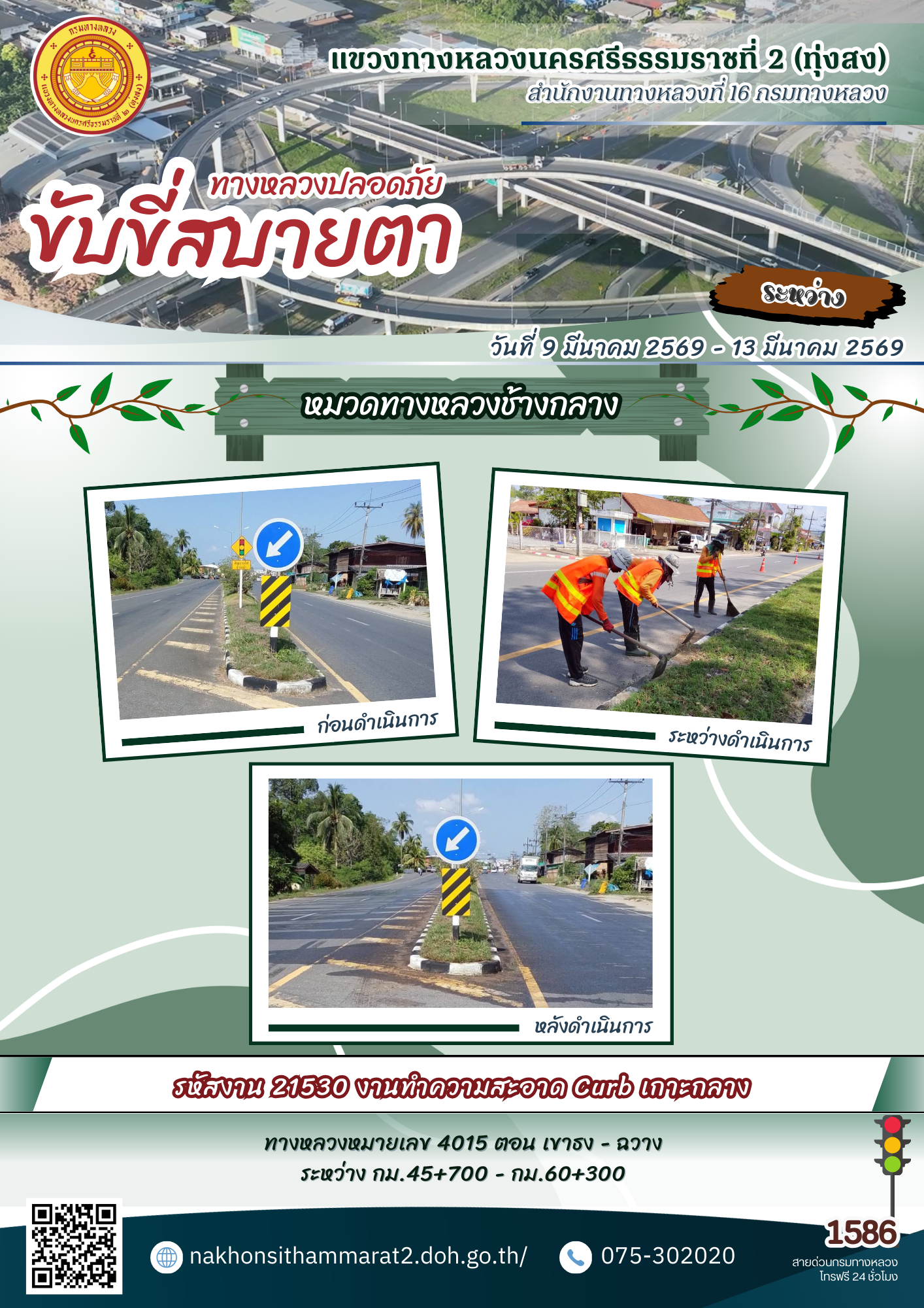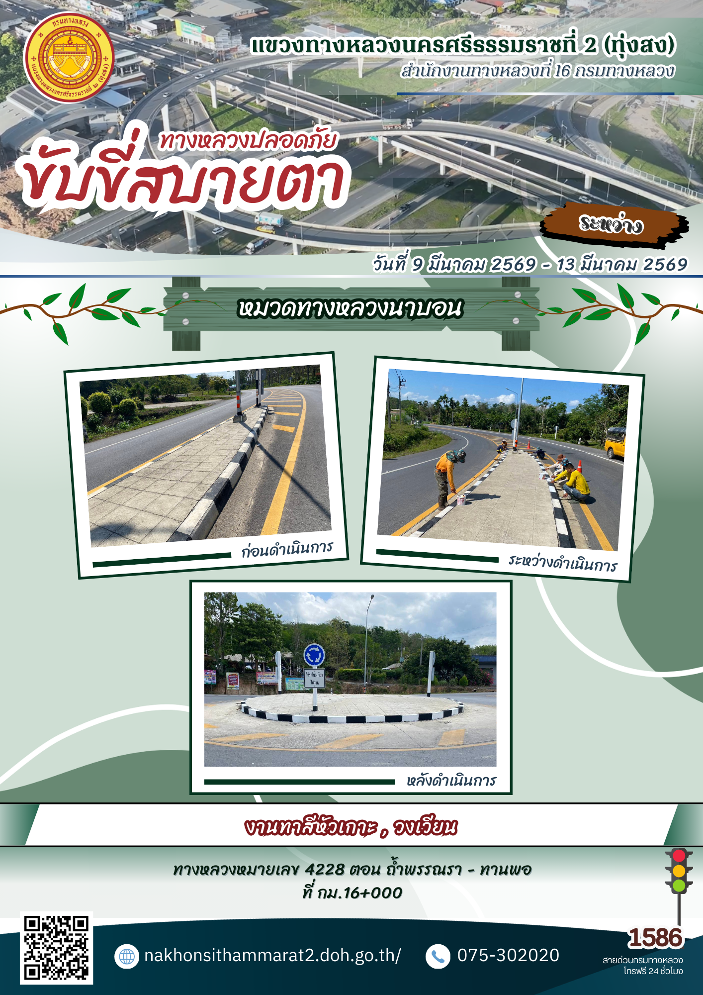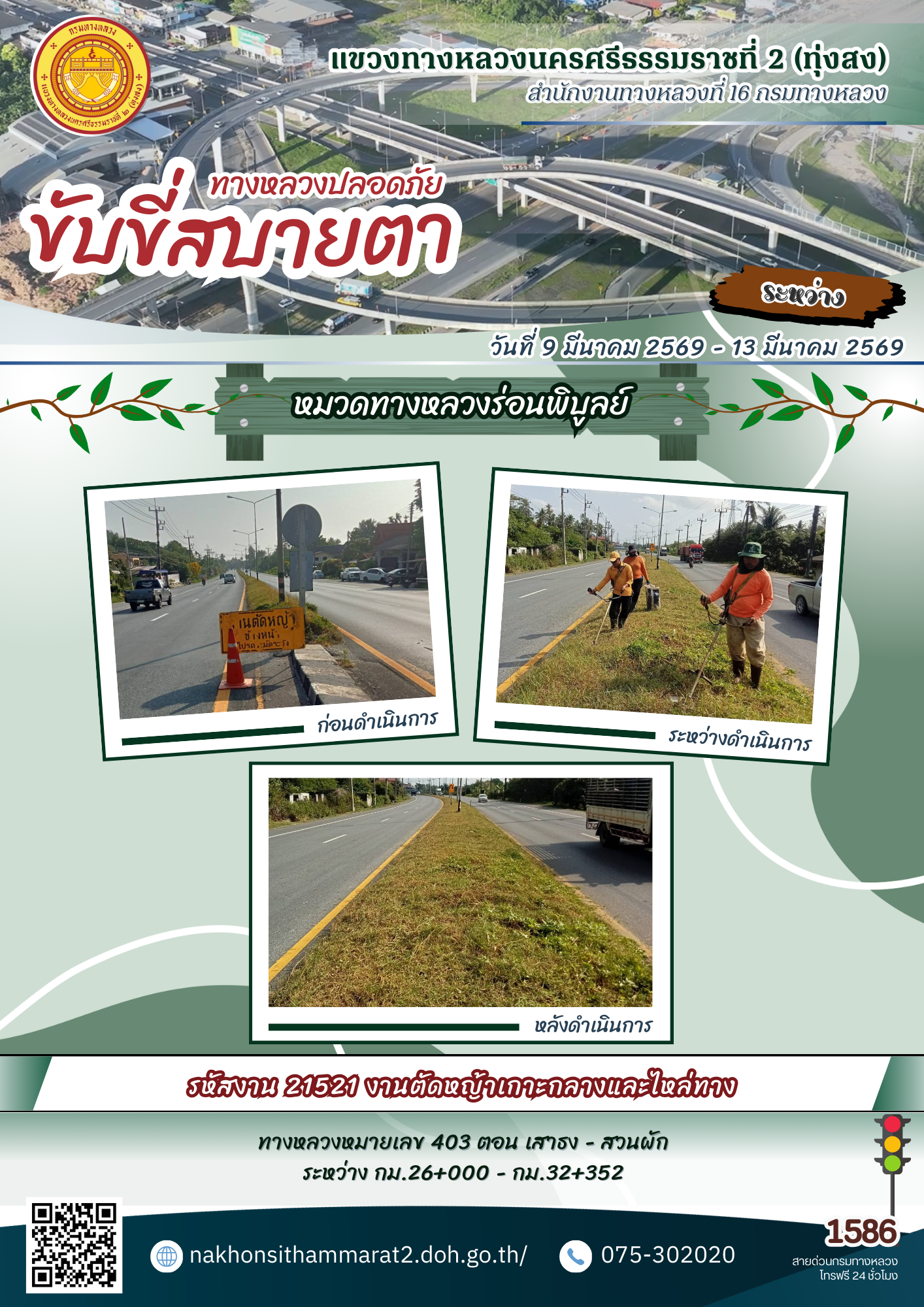 ผลการปฏิบัติงานของหมวดทางหลวงและหน่วยงานในสังกัด แขวงทางหลวงนครศรีธรรมราชที่ 2 (ทุ่งสง) ระหว่างวันที่ 9-13 มีนาคม 2569