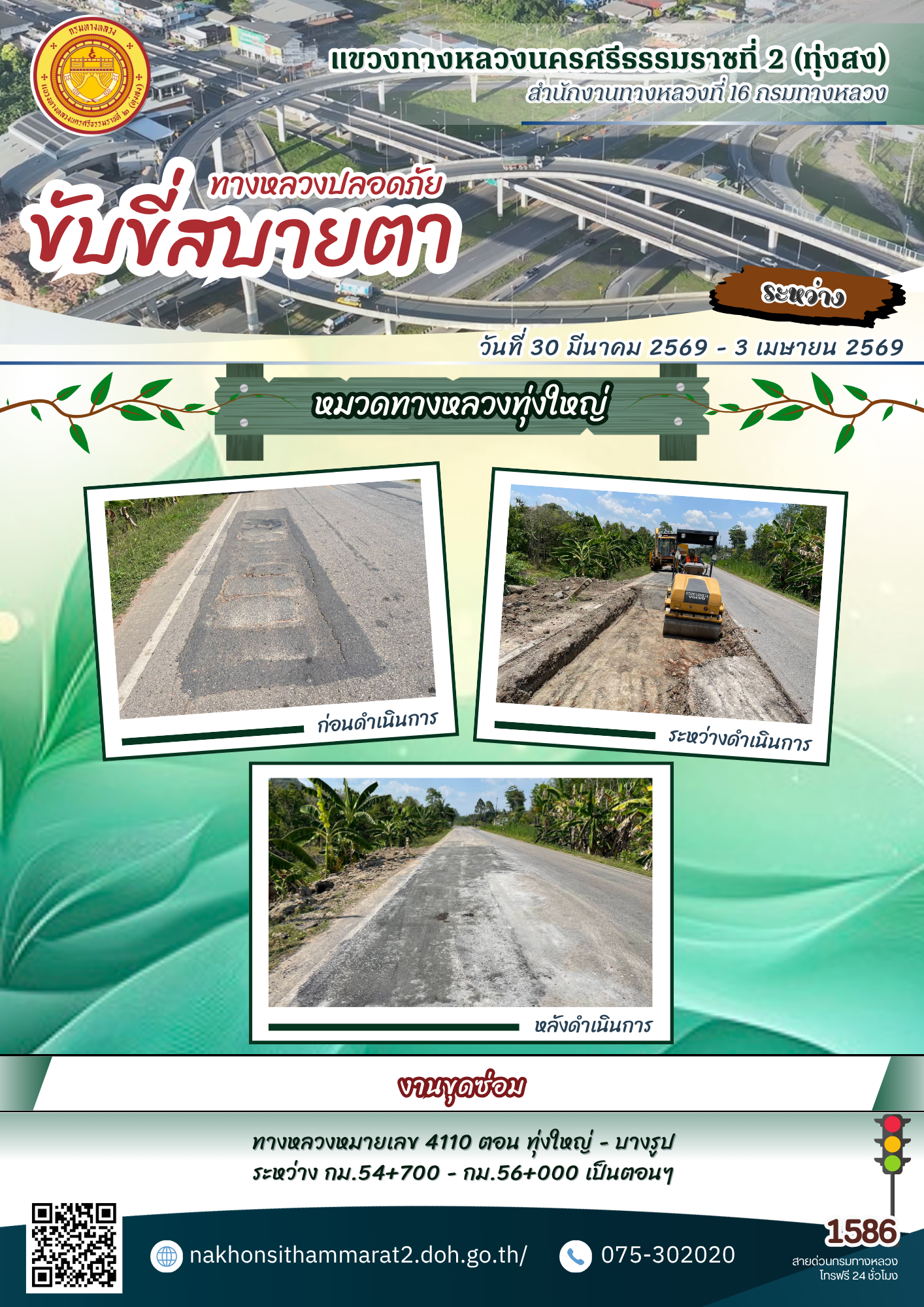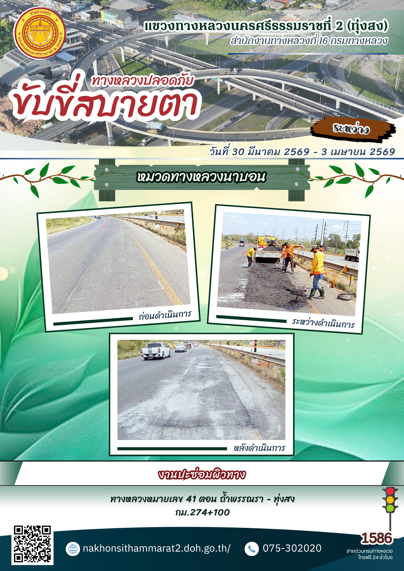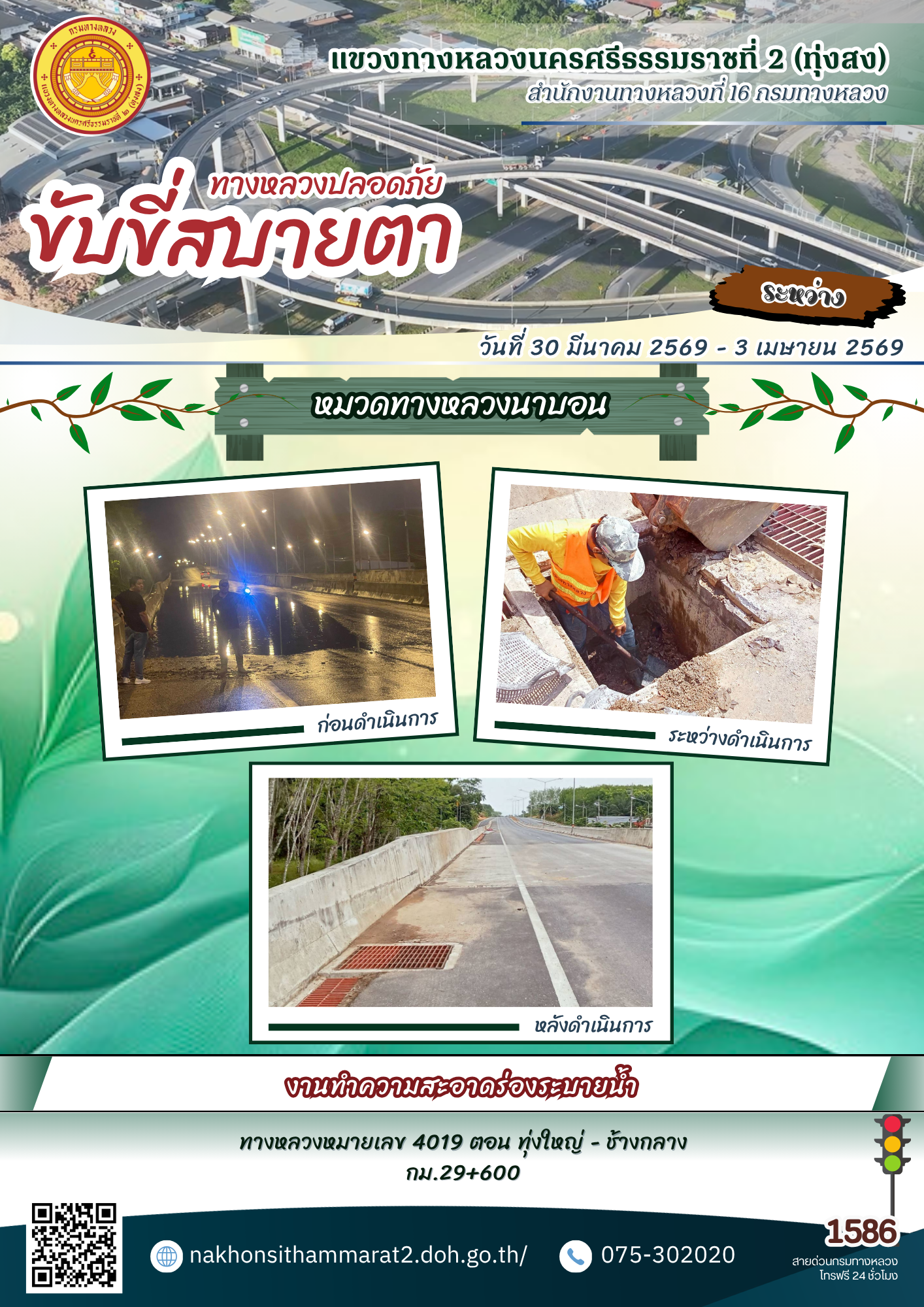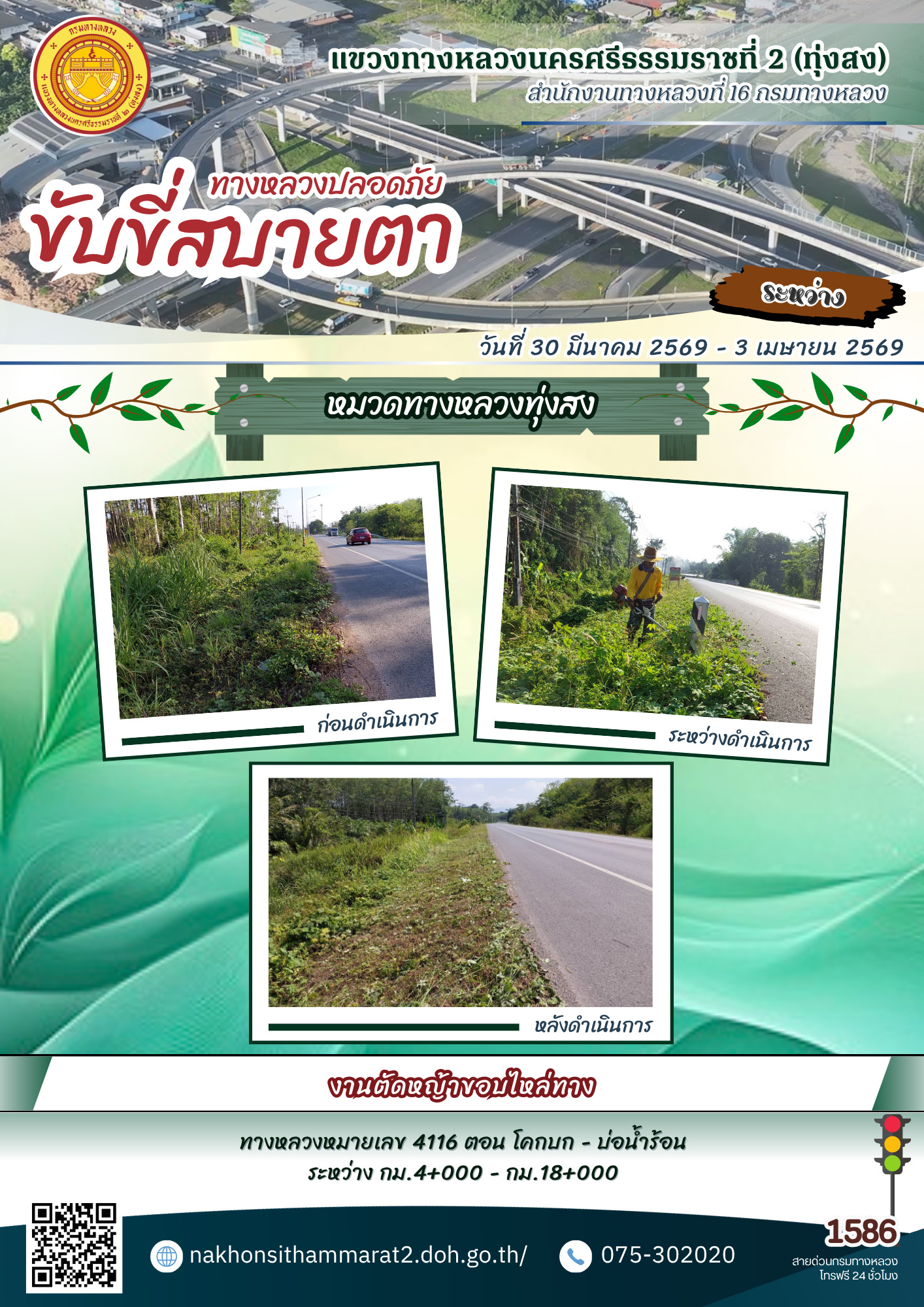 ผลการปฏิบัติงานของหมวดทางหลวงและหน่วยงานในสังกัด แขวงทางหลวงนครศรีธรรมราชที่ 2 (ทุ่งสง) ระหว่างวันที่ 30 มีนาคม - 3 เมษายน พ.ศ.2569