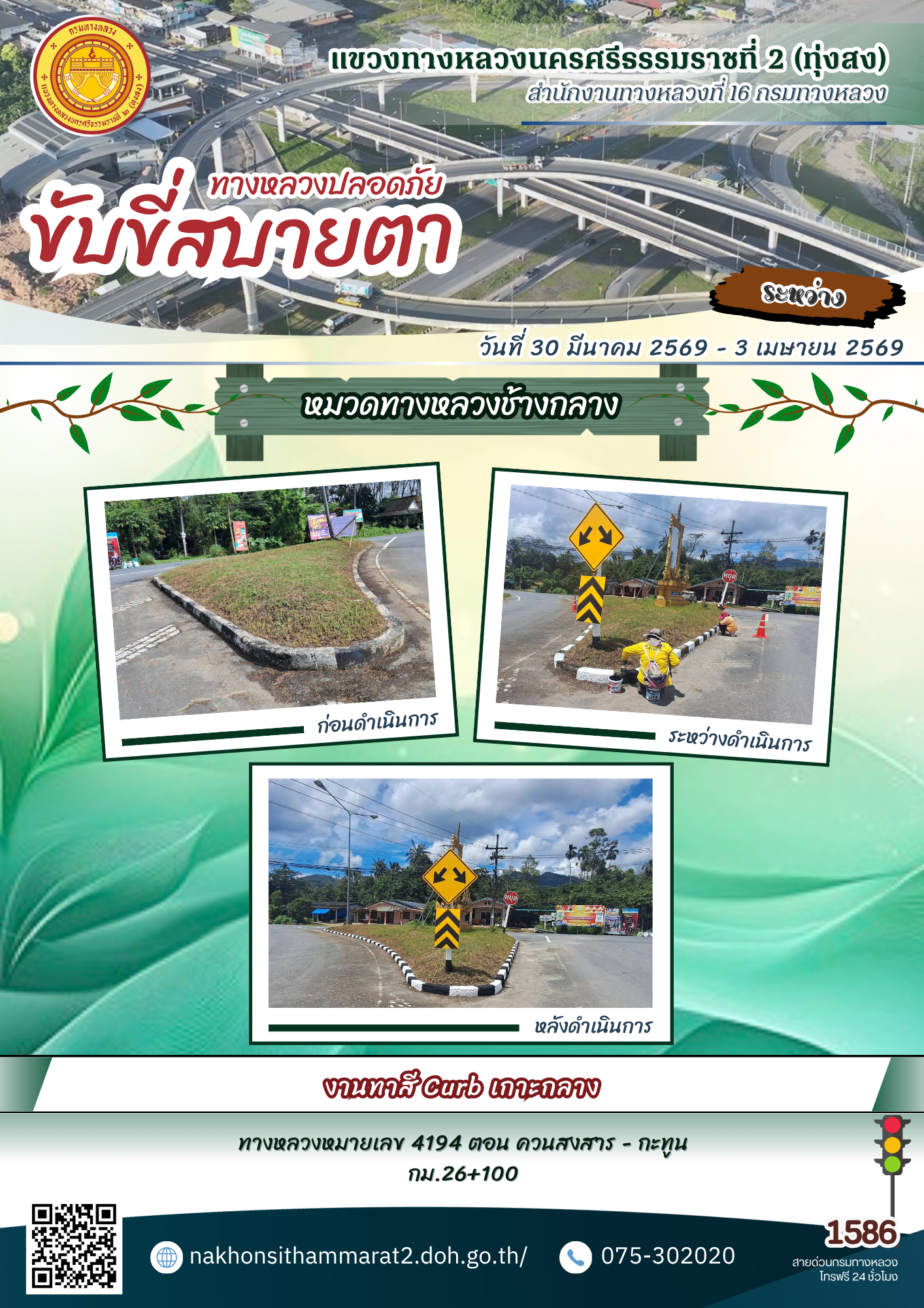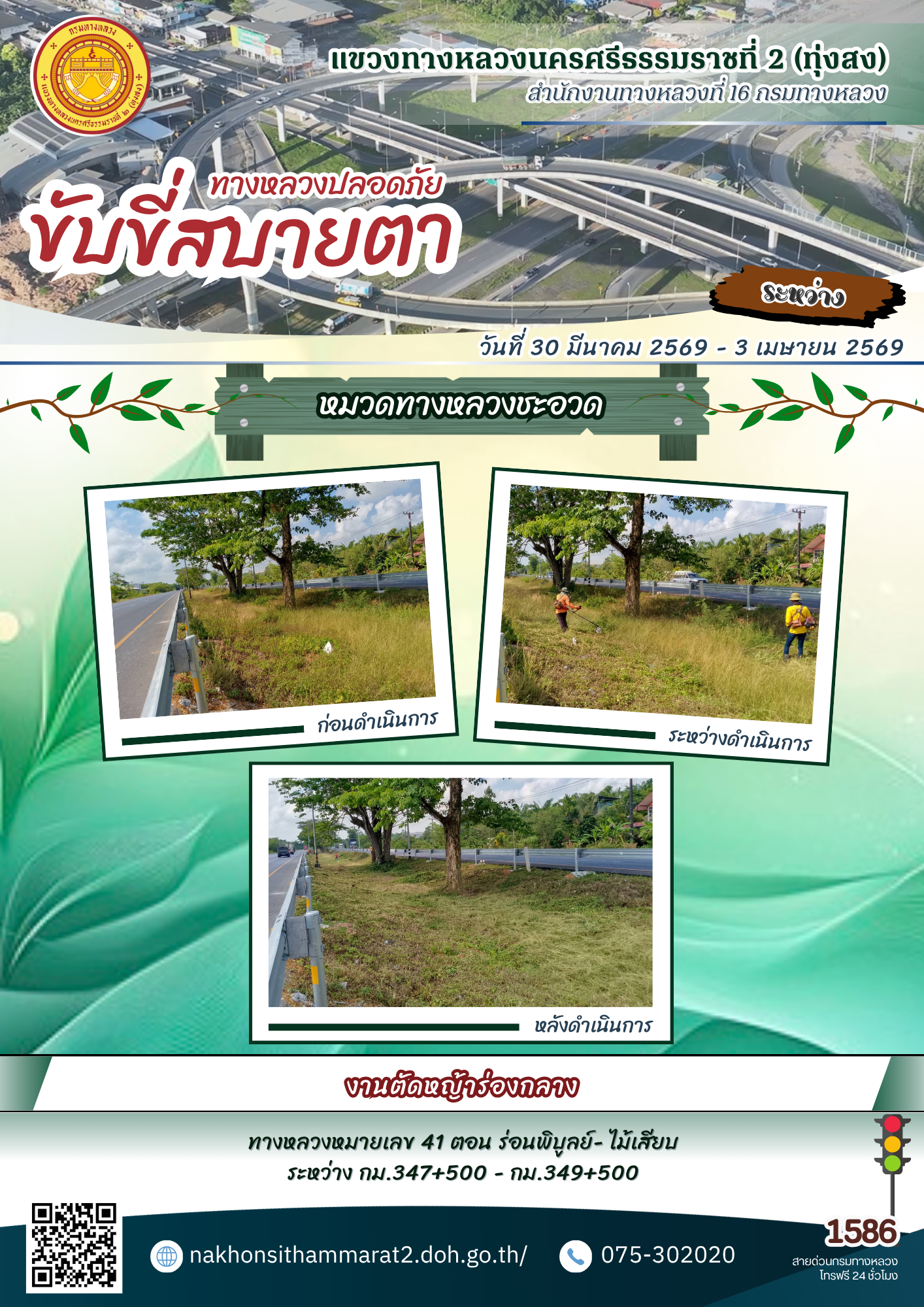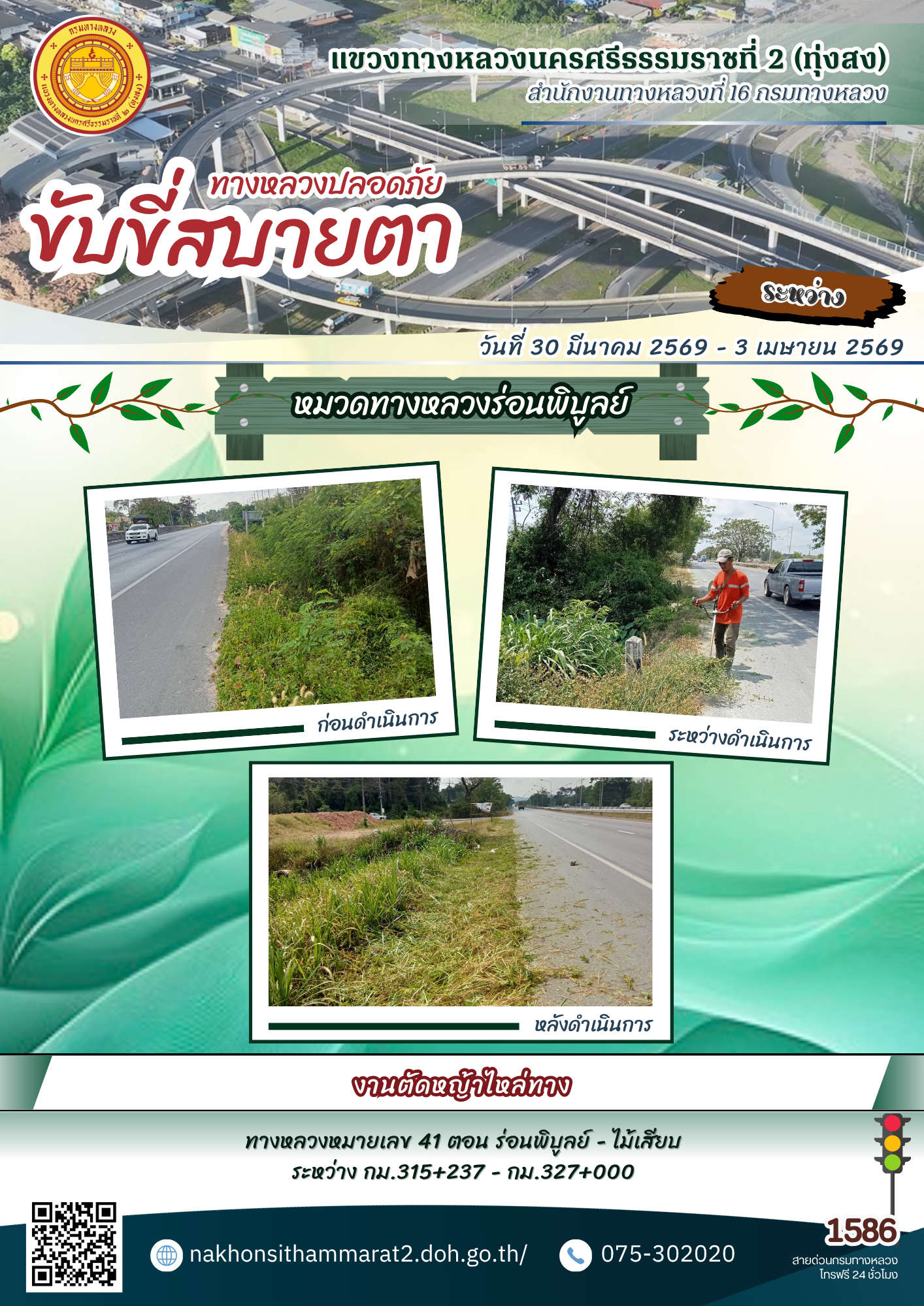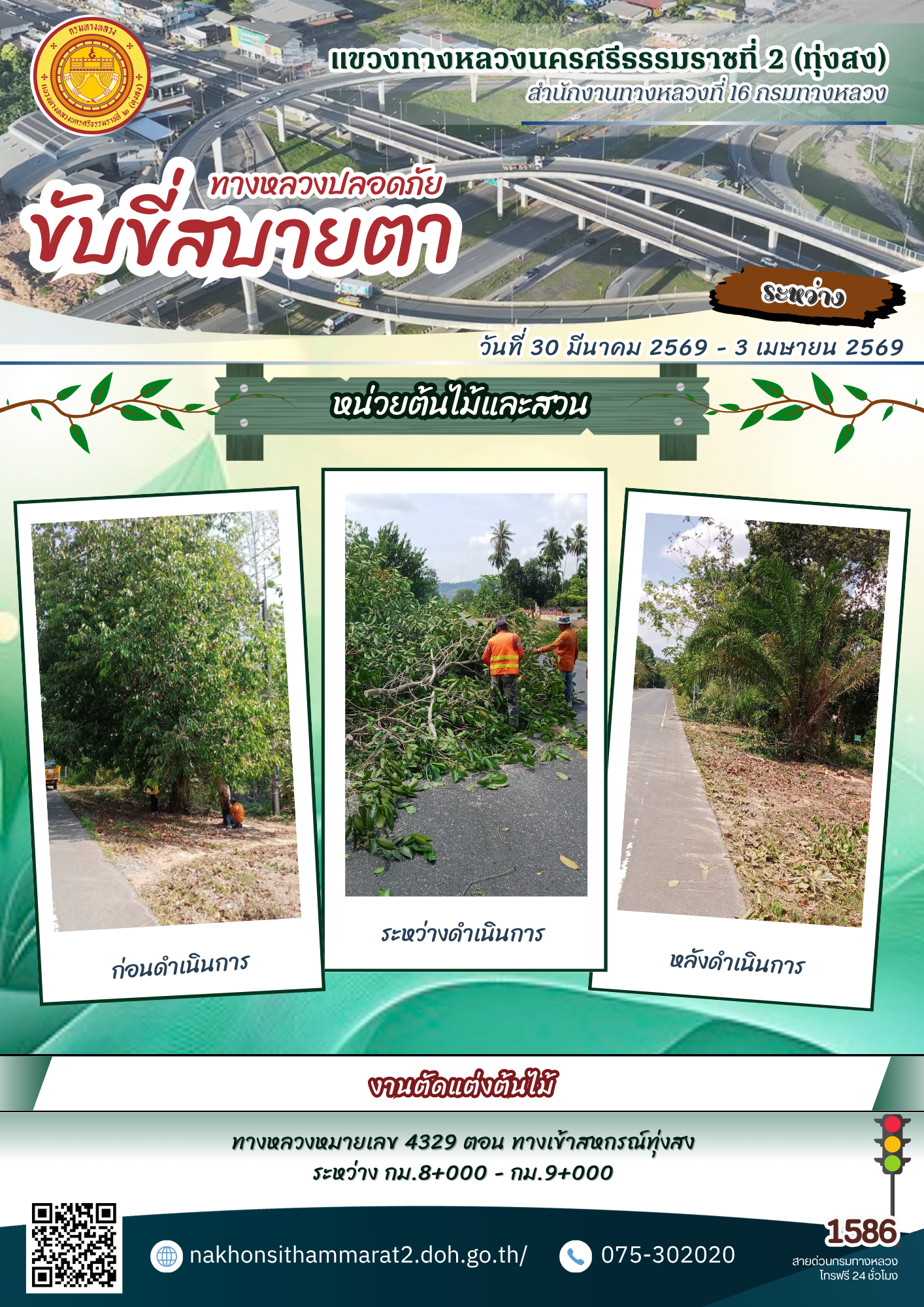 ผลการปฏิบัติงานของหมวดทางหลวงและหน่วยงานในสังกัด แขวงทางหลวงนครศรีธรรมราชที่ 2 (ทุ่งสง) ระหว่างวันที่ 30 มีนาคม - 3 เมษายน พ.ศ.2569