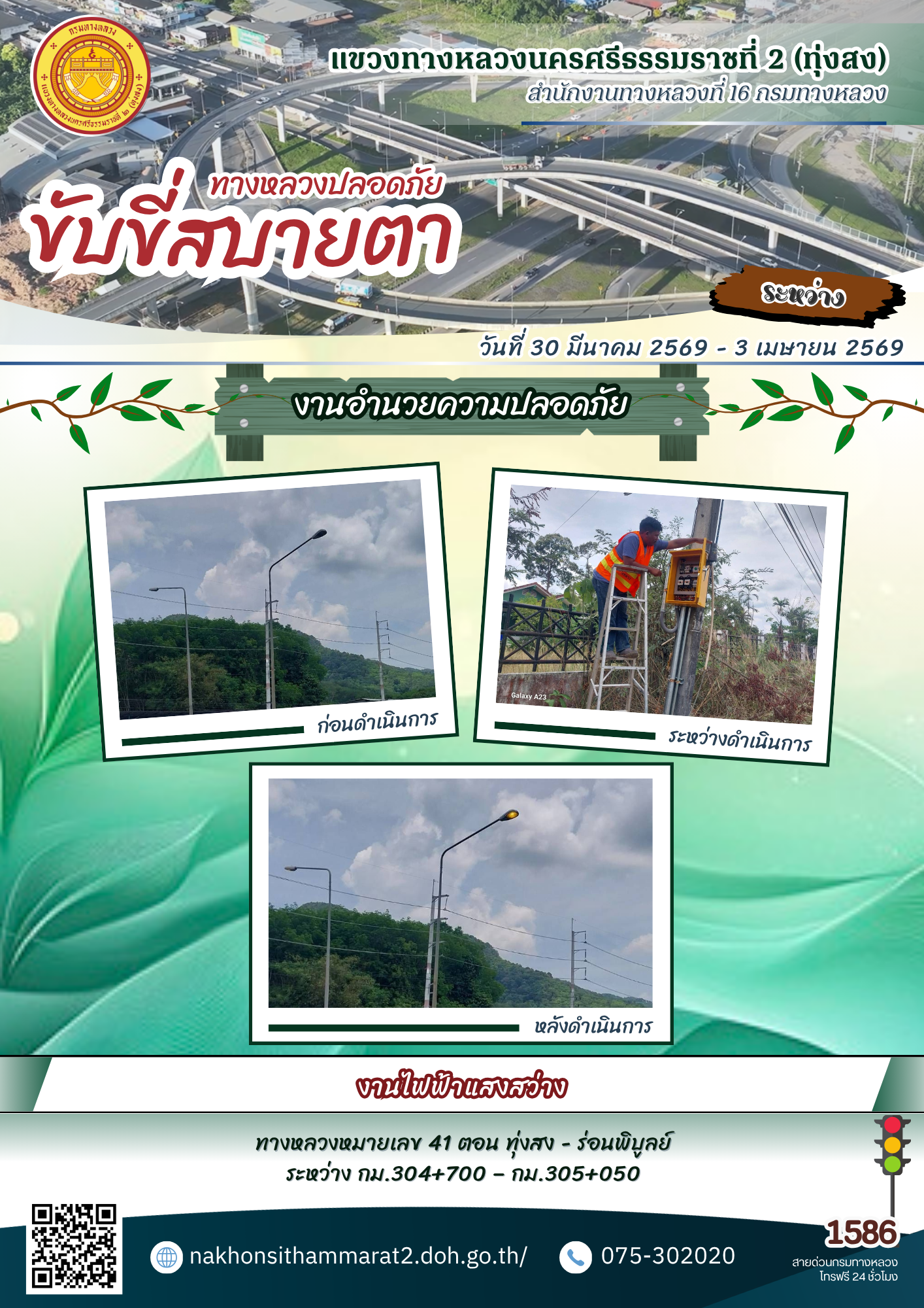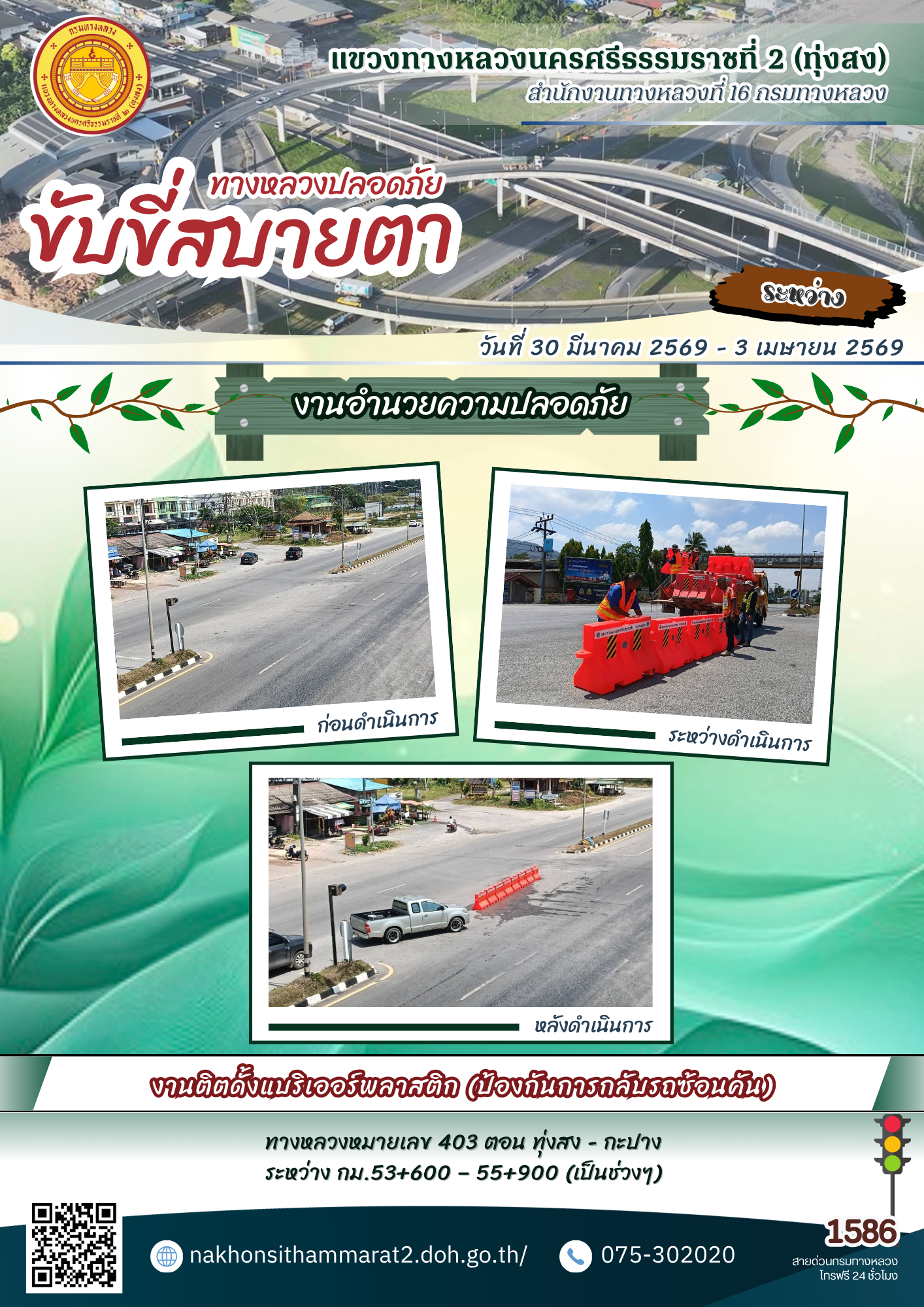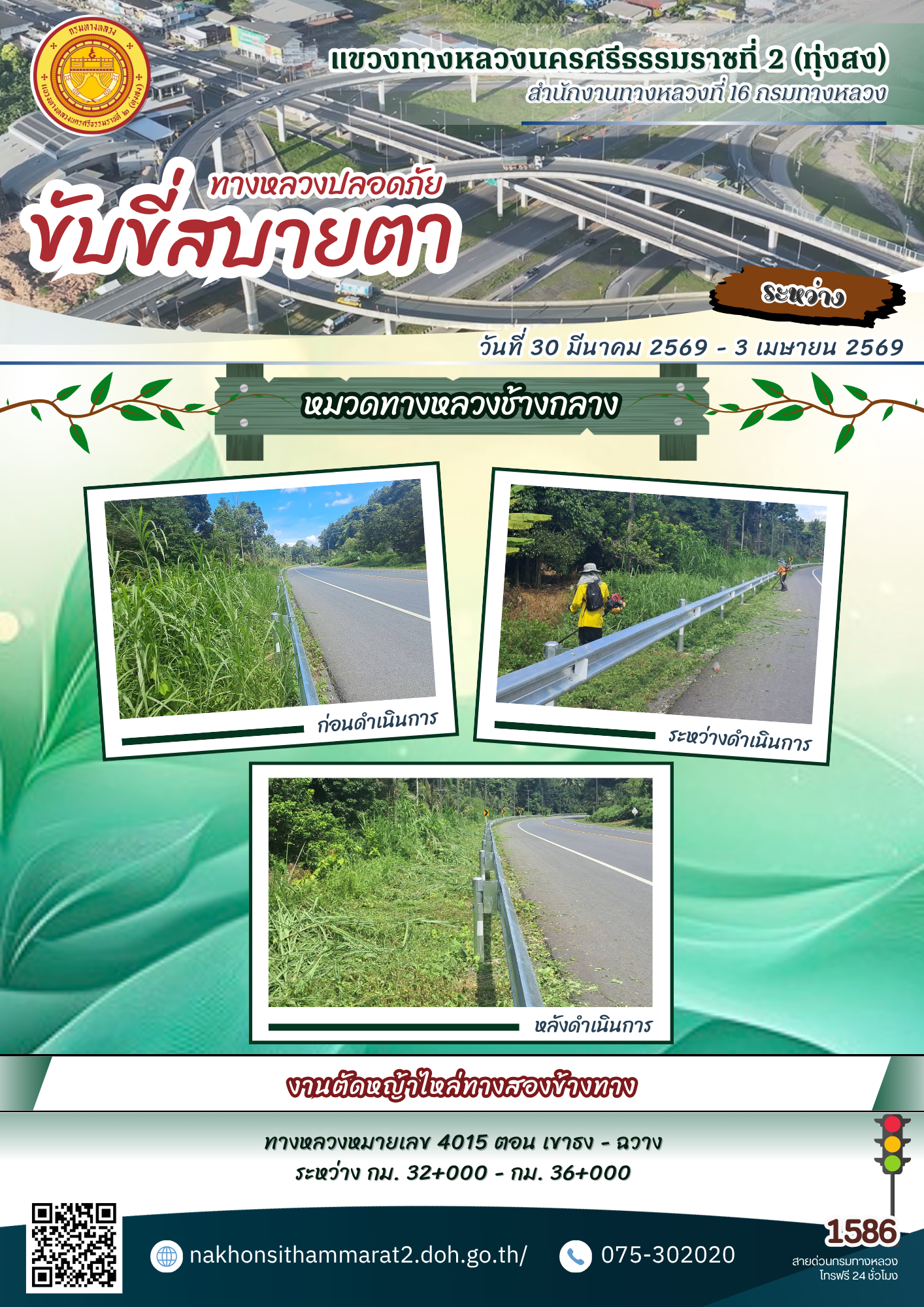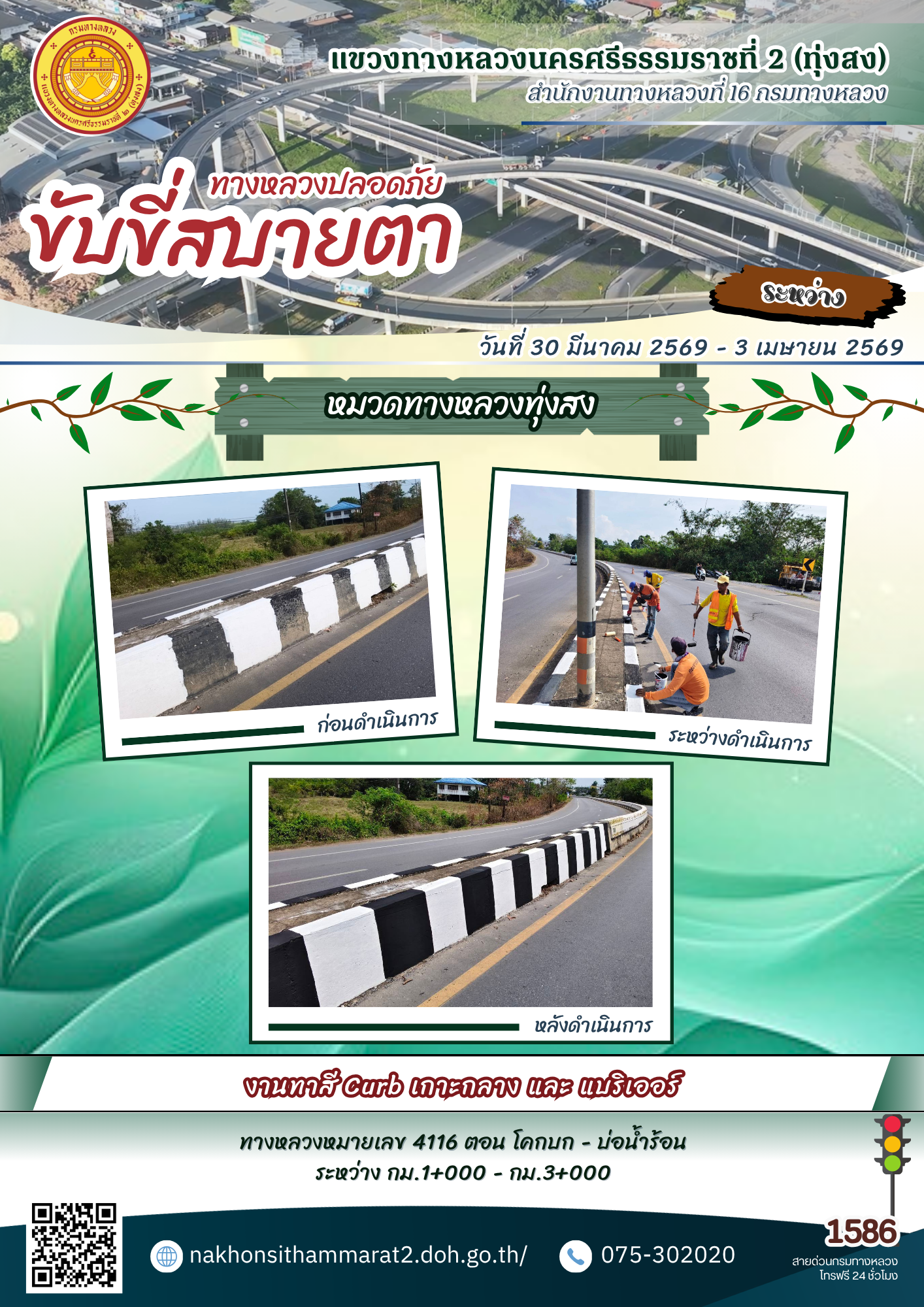 ผลการปฏิบัติงานของหมวดทางหลวงและหน่วยงานในสังกัด แขวงทางหลวงนครศรีธรรมราชที่ 2 (ทุ่งสง) ระหว่างวันที่ 30 มีนาคม - 3 เมษายน พ.ศ.2569
