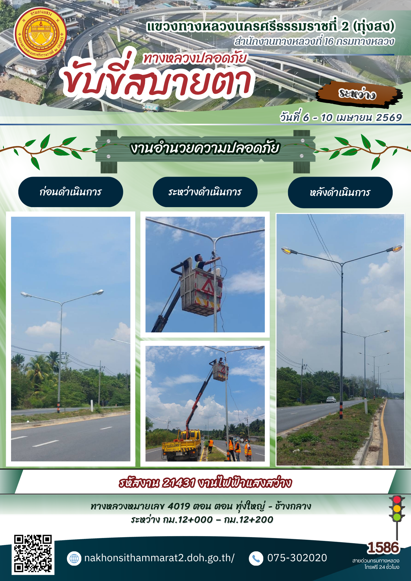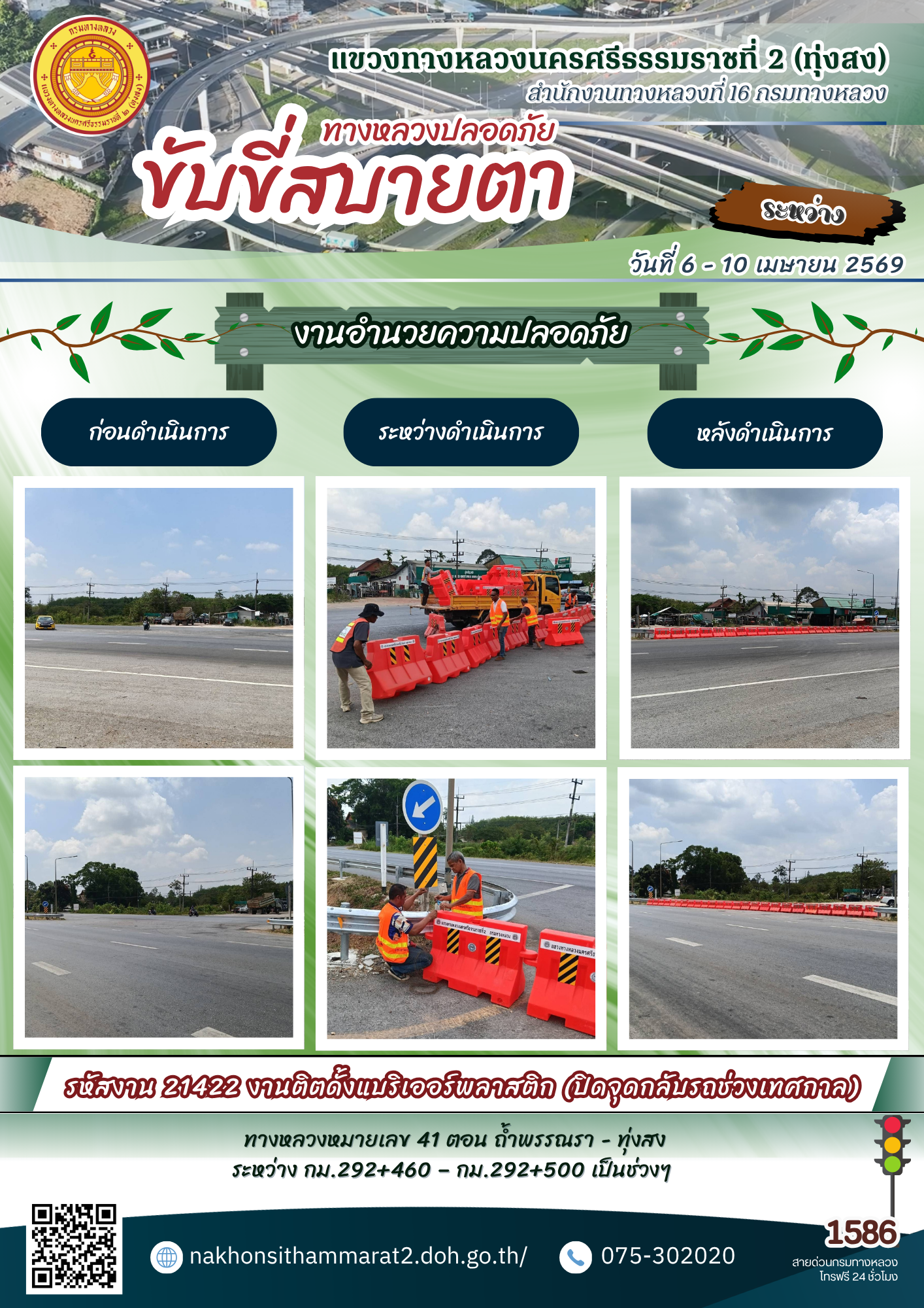 ผลการปฏิบัติงานของหมวดทางหลวงและหน่วยงานในสังกัด แขวงทางหลวงนครศรีธรรมราชที่ 2 (ทุ่งสง) ระหว่างวันที่ 6 - 10 เมษายน พ.ศ.2569
